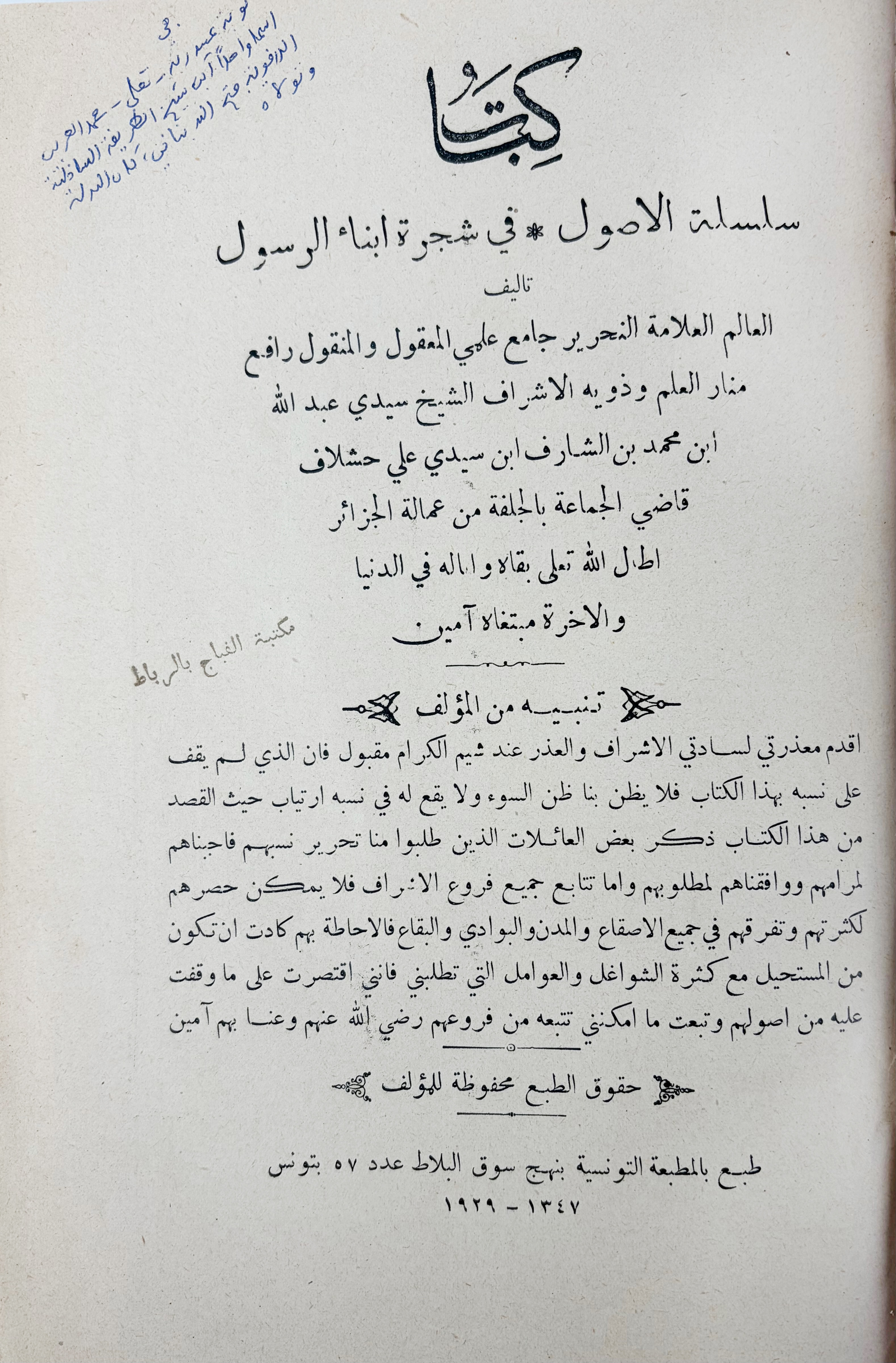 HASHLAF, Sidi Ali. Kitab silsilat al-usul fi shajarat abna al-rasul. (The Chain of Origins in the Family Tree of the Prophet’s Descendants). Tunis, Al-Matba'a al-Tunisiyya, 1347/1929. 168 pp. Mod. hcf. w. or. front cover bound up.