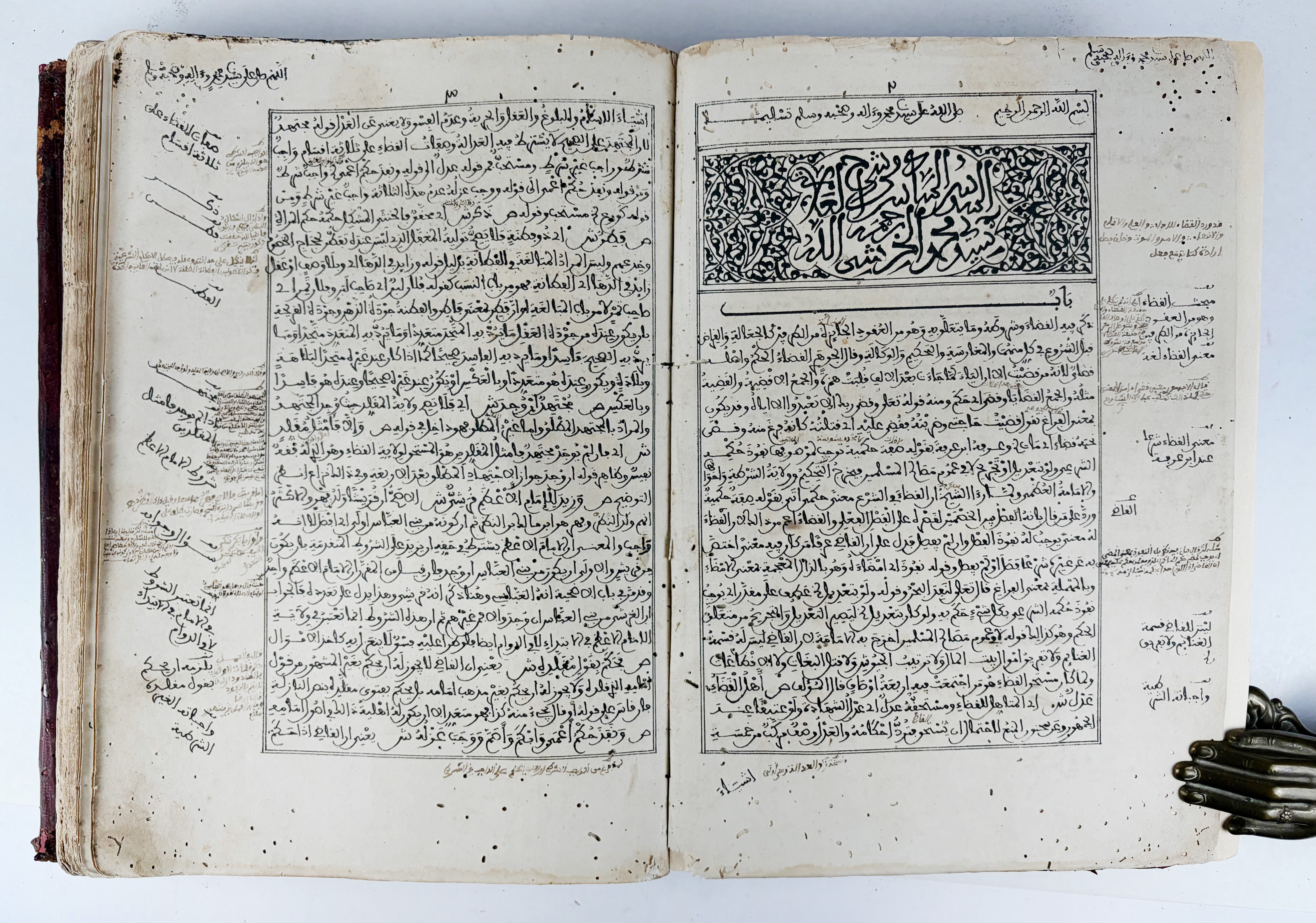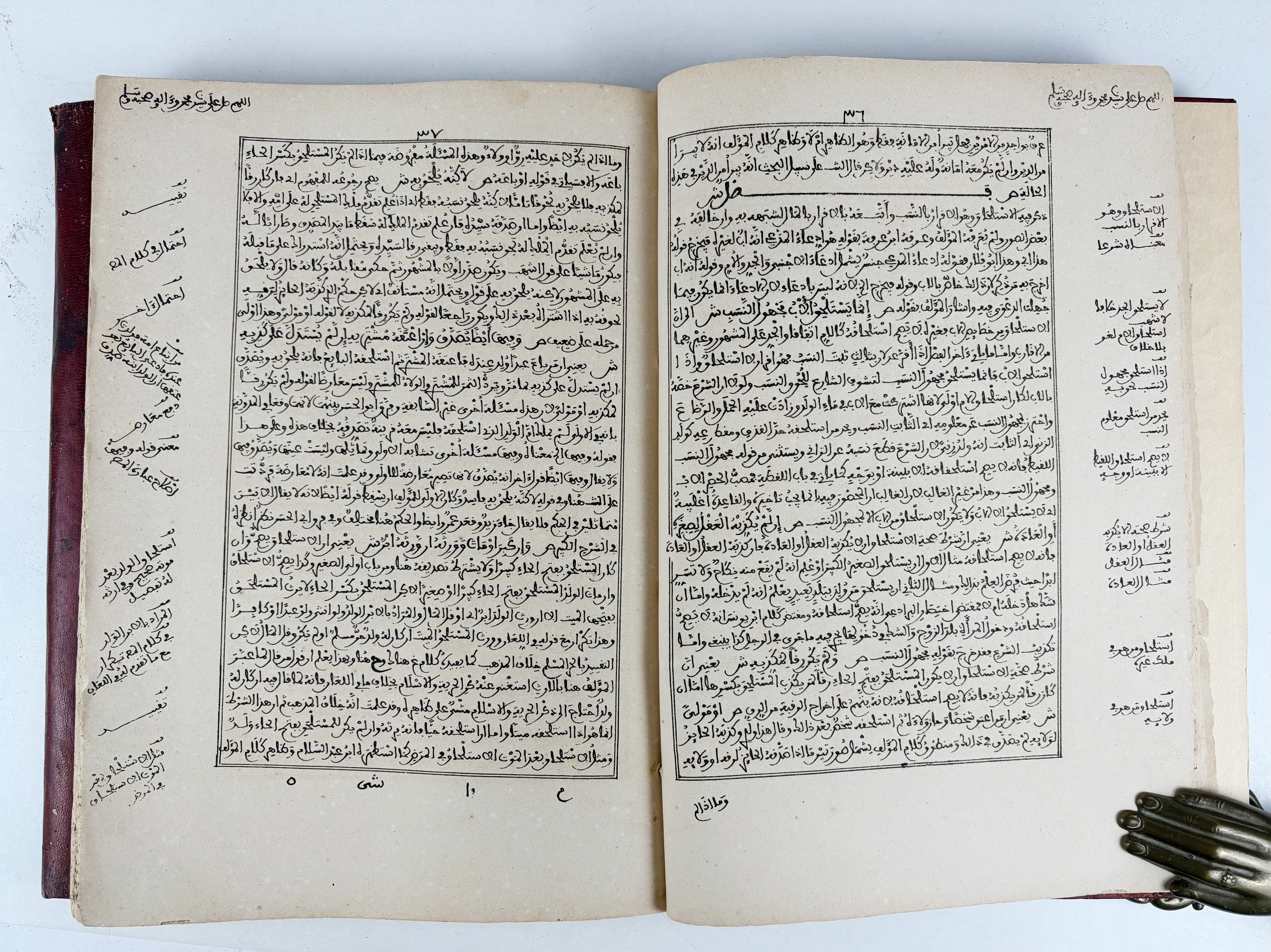 IBN 'ÂSIM AL-ANDALUSÎ. Tuhfa al-Hukkâm fi Nukat al-'Uqûd wa-l-Ahkâm ('The Gift to Judges on Points of Contracts and Legal Rulings'), with marginal glosses including Sharh al-Tuhfa of al-Bâjiyya. Cairo, c. 1870-90. 3 vols. Approx. 200 lvs. each, text in clear naskh lithograph, with copious marginalia printed in situ and further annotations in ink. 4° (30 x 21 cm). Cont. full red goatskin w. flap, traditionally blind-tooled w. gilt-stamped floral motifs at the corners and a central mandorla. (Binds. skilfully rep. in places, tiny wormholes espec. to vol. 1, some waterstains & w. num. annot. in an old hand to vol. 1).