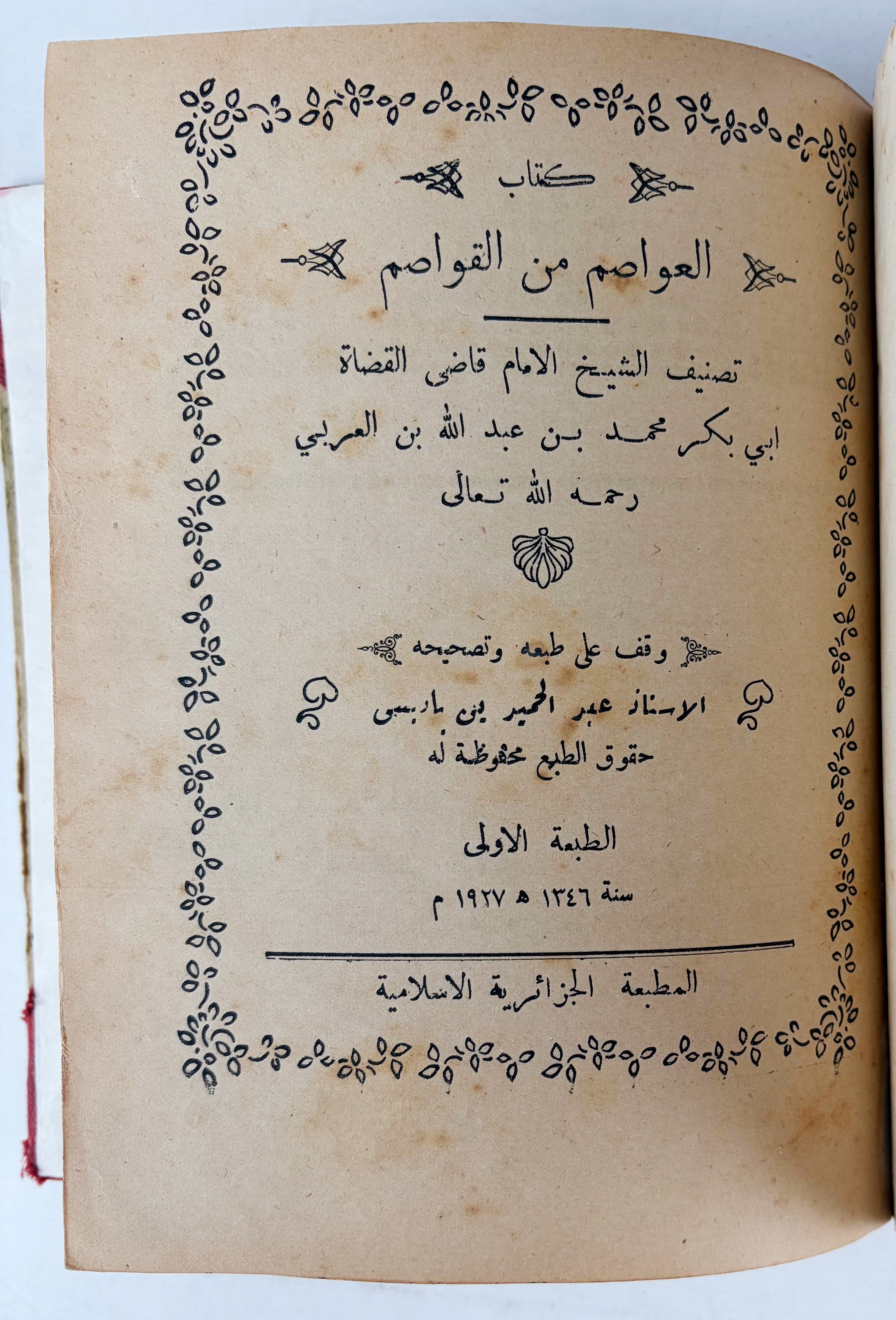 IBN AL-'ARABÎ, Abû Bakr Muhammad. Al-'Awâsim min al-qawâsim. Constantine, Al-Matba'a al-Jazâ'iriyya al-Islâmiyya, 1926. 2 in 1 vol. Old red calf-backed brds. (Spine a bit chafed, new endpapers, a few marg. repairs, paper a bit browned).