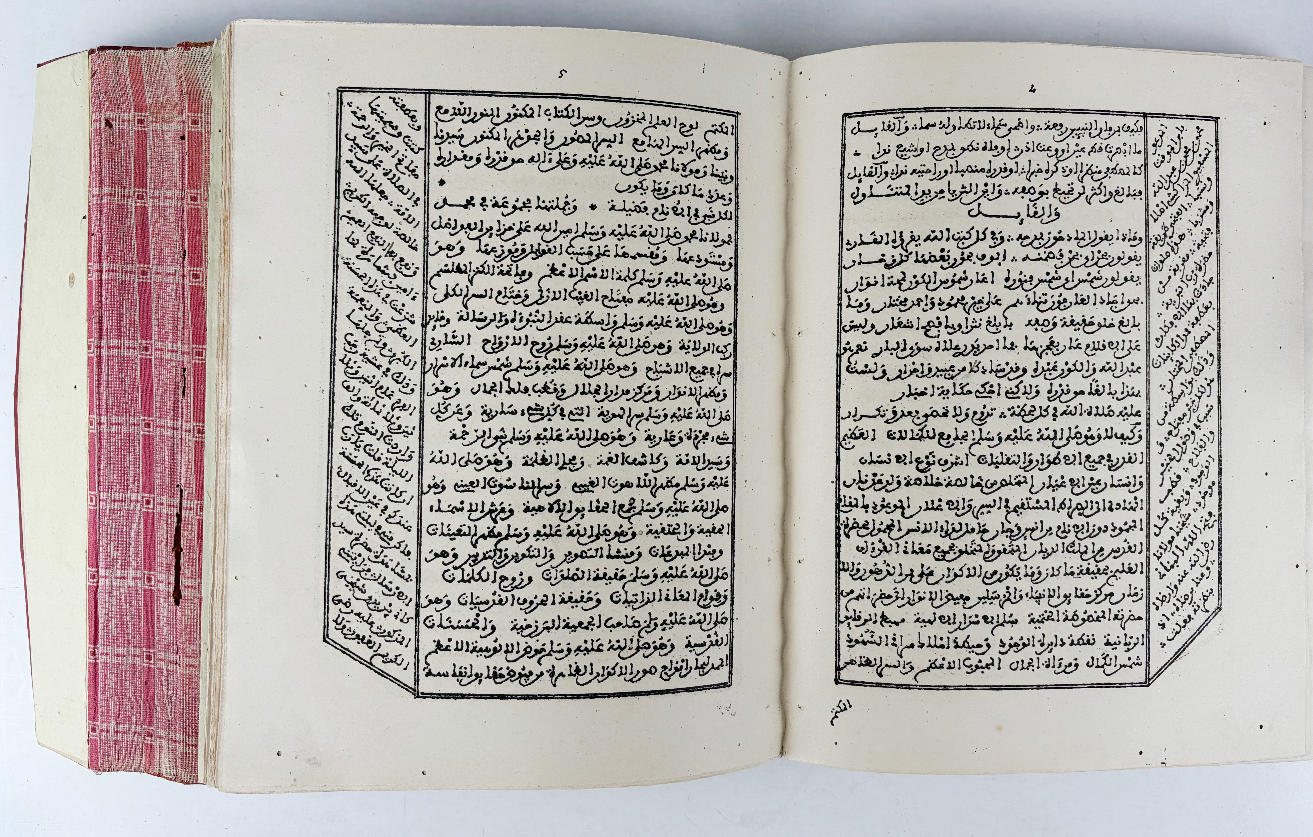 IBN AL-MUWAQQIT. Tatir al-anfas fi al-tarif bi-al-shaikh Abi al-Abbas. (In the margin: Izhar al-mahamid bi-al-tarif bi-maulana al-walid). - Bound with: Id. Ruh al-yaqin fi bad mazaya sayyid al-muttaqin. - (Marrakech, 1920). 2 in 1 vol. Lithogr. Arabic text (tab'a hajriyya). Sm-4°. Cont. full blindtooled red goatskin bind. w. flap. (Extremities a bit chafed/worn, tiny wormholes throughout, new endpapers).