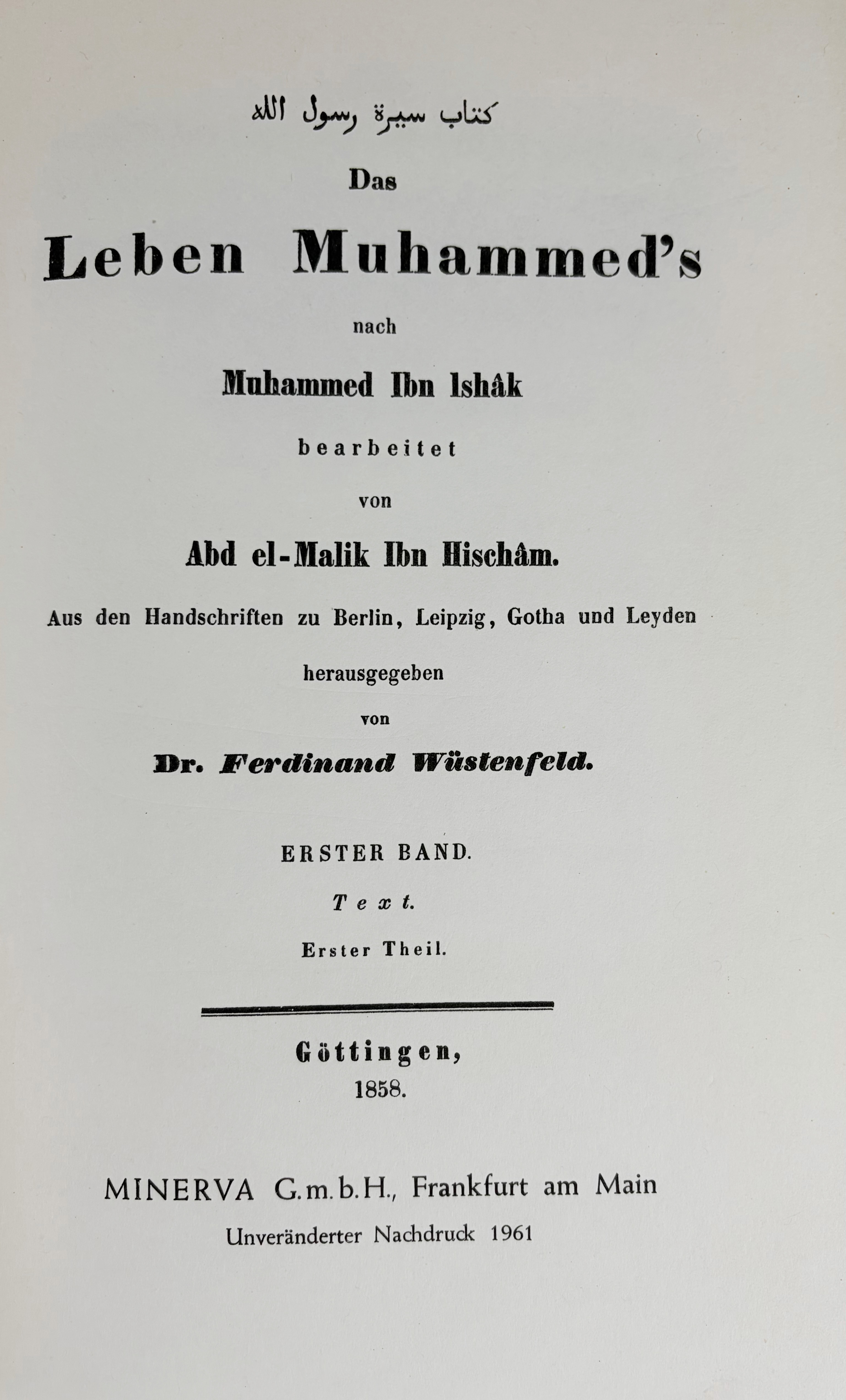ISHÂK, Muhammed Ibn. Das Leben Muhammed's. Bearb. v. Abd el-Malik Ibn Hischâm. Aus den Hs. zu Berlin, Leipzig, Gotha und Leyden hrsg. v. F. Wüstenfeld. (Nachdr. Ausg. 1858-60). Frankfurt, Minerva, 1961. 3 in 2 vols. Or. orange cl. (Spine ends sl. worn).