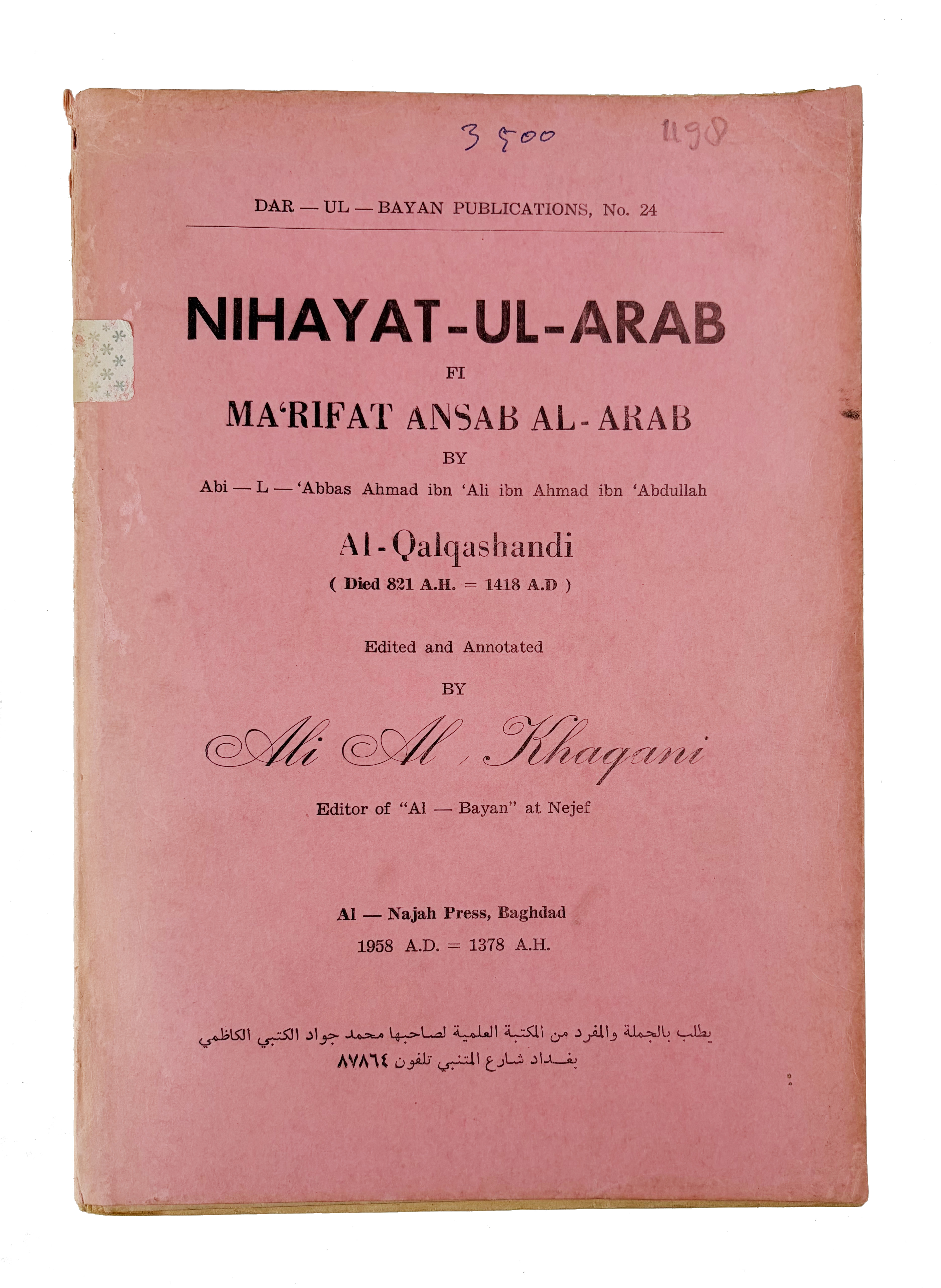 ISLAMIC HISTORY -- IBN AL-KALBI, Hisham ibn Muhammad. Jamharat al-Nasab (The Abundance of Genealogy/The Collection of Genealogies). Damascus, Dar al-Yaqaza al-Arabiyya, 1986. 3 vols. Arabic text, printed in red and black. Fol. Or. pictorial brds. (Some minor shelf wear, incl. light bumping). -- AL-QALQASHANDÎ. Nihâyat al-arab fî ma'rifat ansâb al-'arab. Baghdad, 1958. Arabic text. Owrps. (Sl. age-toned). -- (4).