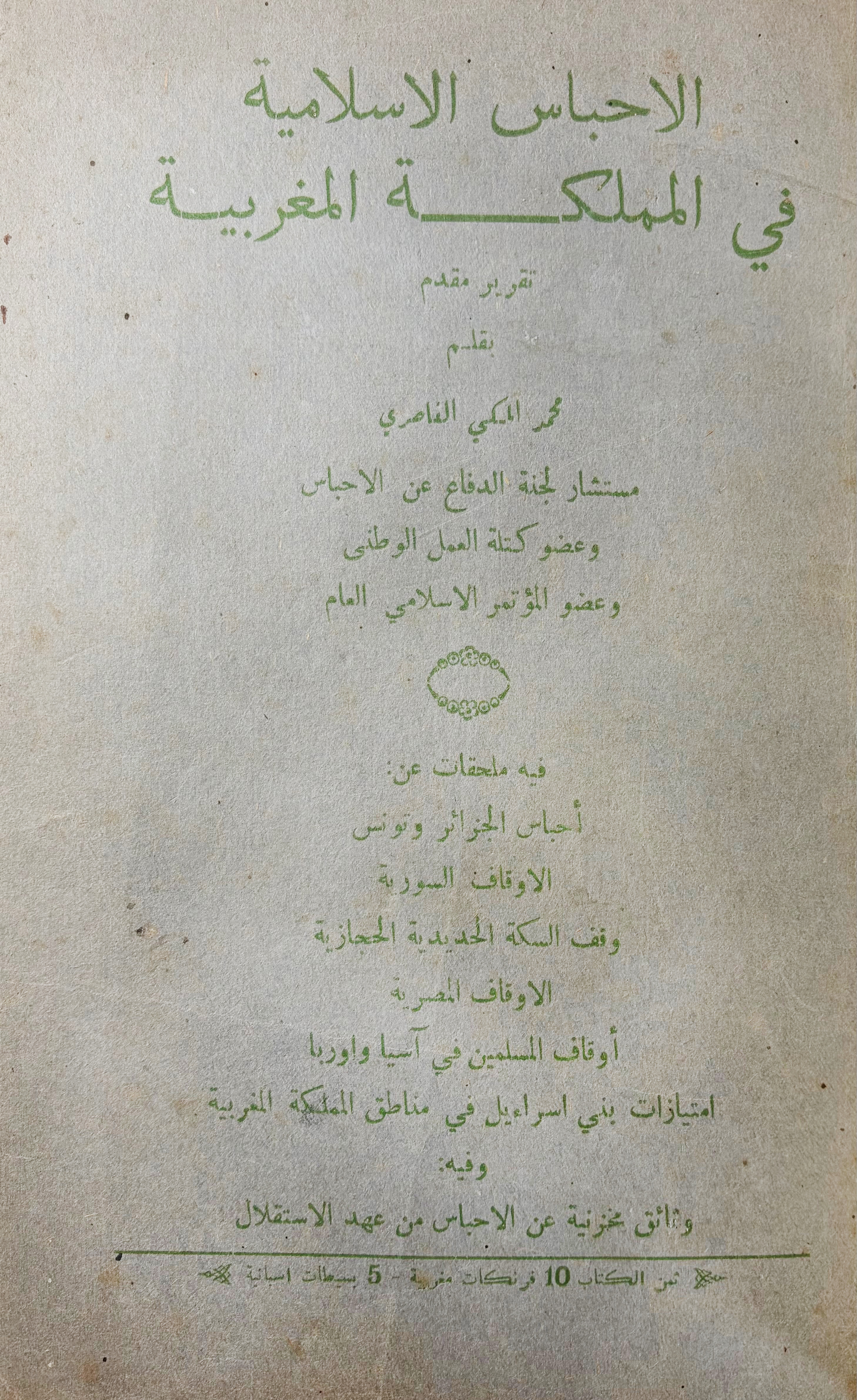 MAGHREB -- AL-NASIRI, Muhammad al-Makki. Al-Ahbas al-Islamiyya fi al-Mamlaka al-Maghribiyya. (Islamic Religious Endowments in the Kingdom of Morocco). (Tetouan, 1935). (16), 174 pp. Mod. green hcf. extra w. or. front cover bound up.