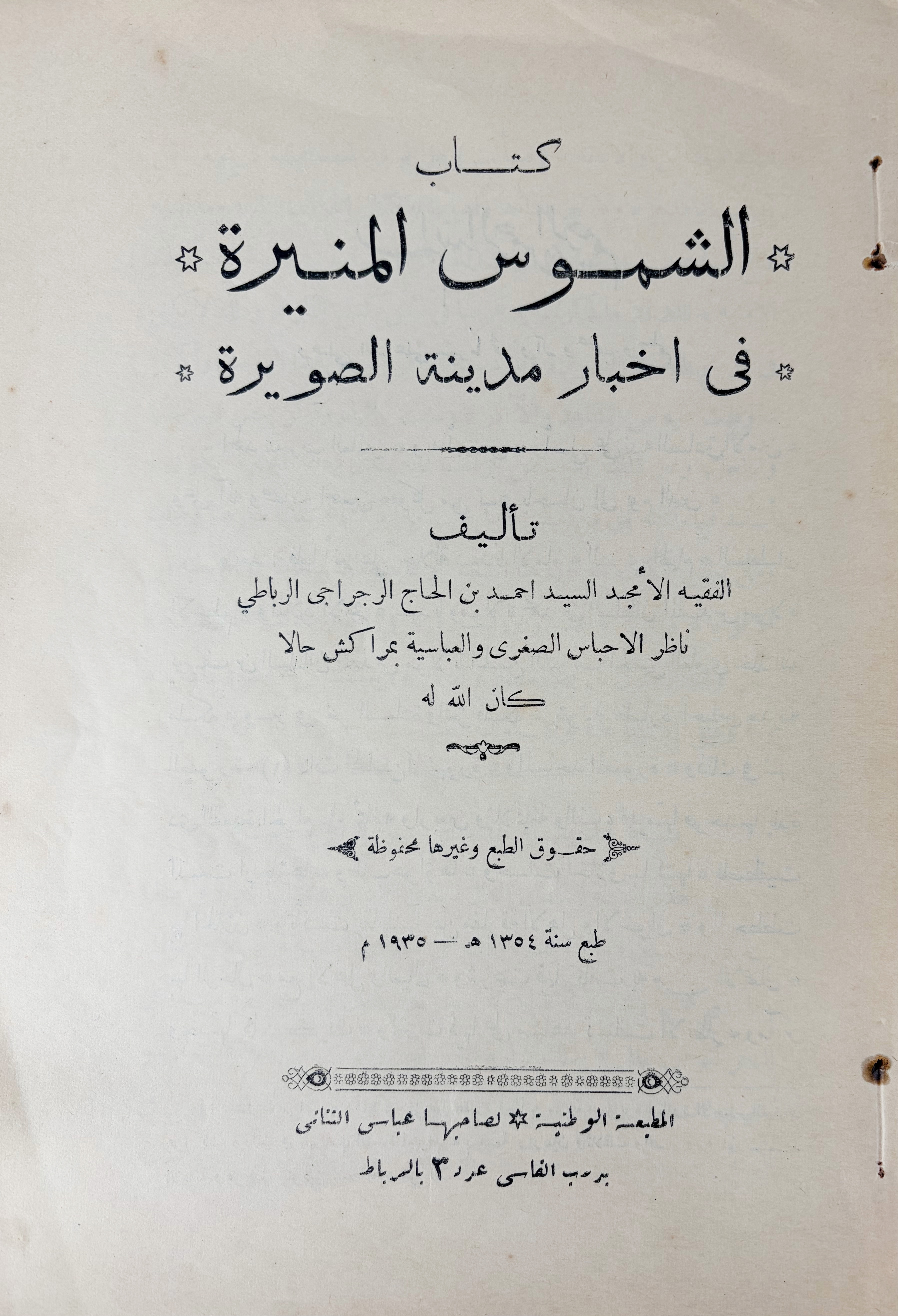 MAGHREB -- ESSAOUIRA -- AL--RAJRAYI, Ahmad ibn al-Hajj. Kitab al-Shumus al-Munira fi Akhbar Madinat al-Suwayra. [The Radiant Suns: A History of the City of Essaouira]. Rabat, Al-Matba'at al-Wataniyya, 1354/1935. 93, (15) pp. Or. printed wrps. (Wrps. detached from the text block, staples have perished, spine sl. dam.).