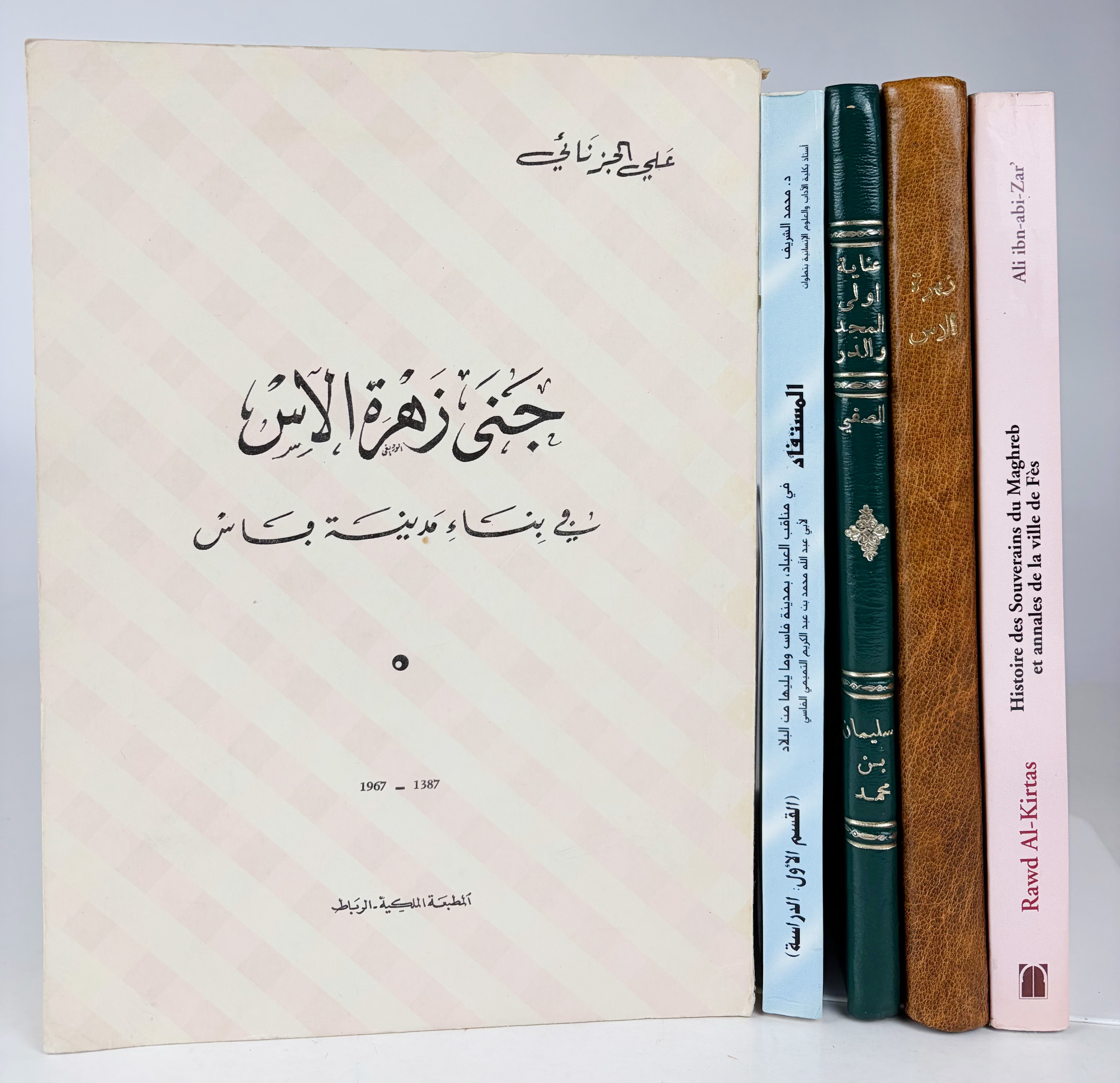 MAGHREB -- FEZ -- AL-FASI, Sulayman ibn Muhammad. Inayat uli al-majdbi-dhikr al al-Fasi ibn al-Jadd. Contains also: Ibn al-Tayyib al-Qadiri: Manzumat al-Durr al-Safi fi wasf ma abda al-jamal al-yusufi. Fez, 1347/1928-29. 8, 108 pp. Lithogr. Arabic text. Mod. h. mor. w. owrps. bound up. (First leaf w. stain and repaired tear). -- ABU AL-HASAN 'ALI AL-JAZNAI. Zahrat el-âs (La fleur du myrte). Traitant de la fondation de la ville de Fès. Texte arabe et trad. annot. p. A. Bel. 1922/23. Mod. hcf. w. (dam./plasticized) owrps. bound up. -- And 3 o. on Fez. (5).