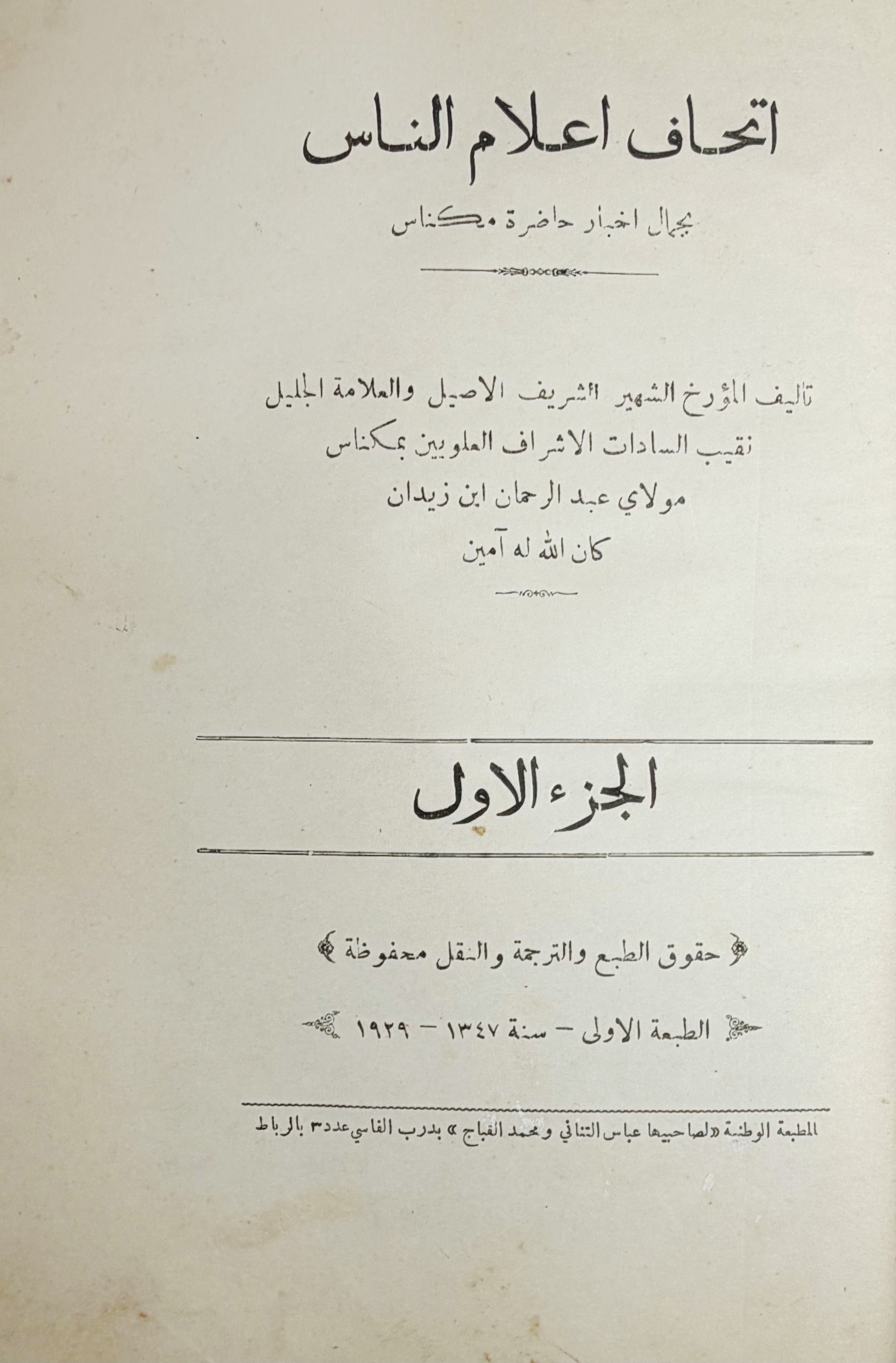 This monumental work is the definitive historical and biographical encyclopedia of the city of Meknes, Morocco. The author, a member of the Alaouite royal family and official state historian, had unprecedented access to the royal archives. The volumes contain a wealth of primary source documents, royal decrees, and extensive biographies of sultans, scholars, and local notables, with a particular focus on the reign of Sultan Moulay Ismaïl. - Rare original edition.€ 400