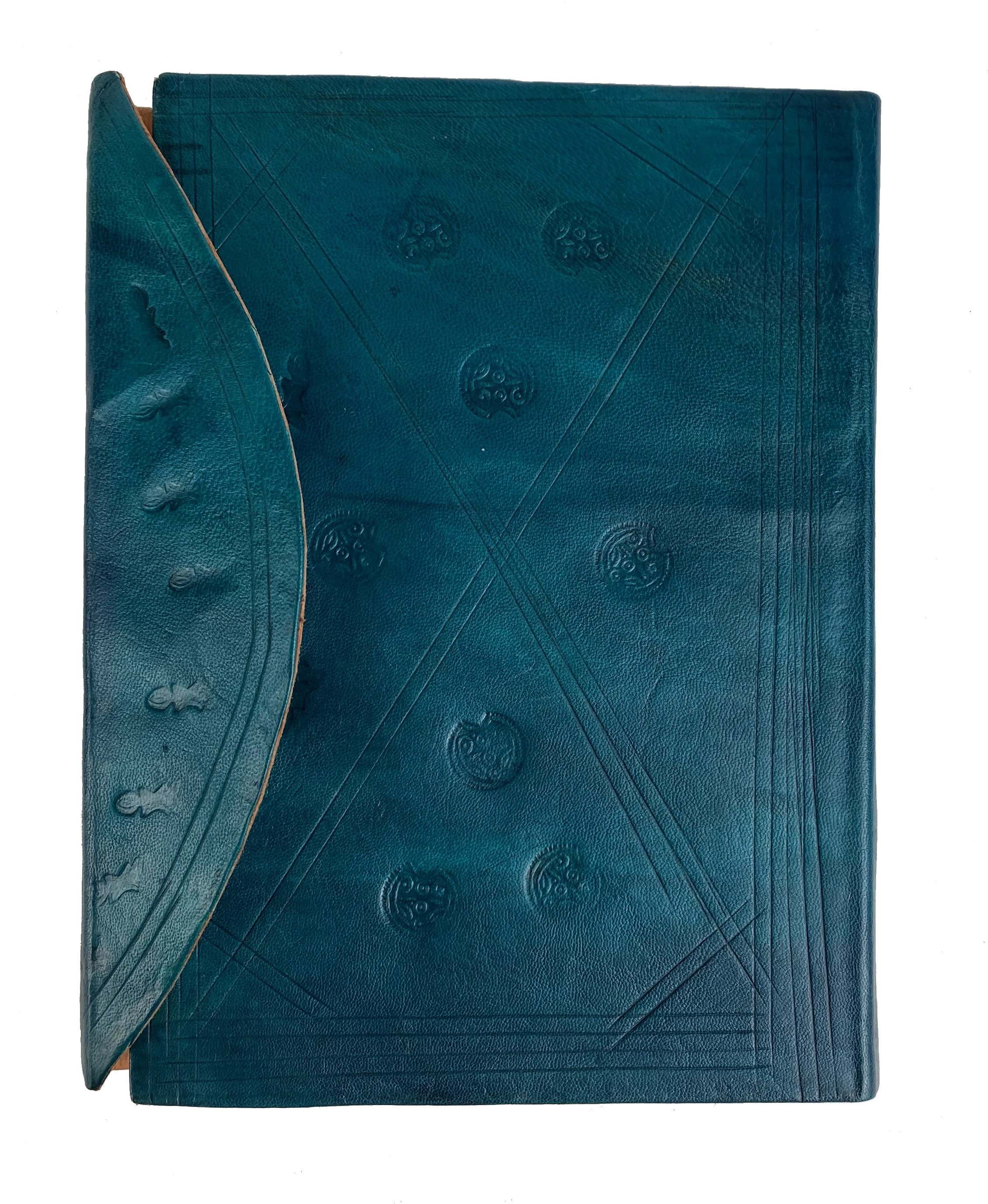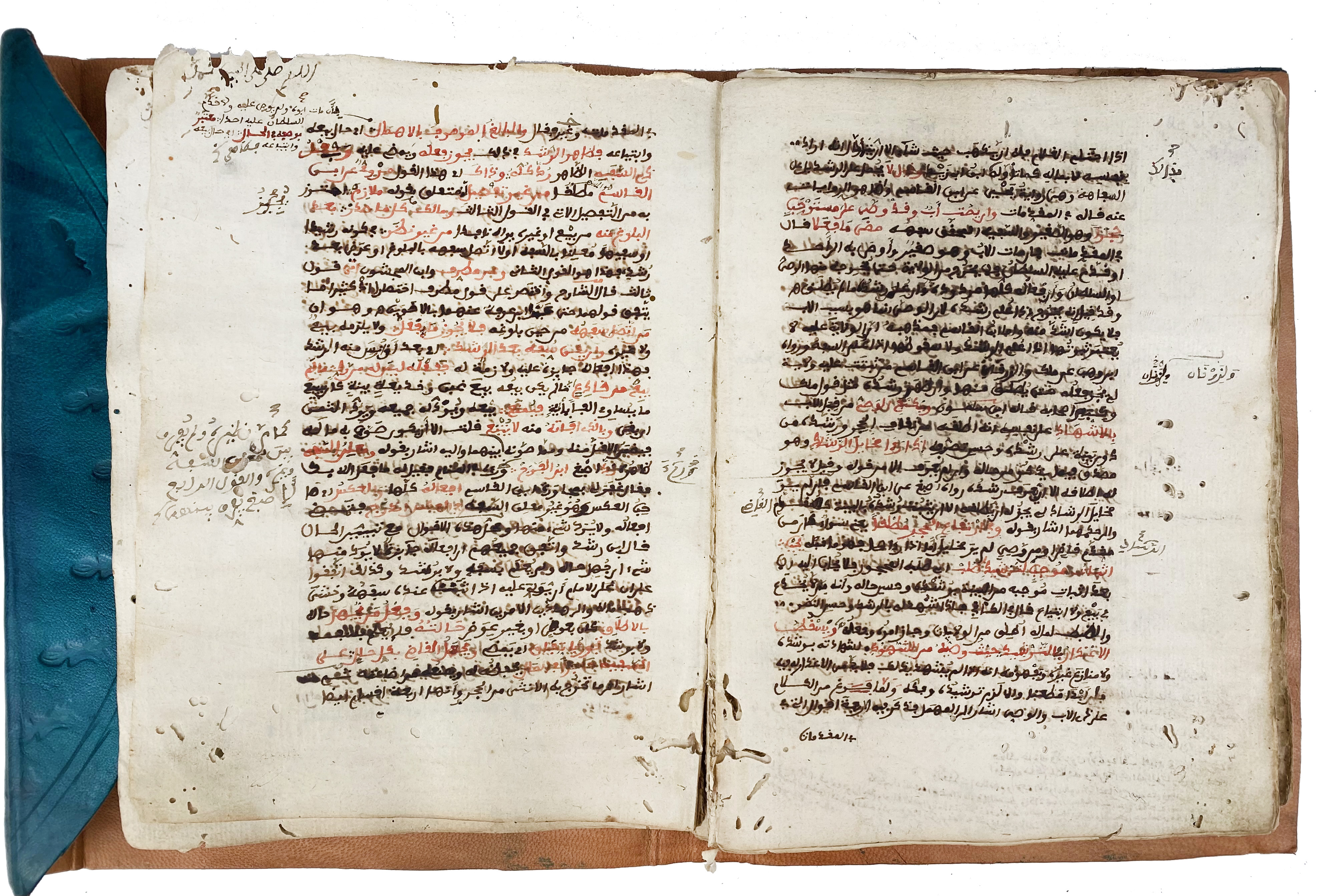 MANUSCRIPTS -- IBN 'ÂSIM. Tuhfat al-Hukkâm ('The Gift of the Judges'), with commentary (Sharh al-Tuhfa). Copied by 'Alî b. 'Abd Allâh al-Yarqâwî al-Shamâtî. North Africa, Morocco, dated 19 Shawwâl 1210 AH (April 1796 CE). Approx. 120 lvs. Arabic ms. on paper, in a neat Maghribî hand with rubrication, marginalia, and a securely dated colophon naming the scribe. Dimensions: 21x15 cm; written area 16x10 cm. Loose in mod. Moroccan petrol leather with flap, decorated in blind tooling. (Worming and losses at the edges, especially in later leaves, but text generally legible and structurally sound).