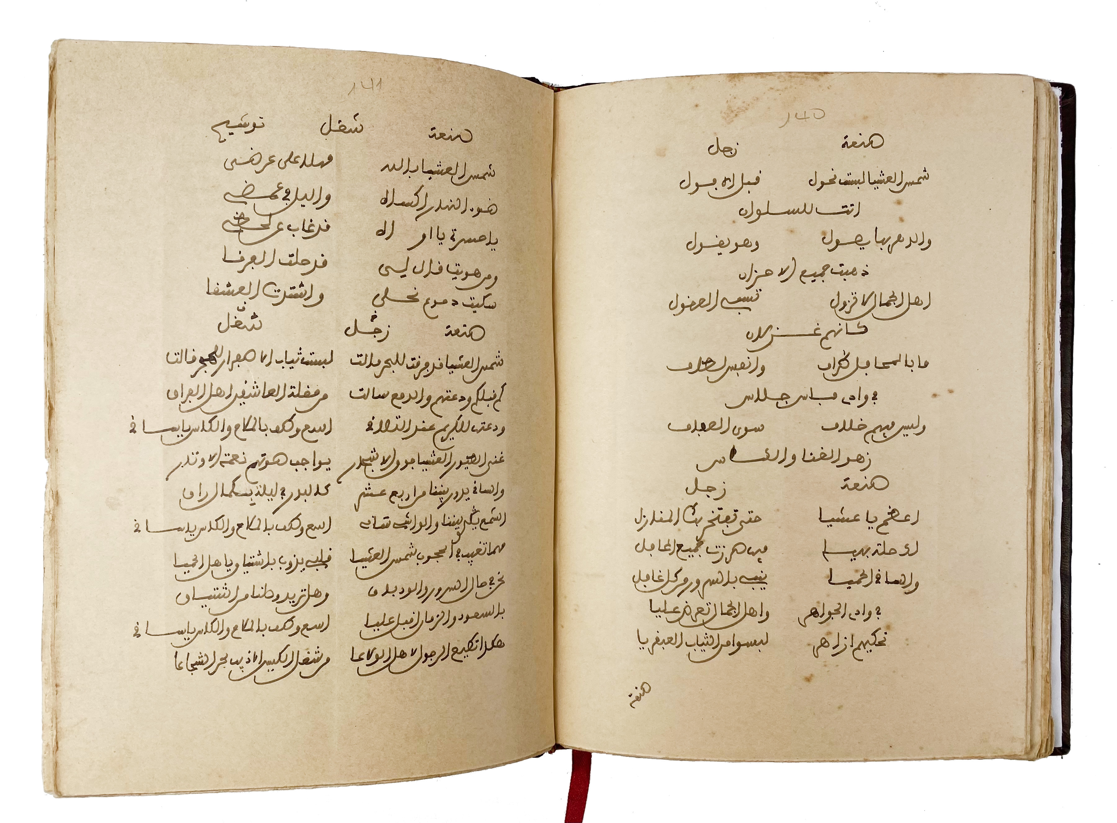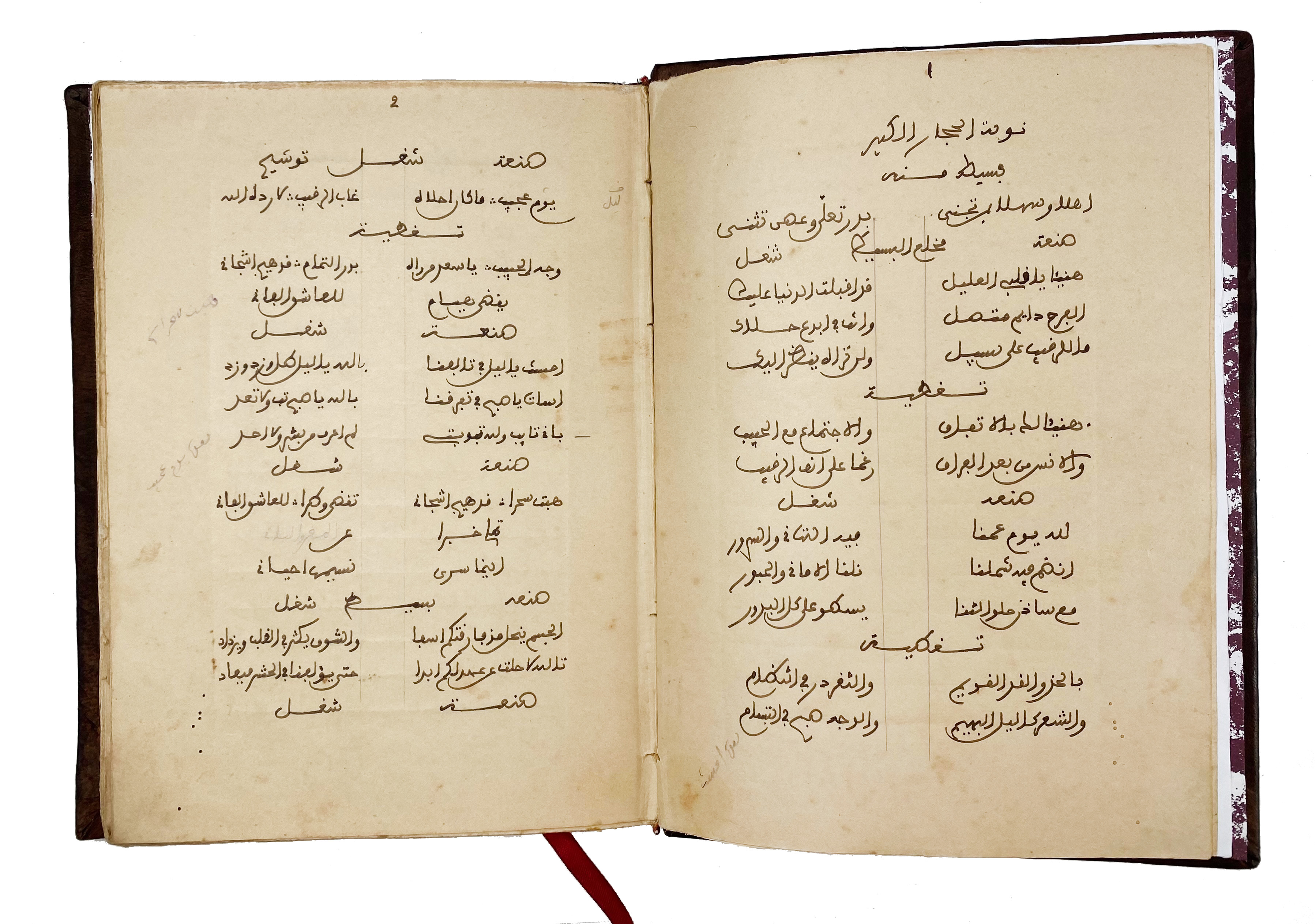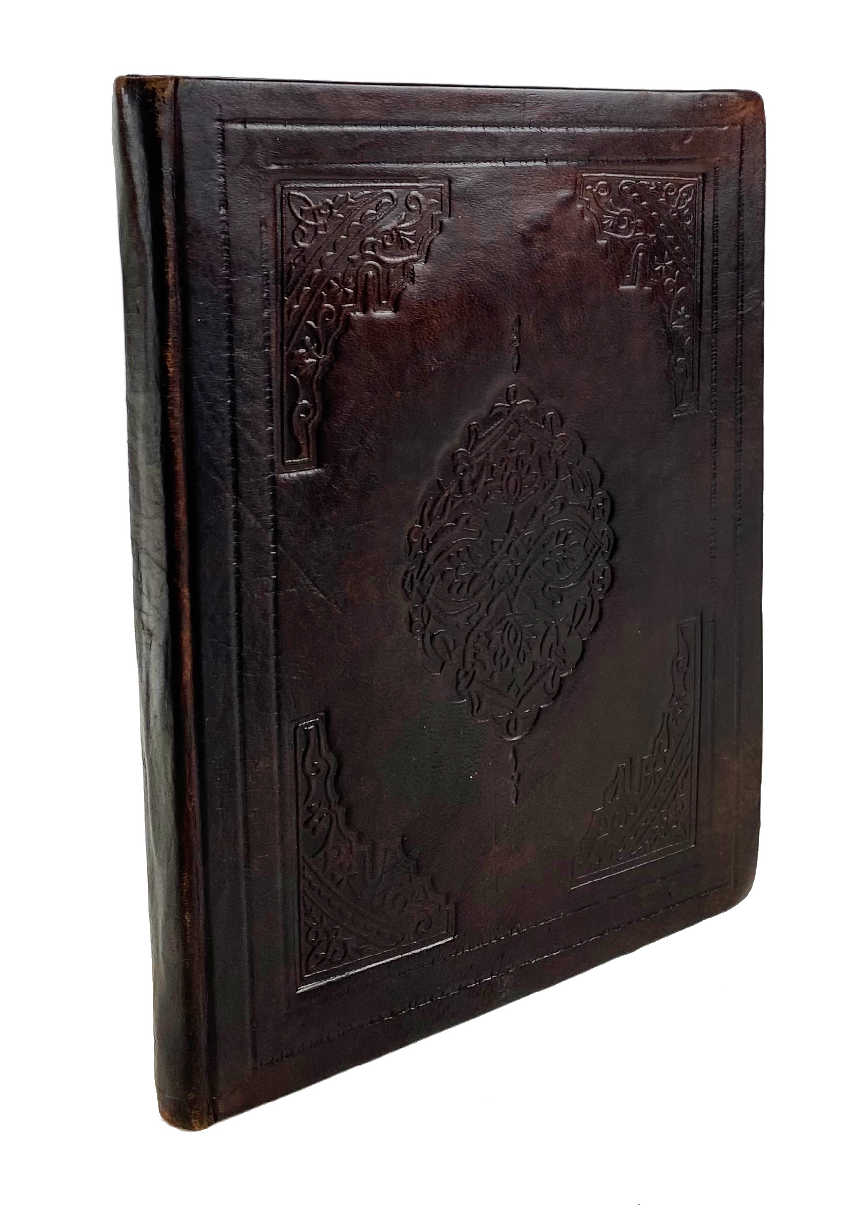 MANUSCRIPTS -- JAVANESE SUFI devotional anthology of Arabic poetry and supplications, including Du'a al-Nasr and Du'a al-Jihad al-Kabir Origin. Java, first half of the 19th c. (c. 1820-1860). Approx. 85 lvs. (157 paginated pp.), about 4 blank. Arabic ms. on unwatermarked Chinese laid paper. Text in a neat naskh hand in two columns in dark brown ink, marginal and interlinear glosses in Malay/Jawi, occasional prose commentary; opening with the Nawba li-Jabbar al-Kabir and concluding with the Du'a al-Nasr ('Supplication for Victory') and Du'a al-Jihad al-Kabir ('Supplication of the Great Jihad'). Dimensions: 21x15 cm; written area approx. 16,5x10 cm. Mid-20th c. full blind tooled cf. (One later lined notebook leaf inserted at rebinding, some outer margins repaired, with some foxing and light water staining).
