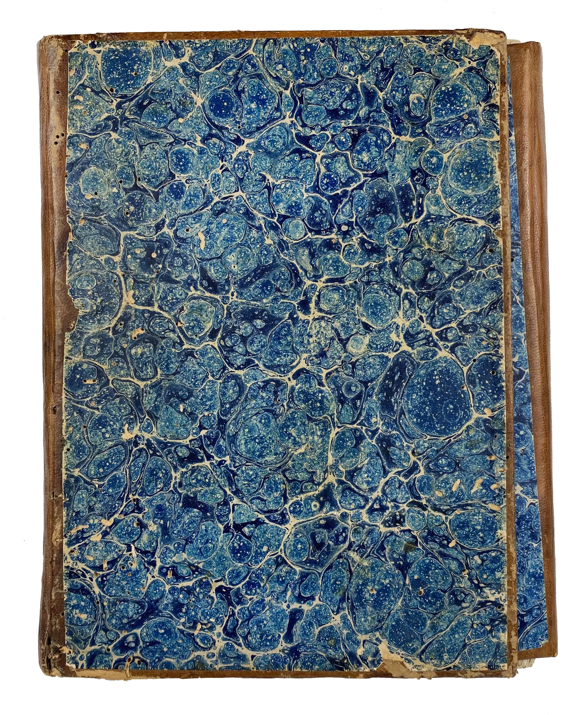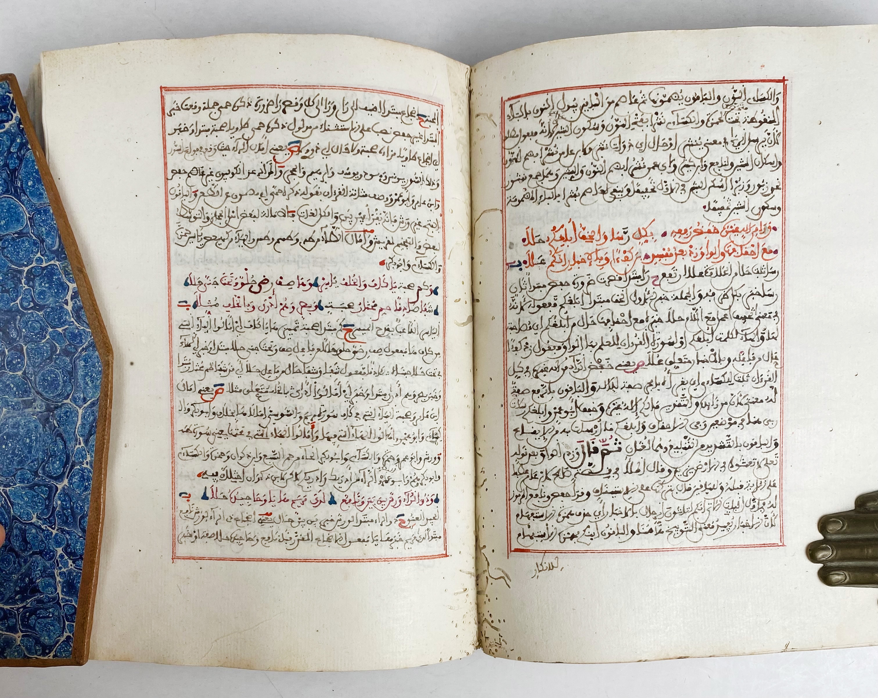 MANUSCRIPTS -- SHARH AL-'ASHMÂWIYYA (Commentary on al-'Ashmâwî's Mukhtasar fî al-Fiqh). North Africa, late 18th-early 19th c. Approx. 200 lvs., 21 lines per page. A neat North African manuscript on fine handmade paper, copied in a fine Maghribi hand, rubricated throughout. Dimensions: 20x15 cm; written area 14,5x9 cm. Brown leather bind. w. flap & blue marbled paper on sides. (A bit wormholed, else fine).