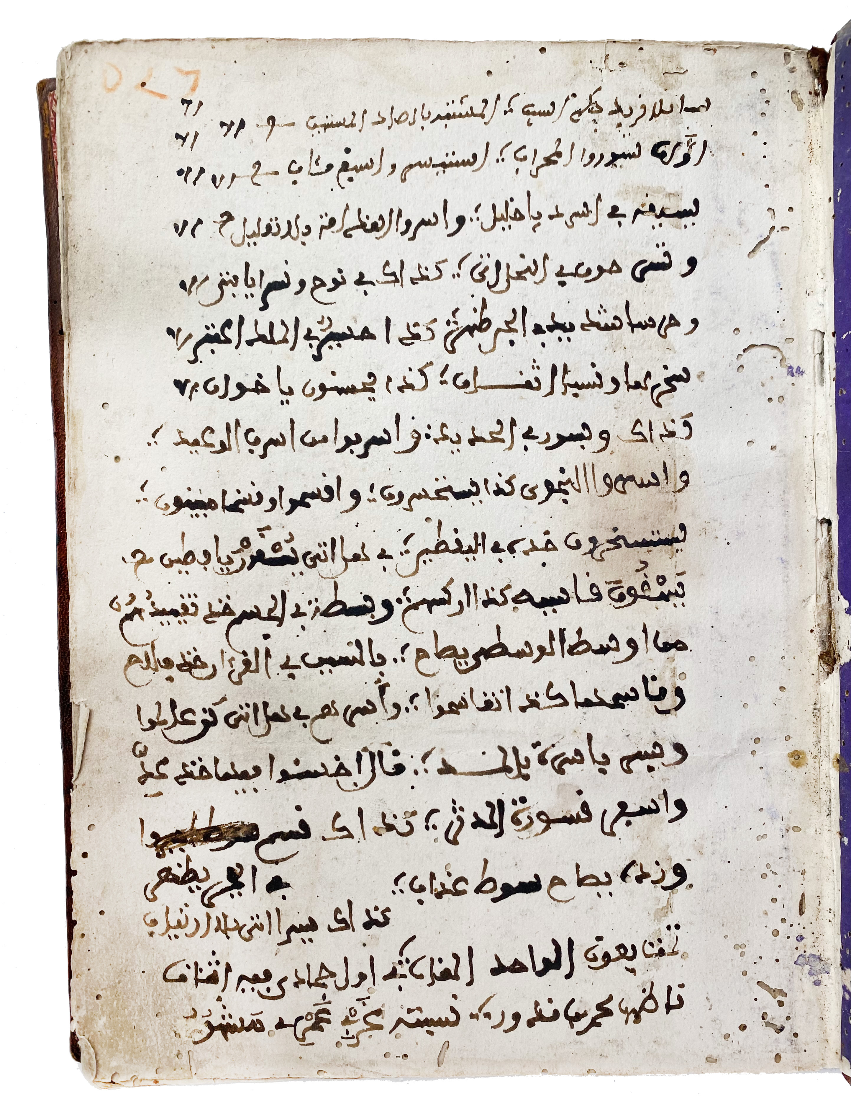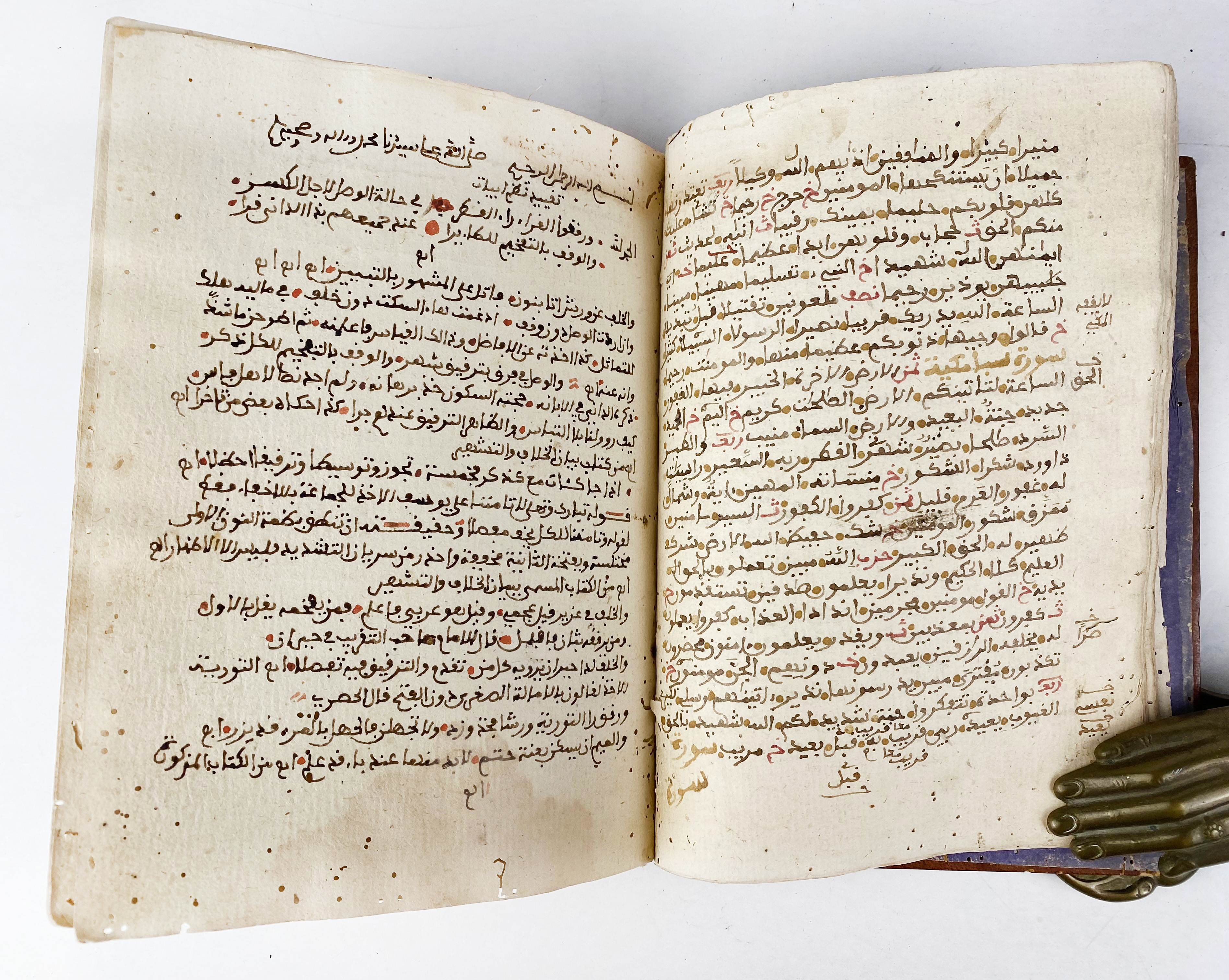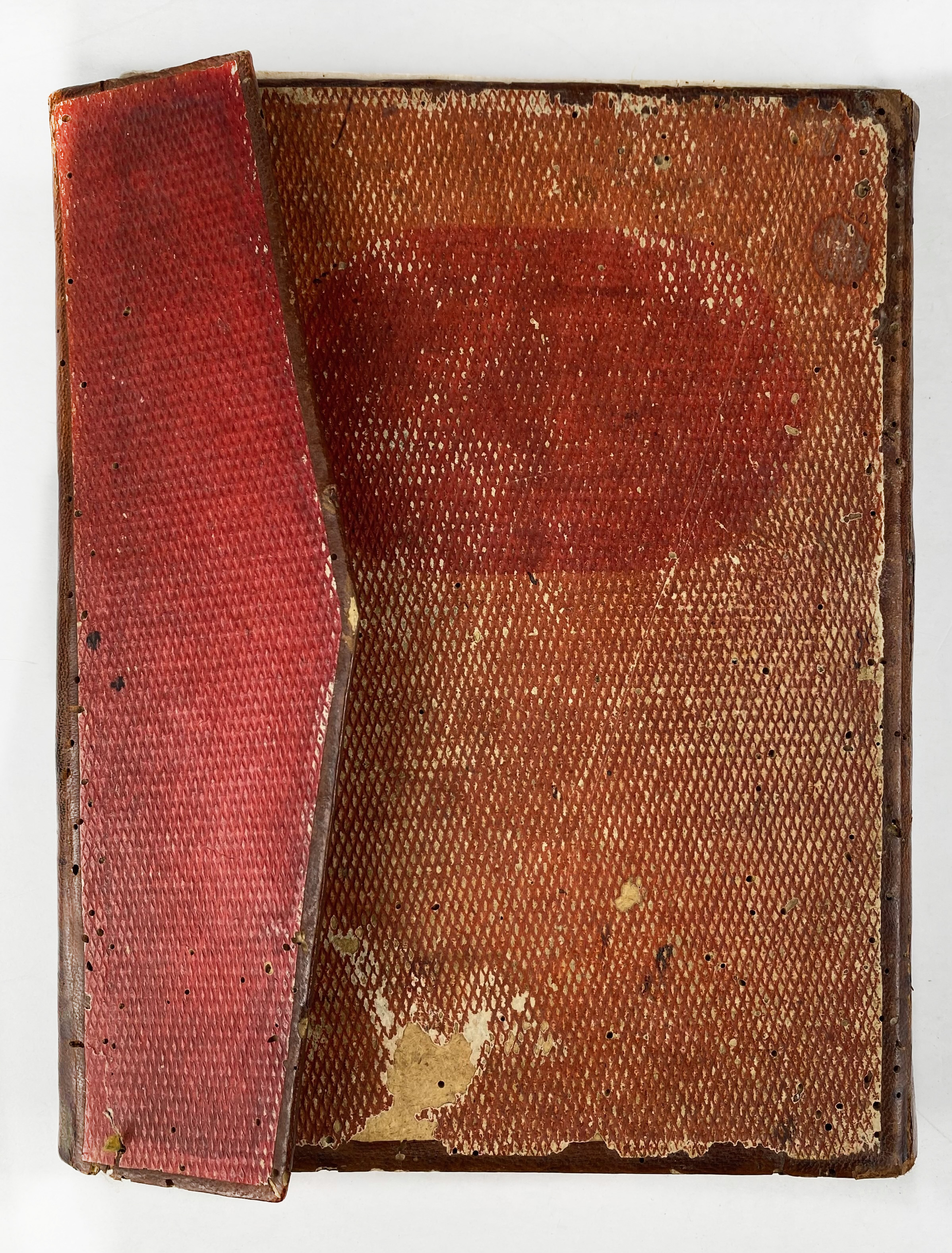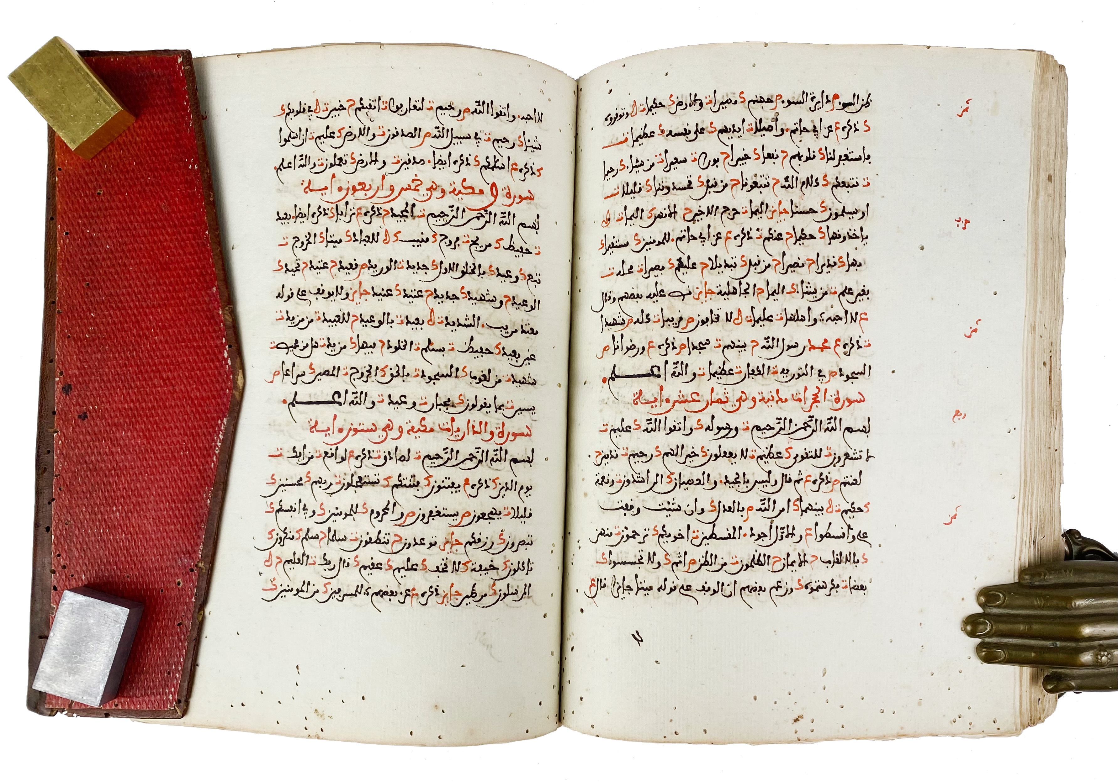 MANUSCRIPTS -- 'UMAR AL-BAZZÂZ (attrib., d. after 14th century CE). Kitâb al-Bazzâziyya fî al-tibb ('The Bazzâziyya: A Medical Compendium'). Maghrib, mid- to late 18th c. (c. 1740-1790). 100 lvs., 21-25 lines to the page. Medical Arabic manuscript on thick local paper, written in a neat Maghribi hand in dark brown ink with headings in red; marginalia including medical notes, astrological tables, and talismanic diagrams. Dimensions: 20x15 cm. Moroccan red leather bind. w. flap, paper with crosshatch pattern laid down on both sides. (Binds. a bit dam./wormholed in places, some damp staining at lower margins, small wormholes throughout).