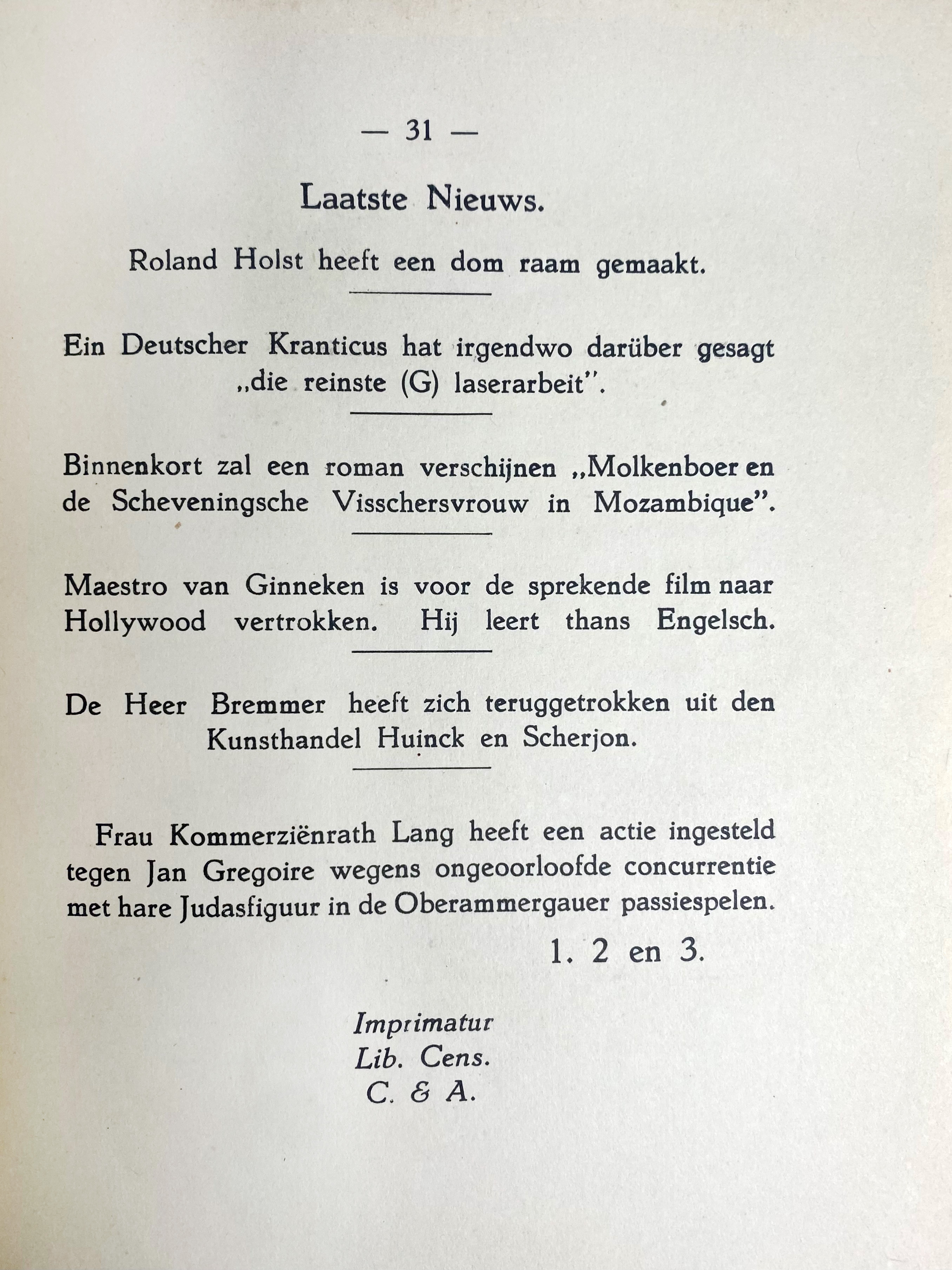 Satirical periodical, only this first issue was published. Plasschaert (1874-1941) wrote many art reviews, mainly for 'Het Vaderland' and 'De (Groene) Amsterdammer', and in that capacity he became one of the most prominent and feared art critics in the Netherlands. He also wrote several poems, some under the pseudonym 'A. Pelgrym' and he published a number of monographs and essays on art criticism. - Rare.