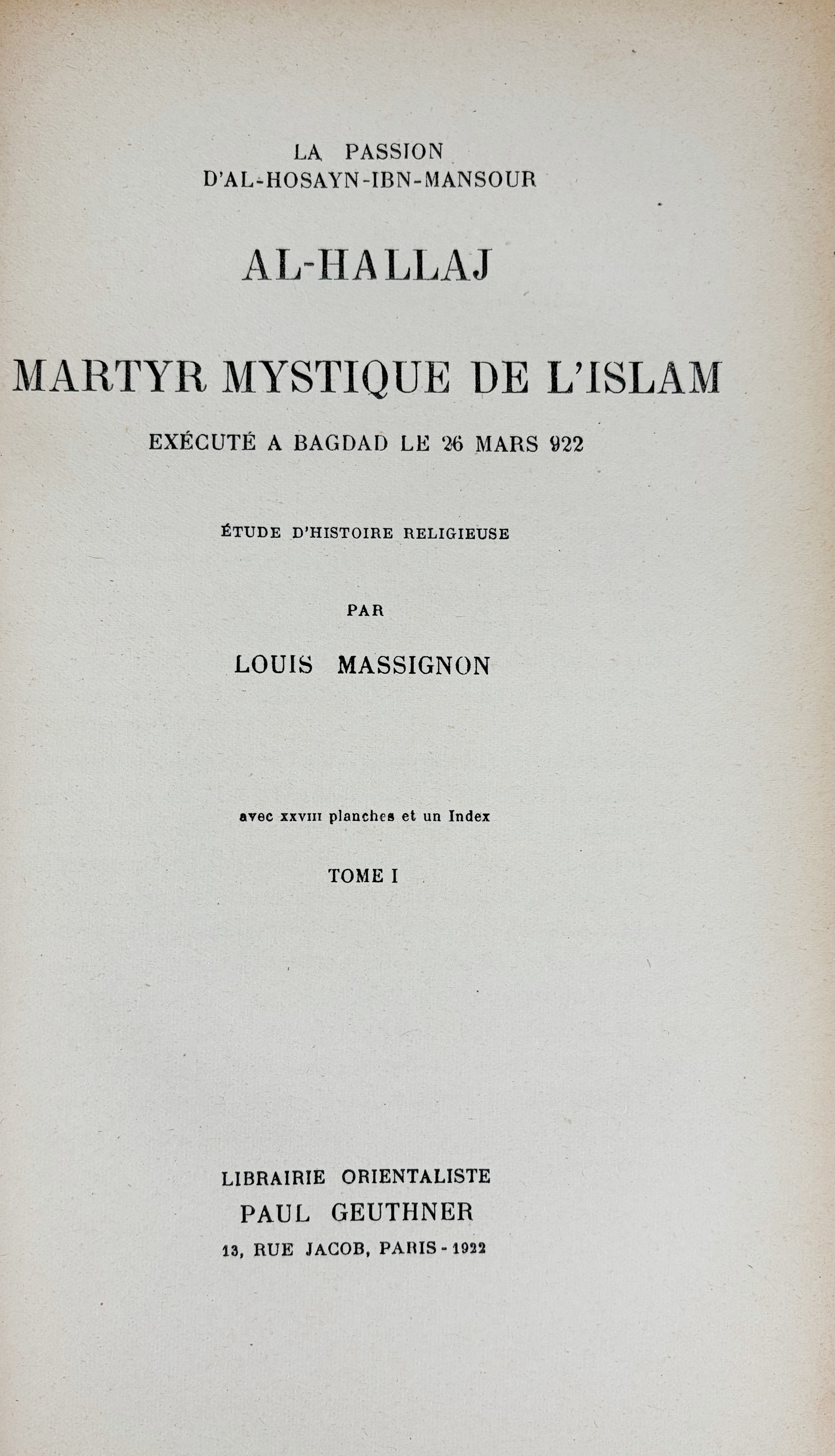 MYSTICISM/SUFISM -- MASSIGNON, L. La passion d'al-Hosayn-ibn-Mansour Al-Hallaj, martyr mystique de l'islam exécuté à Bagdad le 26 mars 922. Étude d'histoire religieuse. Par., 1922. 2 vols. -- Id. Essai sur les origines du lexique technique de la mystique musulmane. Par., 1922. -- Id. Receuil de textes inédits concernant l'histoire de la mystique en pays d'Islam. Par., 1929. Arabic text. -- Tog. 4 vols. Mod. cl. w. gilt lettering. - Rare original editions.