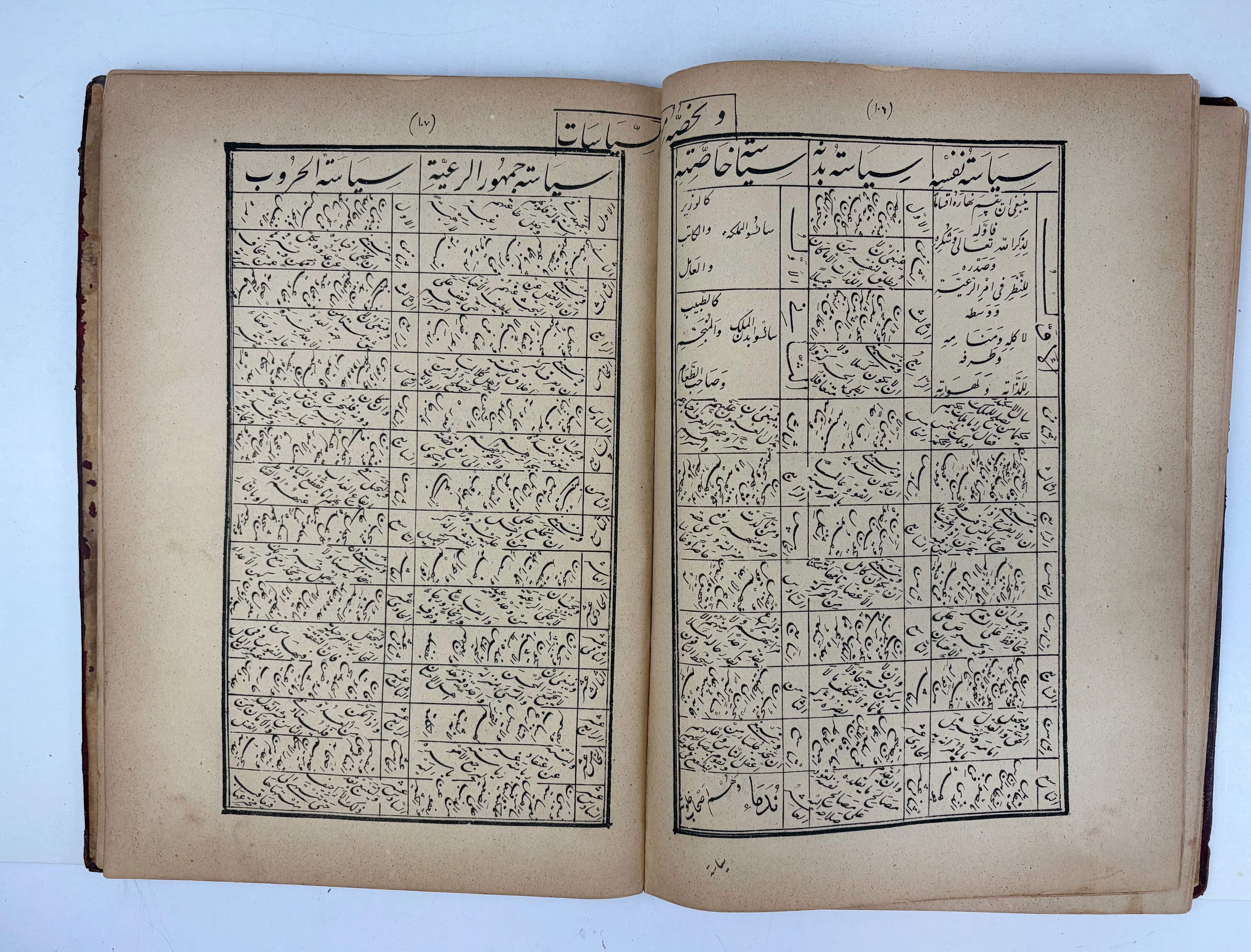 SHIHÂB al-DÎN Ahmad ibn Muhammad ibn Abî Rabî', Kitâb Sulûk al-mâlik fî tadbîr al-mamâlik. Cairo lithogr. 1286 (mentioned by Goldziher, Abh. 1, 66). 152, 3 pp. Colophon on p. 150: written by ("râqimuhu") Muhammad 'Alî al-Khurâsânî; dated Sha'bân 1286 (1869). Printed by order of King Muhammad 'Arif Bâshâ (p. 151 infra). The text is followed by three pages of corrections written by the corrector ("musahhih") Muhammad al-Samlûtî. Fol. Old cf. binding. (Spine ends dam., edges a bit dam./worn, loose in binding, paper a bit browned).