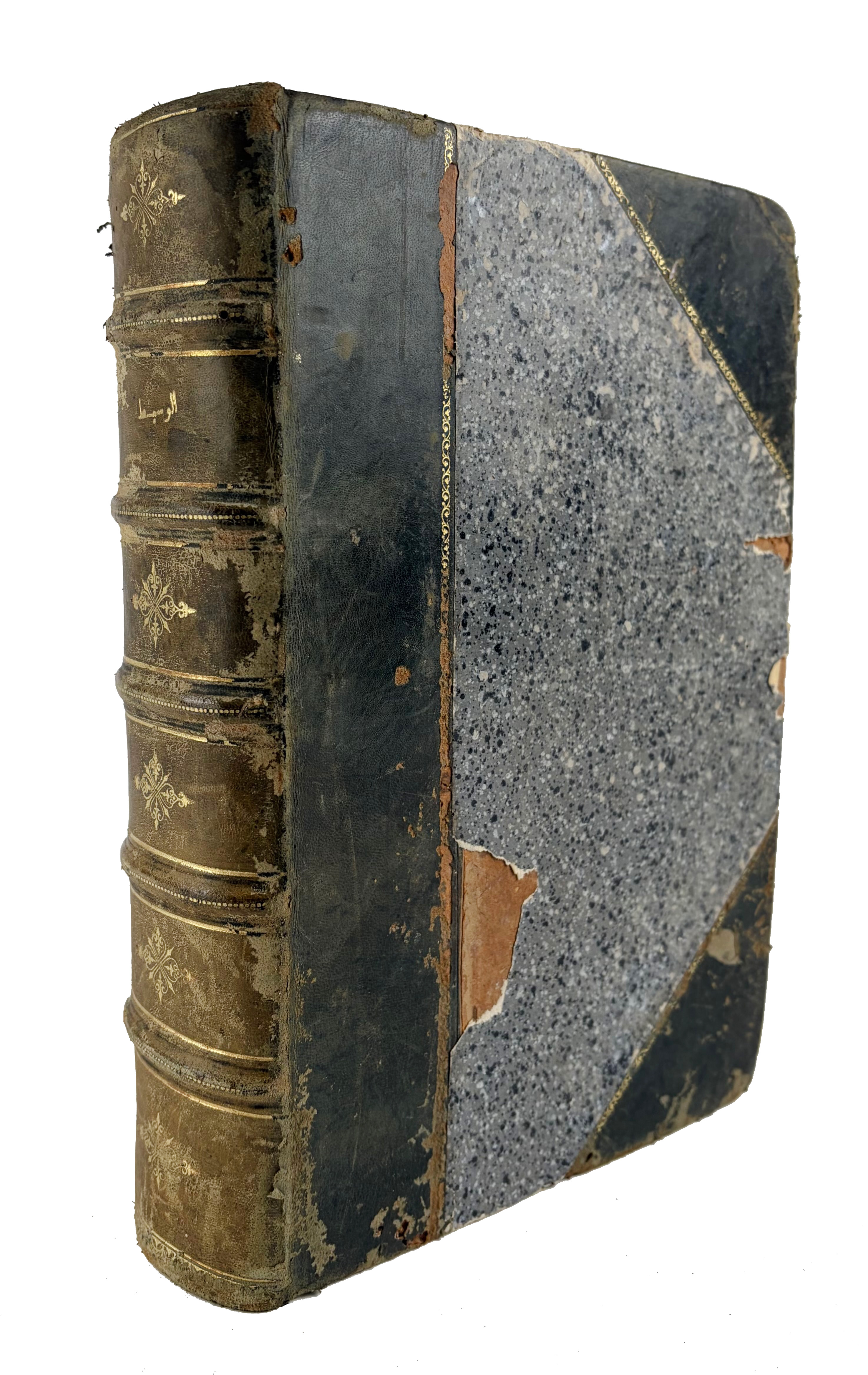 SHINQÎTÎ, Ahmad Ibn al-Amîn. Al-Wasît fî tarâgim udabâ Shinqît. Cairo, al-Matba'a al-jamâlîya, 1329 (1911). (4), 542 pp. Lge-8°. Cont. green hcf. extra w. raised bands. dec. gilt back, a.e.g. (Calf a bit chafed/dam. in places, paper on sides partly gone, sl. age-toned, but else fine).