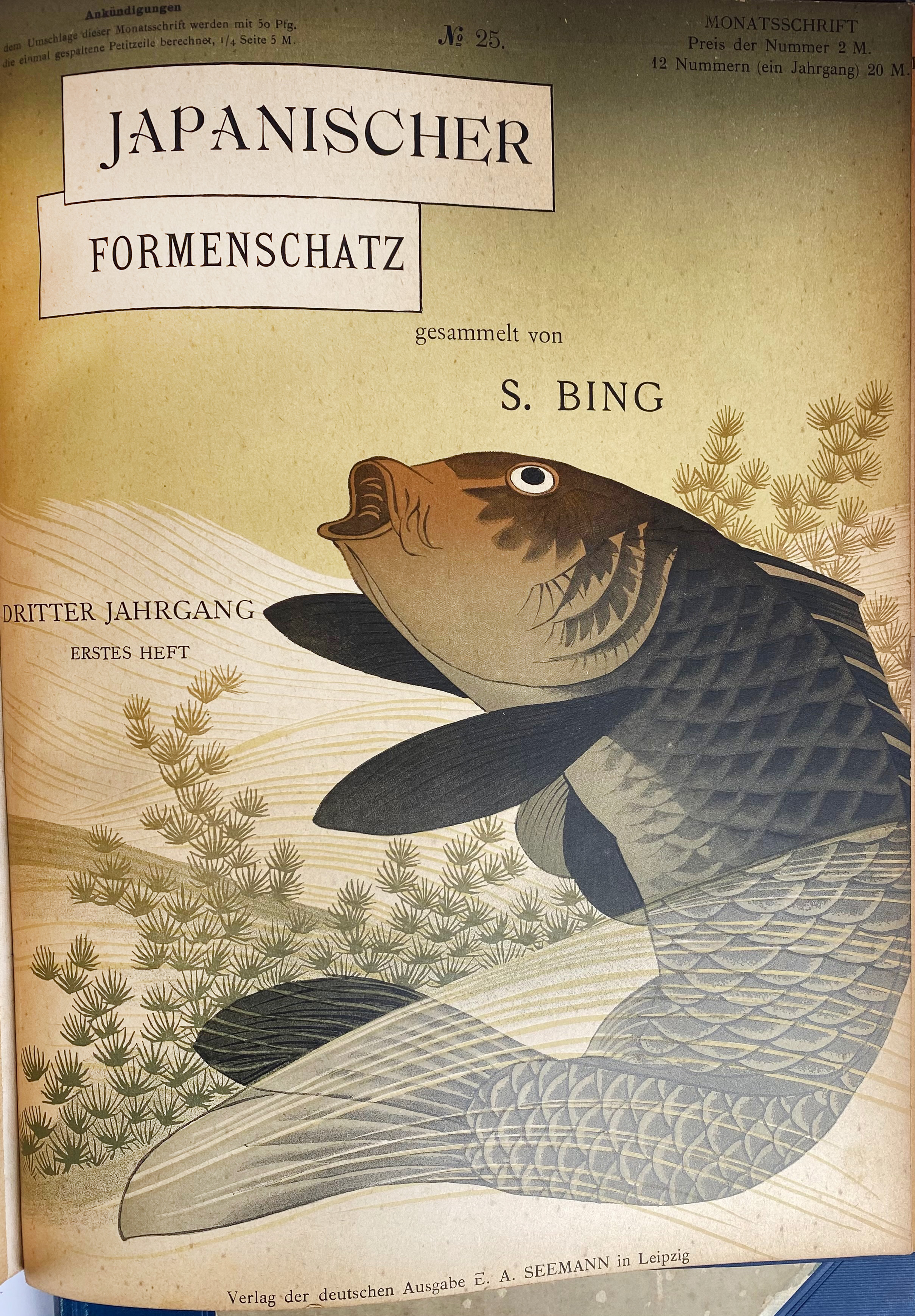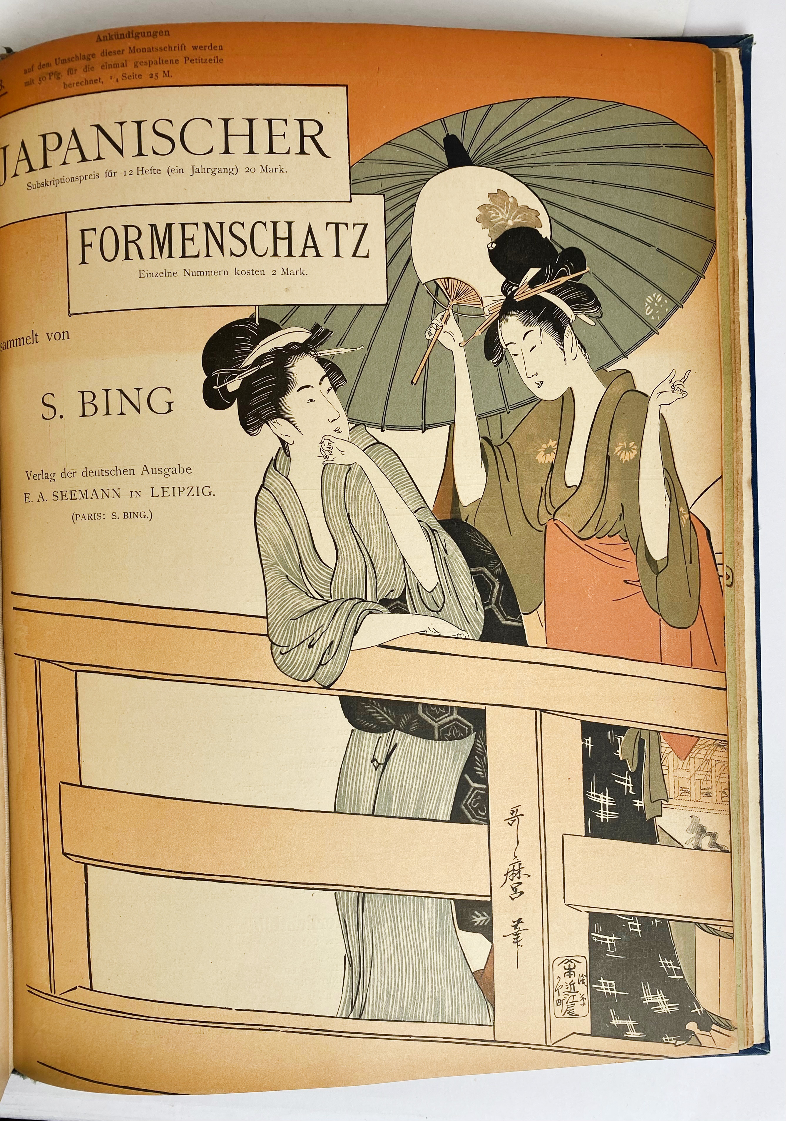 JAPAN -- BING, S. Japanischer Formenschatz. Monatsschrift. Lpz., E.A. Seemann, (1888-91). 36 issues in 6 vols. W. num. cold. & tinted full-p. plates (incl. covers), photographs & num. monochrome text-illustr. 4°. Ohcl. w. illustr. front sides. (Some wear to extremities, sm. hole in 1 spine, front sides a bit foxed, pages sl. browned). - Complete set.