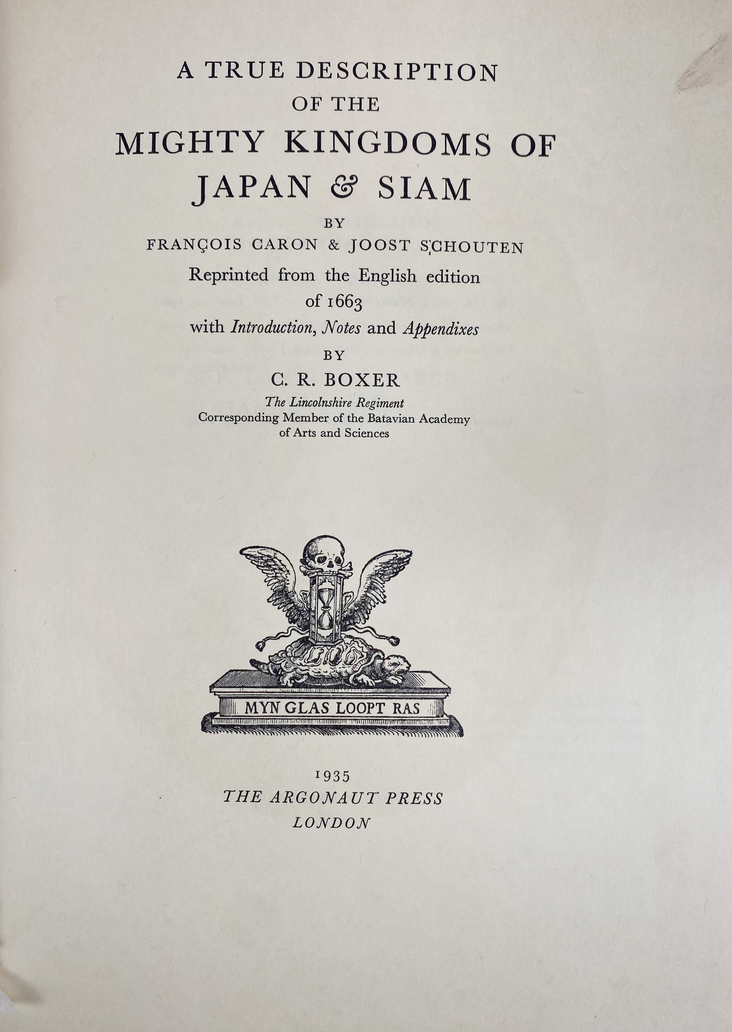 JAPAN -- CARON, F. & J. SCHOUTEN. A true description of the mighty kingdoms of Japan & Siam. Repr. ed. 1663 w. introd., notes & append. by C.R. Boxer. London, The Argonaut Press, 1935. cxxix, 197, (3) pp. 4°. Or. h. vellum w. gilt lettering, uncut. (A few marg. pencil annot.).