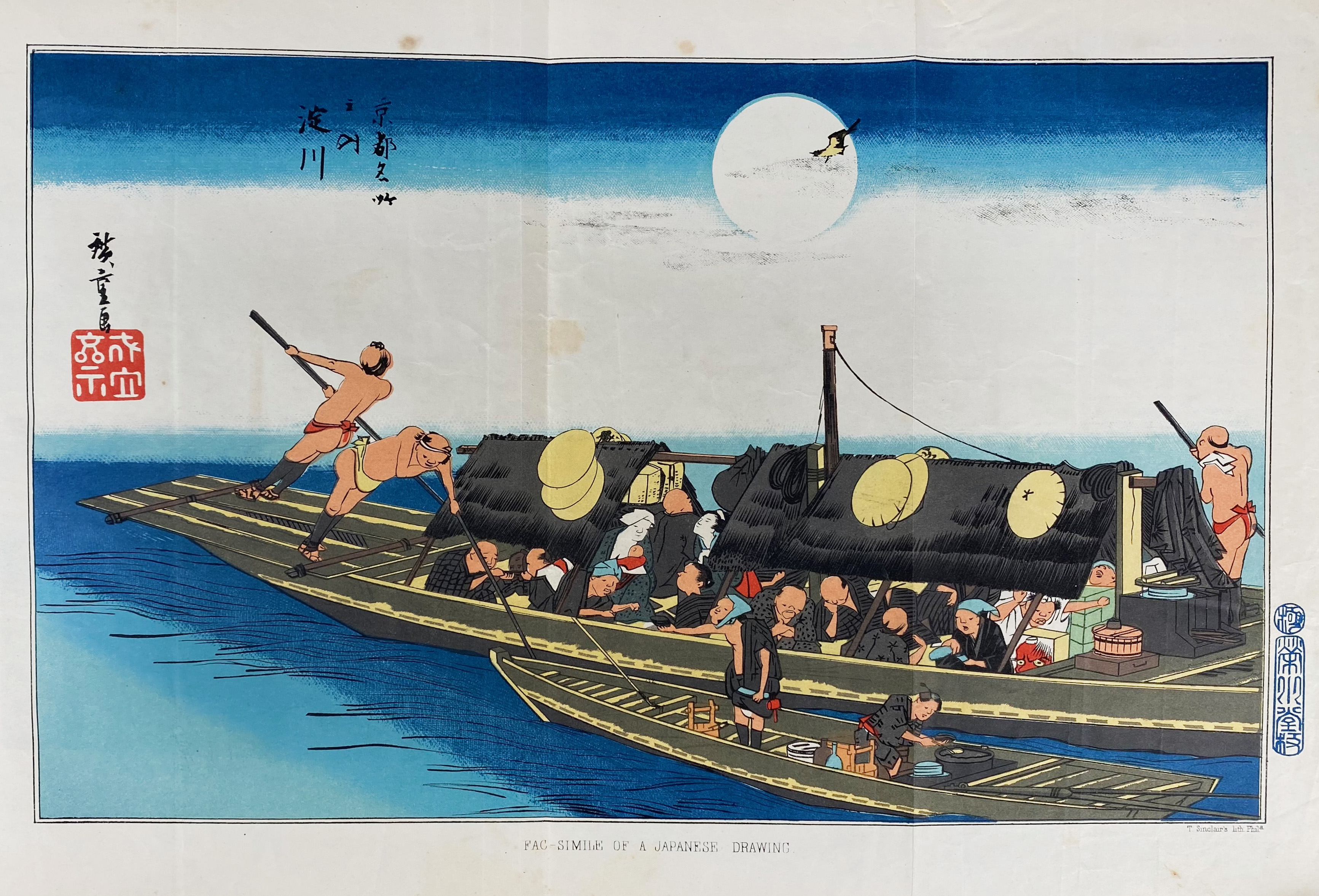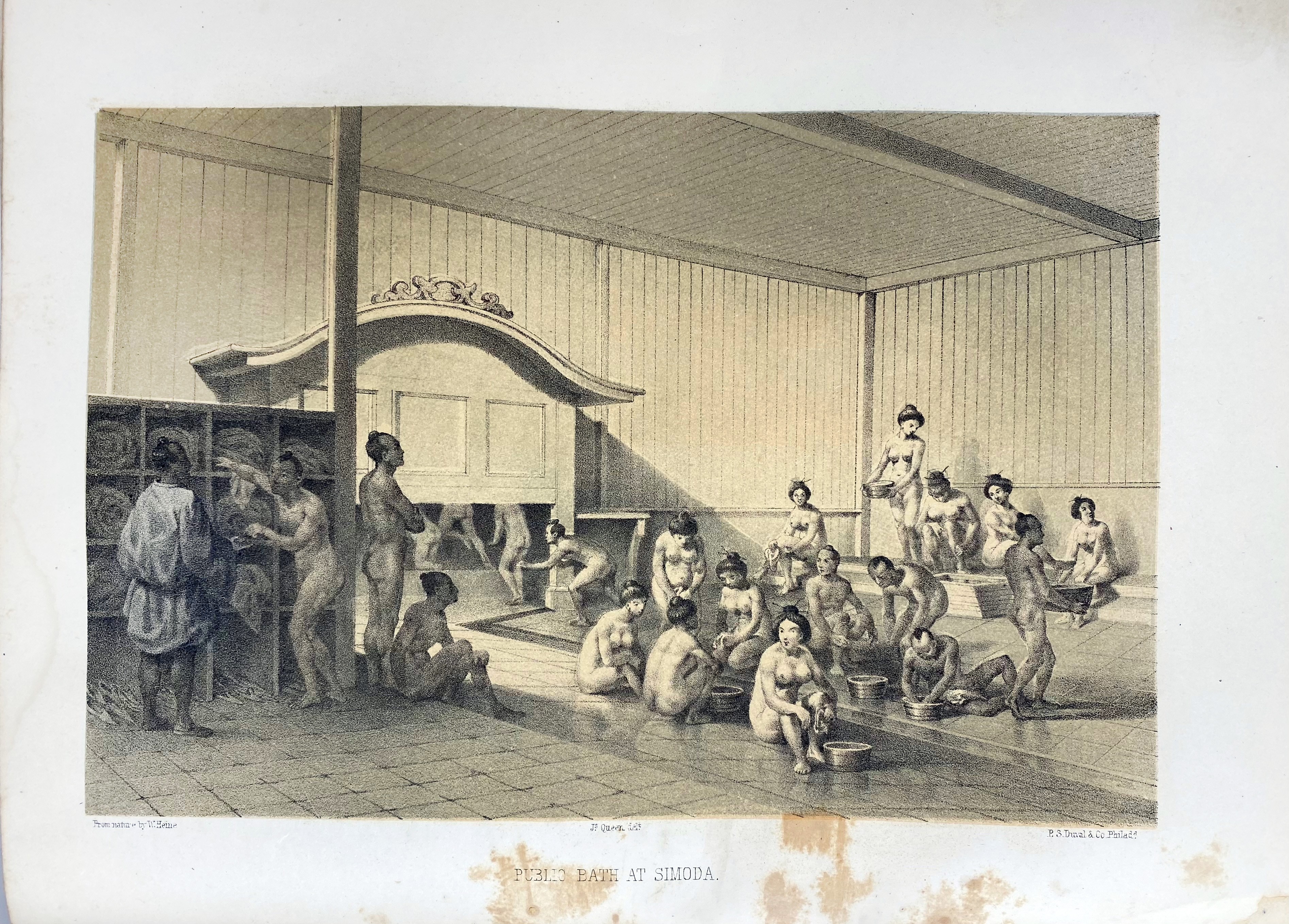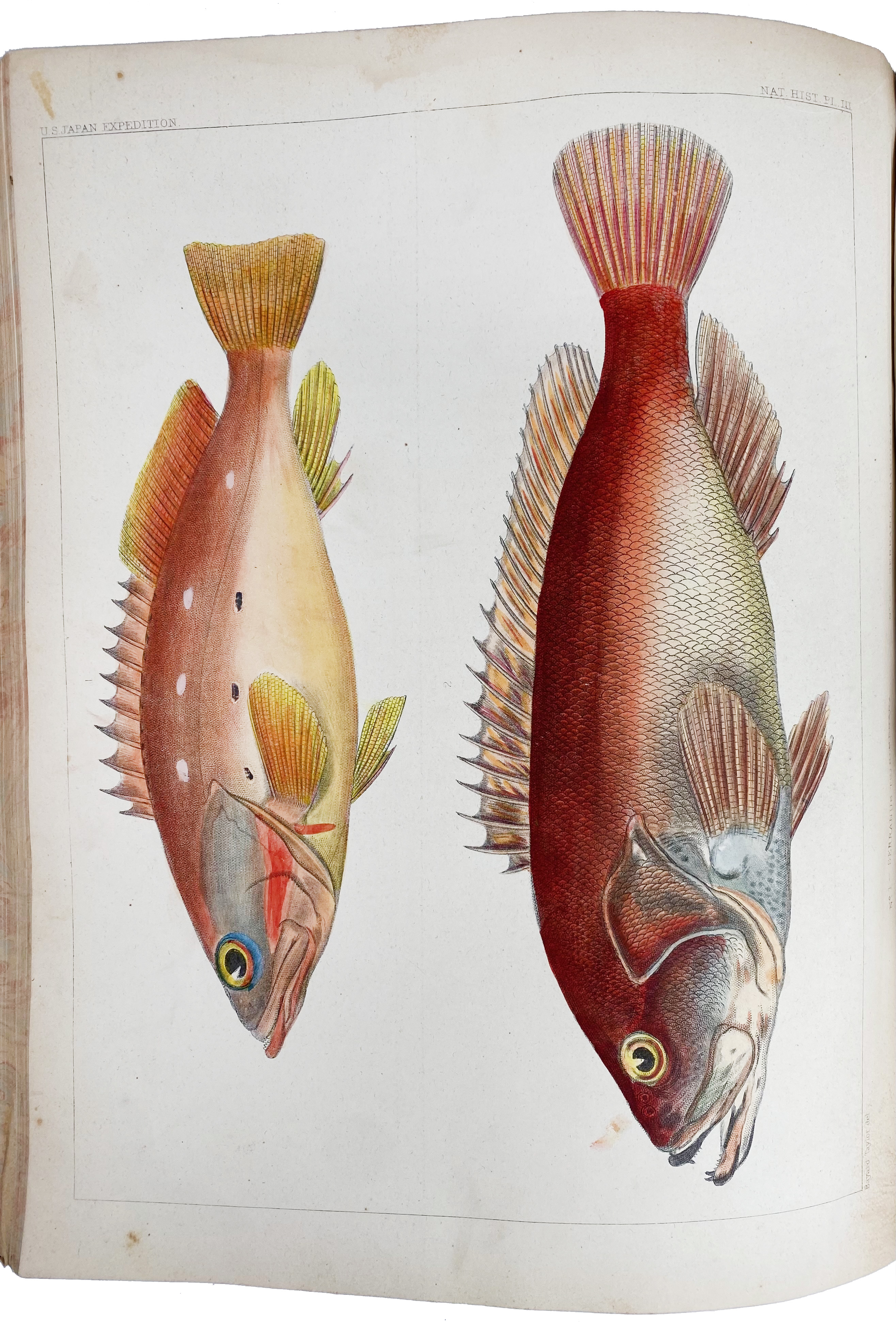 JAPAN -- HAWKS, F.L. Narrative of the Expedition of an American Squadron to the China Seas and Japan, performed in the years 1852, 1853, and 1854, under the Command of M.C. Perry, (…). (With:) G. JONES. Observations of the Zodiacal Light, from April 2, 1853, to April 22, 1855. Washington, 1856. 3 vols. xvii, 537; (8), 414; xliii, 705 pp. Vol. I: 90 (cold./tinted) lithogr. plates incl. the suppressed bathing plate which is not present in most copies, and incl. 3 cold. "facsimiles" of Japanese woodblock prints, 6 maps/charts (2 fold.), & num. woodcuts; Vol. II: 17 (cold.) lithogr. plates, 16 diagram plates of winds and currents, 14 pp. facsimile and 17 (large) fold. charts on 16 sheets, num. woodcuts; Vol. III: 352 charts depicting zodiacal light w. a text-p. 4°. Cont. hcf. (2) and ocl. (Upper inner hinge vol. 1 broken, greater part of maps a bit dam./rumpled, some waterstaining (espec. to vol. 2), some foxing in places in all vols.).