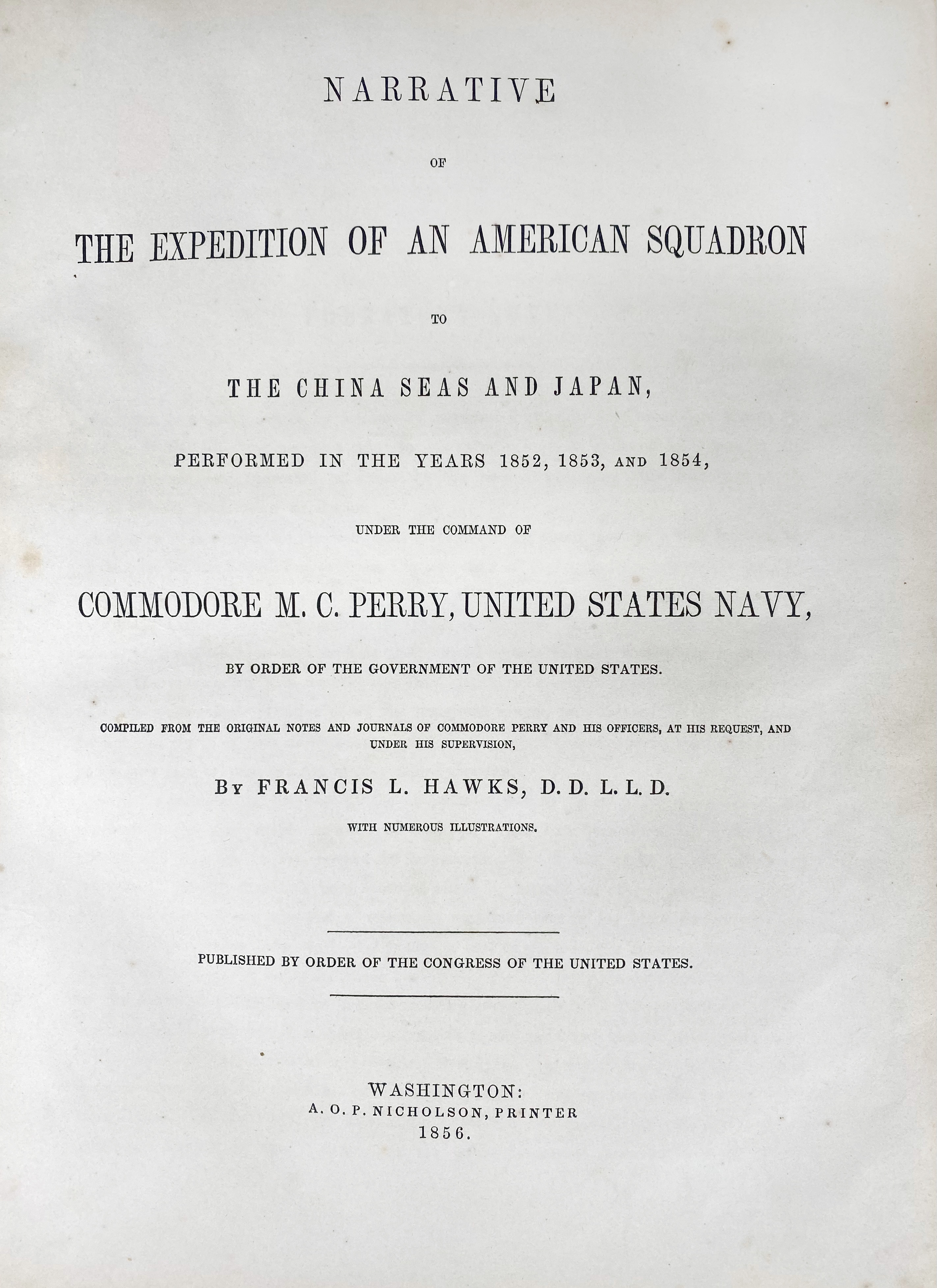 The Perry Expedition was a U.S. naval and diplomatic expedition to Japan, involving two separate trips to and from Japan by ships of the United States Navy, which took place during 1853–54. The expedition was commanded by Commodore Matthew Calbraith Perry (1794-1858). It resulted in the opening of Japan to American and international trade, and the establishment of diplomatic relations between Japan and the western "Great Powers". - Sabin 159-60; Cordier Japonica 513-4; Cordier Sinica 2122-3.