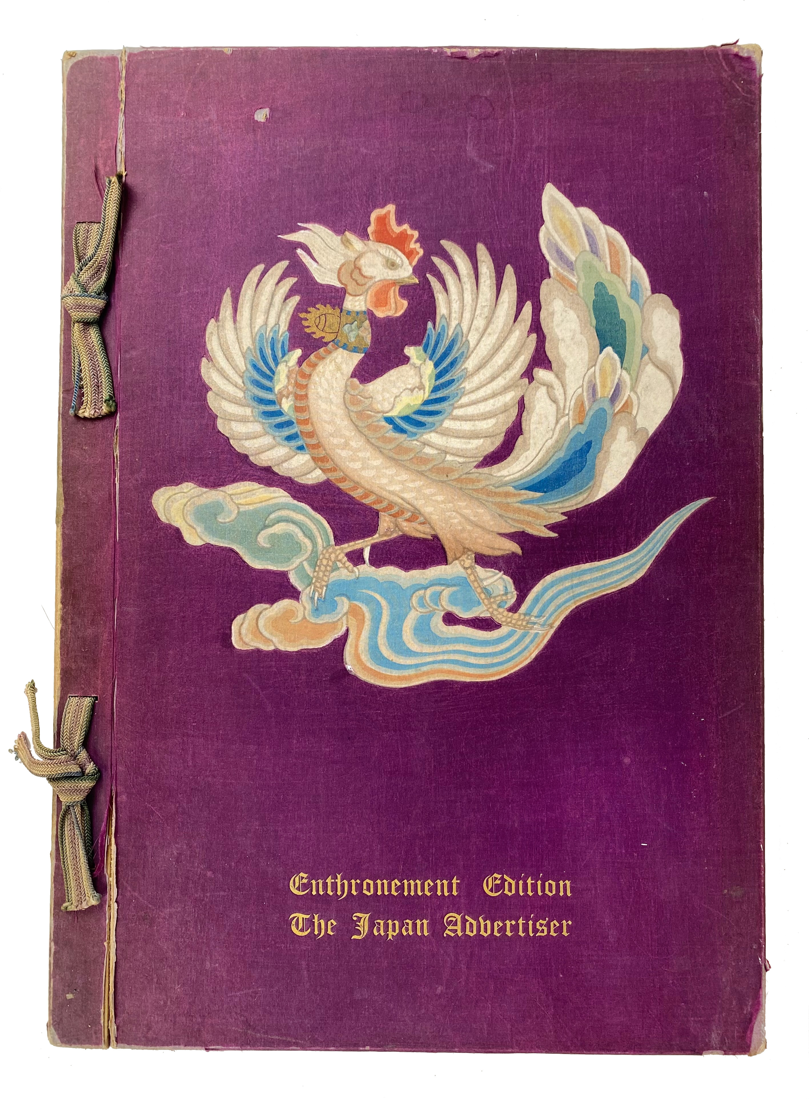 JAPAN -- YOSHIDA -- ENTHRONEMENT of the one hundred twenty-fourth Emperor of Japan. Tokyo, The Japan Advertiser, 1928. xvi, 179, (1) pp. W. 1 or. cold. woodcut by Hiroshi Yoshida & num. ills. Fol. Or. giltlettered pictorial purple silk covers, bound in Japanese style. (Silk a bit worn/soiled in places).