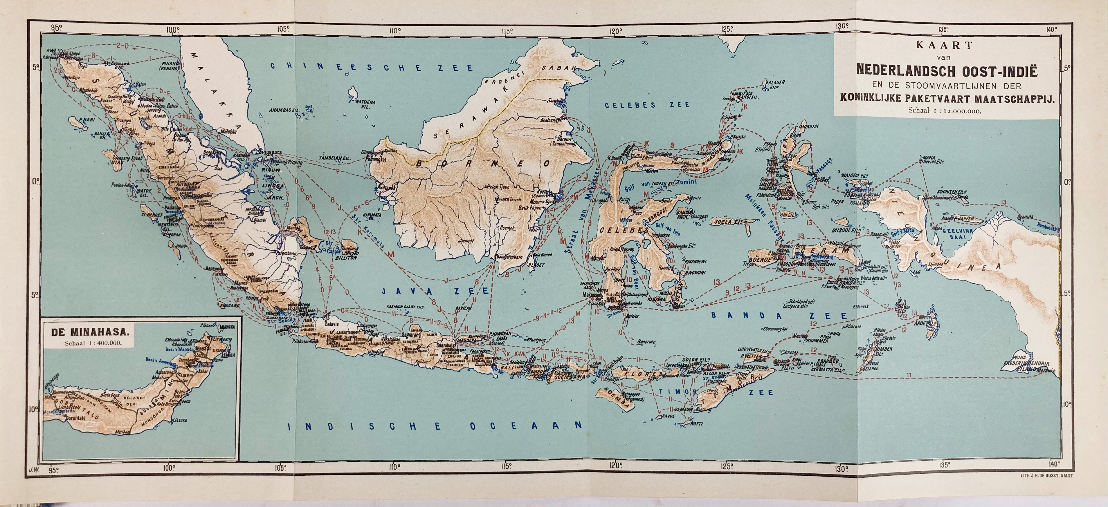 MALAY ARCHIPELAGO -- BEMMELEN, J.F. v., G.B. HOOYER. Reisgids voor Nederlandsch-Indië, samengesteld op uitnoodiging der Koninklijke Paketvaart Maatschappij. Herz. d. J.F. Niermeijer. Amst., 1906. xxviii, viii, (4), 262, (34), xxix-lxxii, (4), -lxxiii-lxxvii pp. W. 2 fold. cold. maps., 5 cold. plans (2 fold.) and many b&w photogr. in text. Or. dec. cl. (Slight wear to bind., but a v.g. copy, especially for a travel guide).