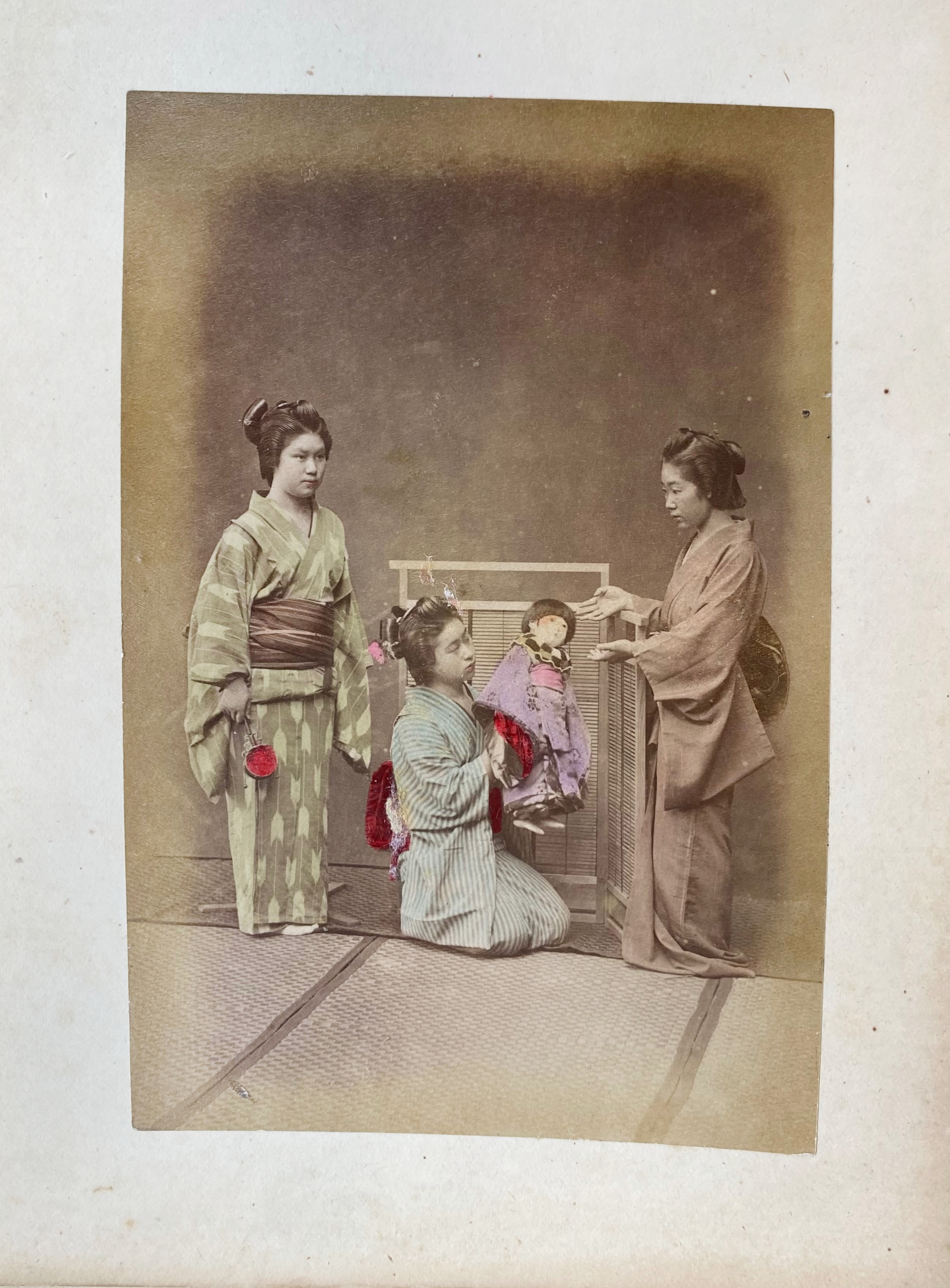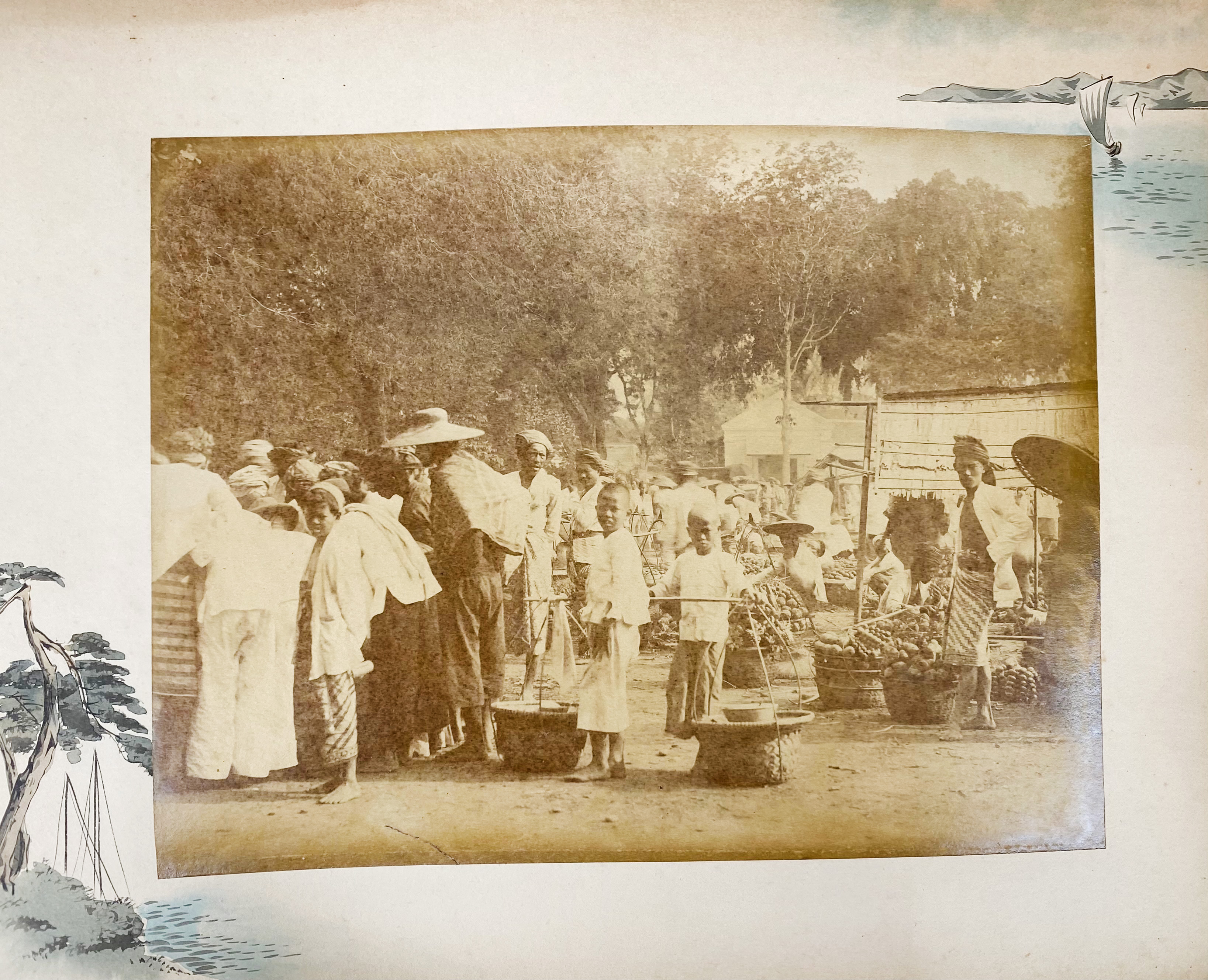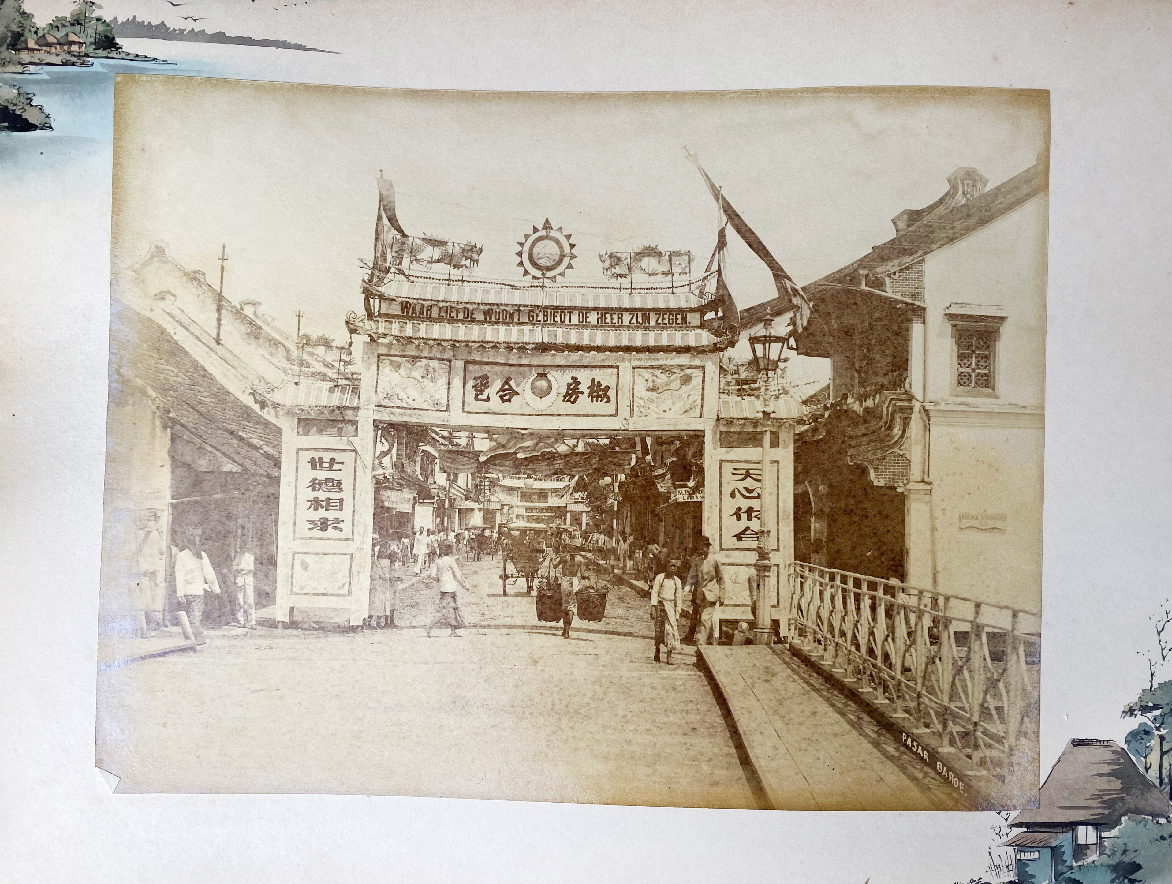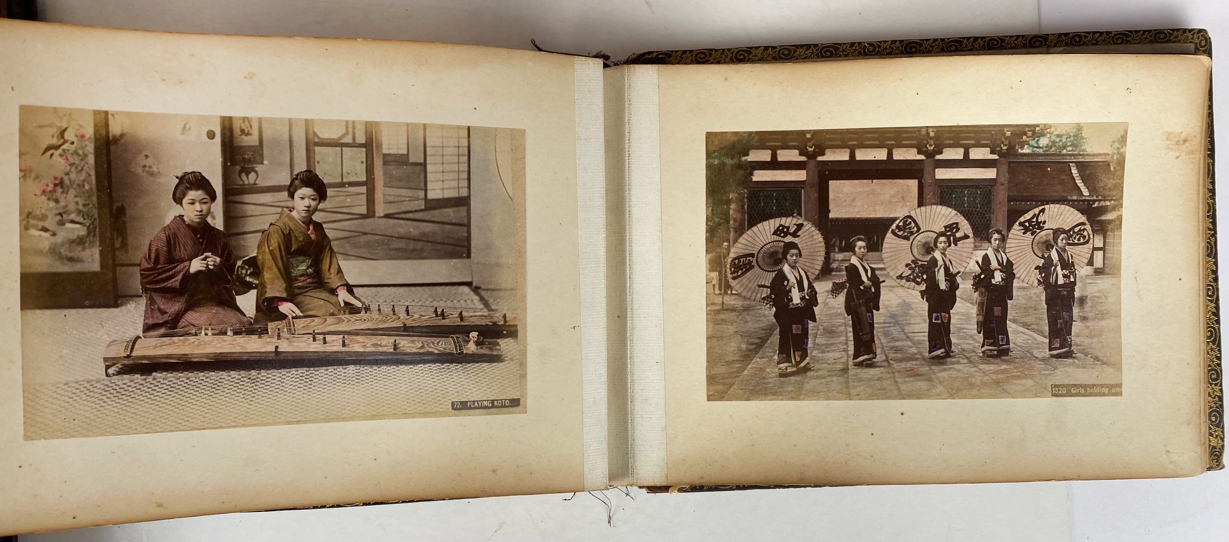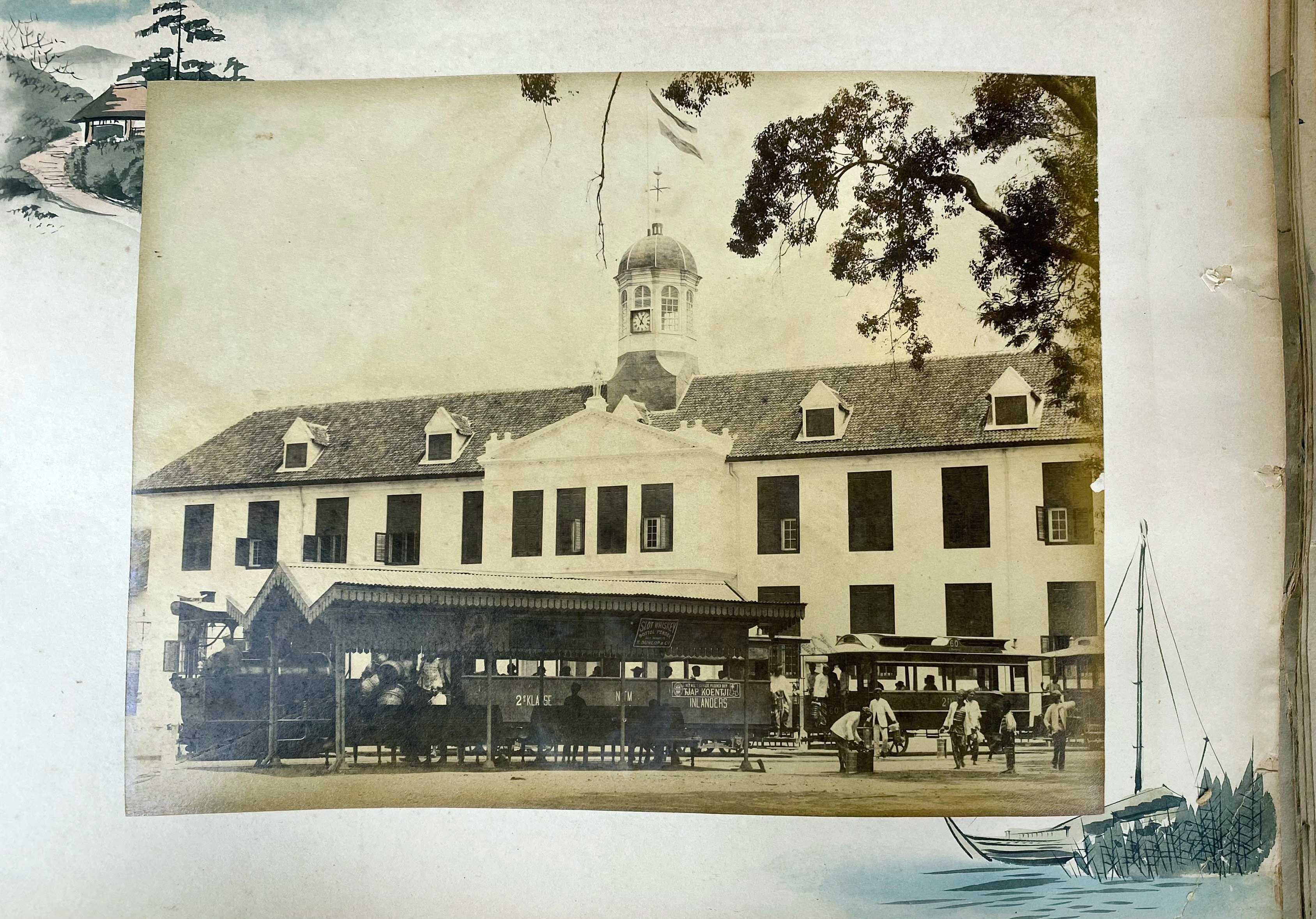 MALAY ARCHIPELAGO -- PHOTOGRAPHS -- LACQUER ALBUM of the family Papelard: "Herinnering aan uw verblijf te Batavia. 6 Mei 1901". (Batavia, c. 1890). Containing 49 photographs (i.a. by Tan-Tjie Lan) on paste board mounts. Sizes vary, but between c. 155 x 190 and 185 x 240 mm. Lge-4°-obl. Hcf. bind. covered w. burgundy lacquered wooden sides w. bevelled edges & gilt flower dec. (Rebacked, large crack in front side, mounts a bit dam. & wavy, some margins a bit frayed, some waterstains, a bit browned, photos a bit faded/waterstained in places, last photo w. pinkish offset from opposite page). -- Added: JAPANESE LACQUER ALBUM. (Japan, c. 1890). W. 50 hand-cold. photographs of Japanese scenery, temples, professions, activities on 25 thick cardboard and gilt-edged mounts. 8°-obl. Clothbacked, covered w. red cherry lacquered wooden sides w. bevelled edges, w. a gilt dec. rickshaw on front side. (Spine & corners dam., mounts warped, tissue guards for the greater part gone, margins a bit browned/soiled). -- (2).