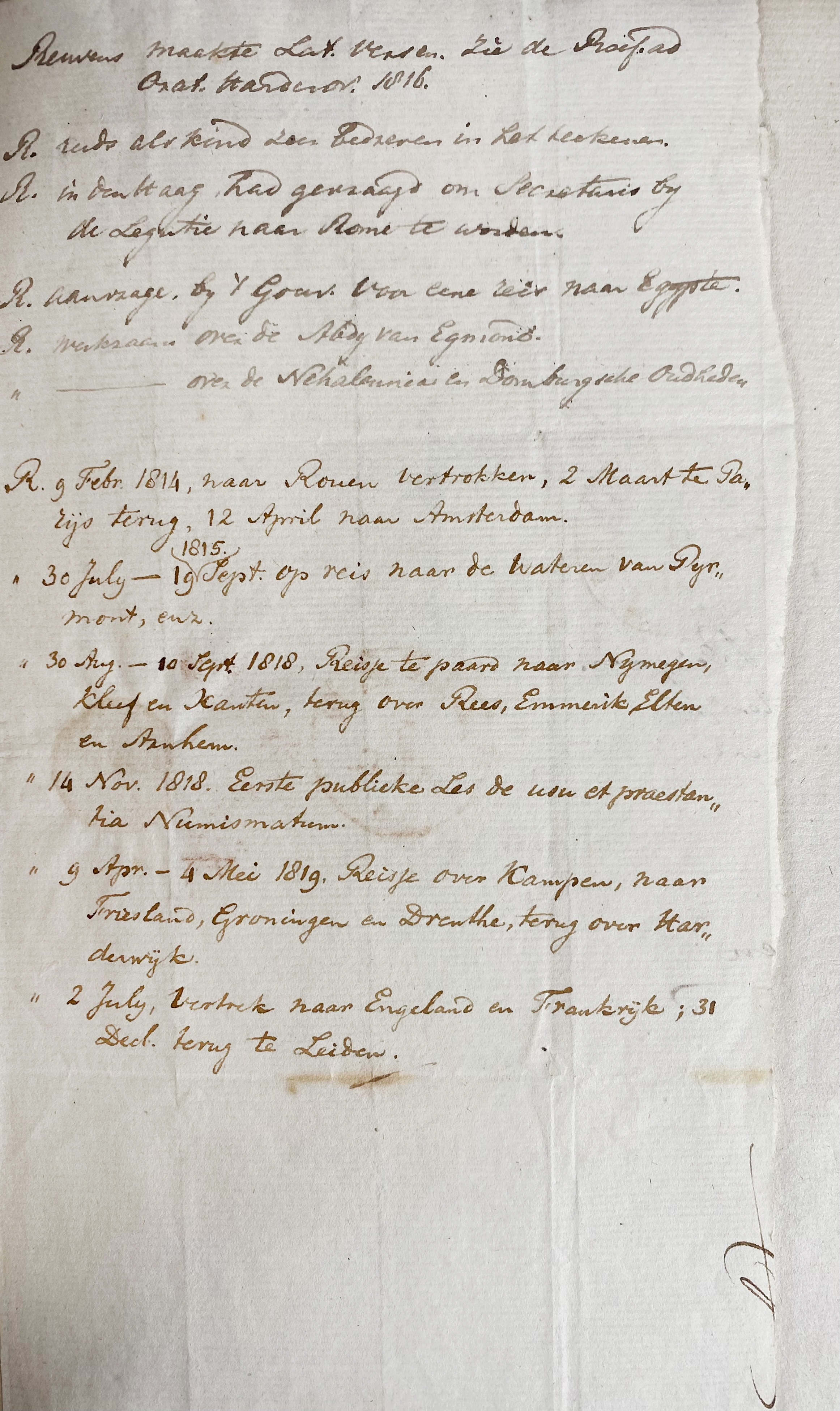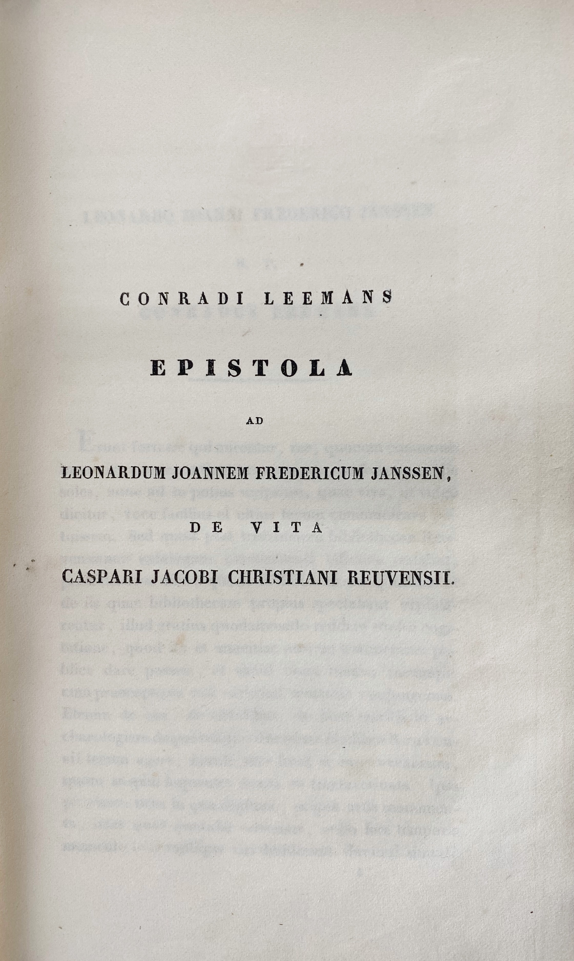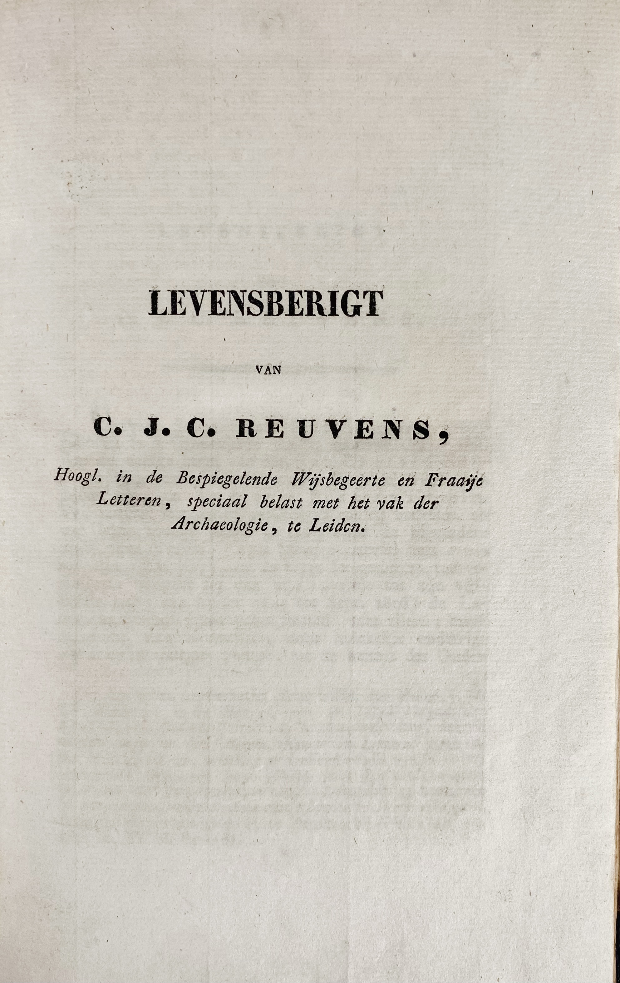 I.a.: BERGMAN, J.T. Levensberigt van C.J. - 'Notice nécrologique' in Journal de la Haye. - Aankondiging van de Bibliotheca Reuvensiana. - Reuvens, biographisch artikel. - Leemans 'Epistola ad Leon. Jo. Fred. Janssen, de vita C.J.C. Reuvensii. - Handwritten letter by Ab. Blussé de jonge.€ 150
