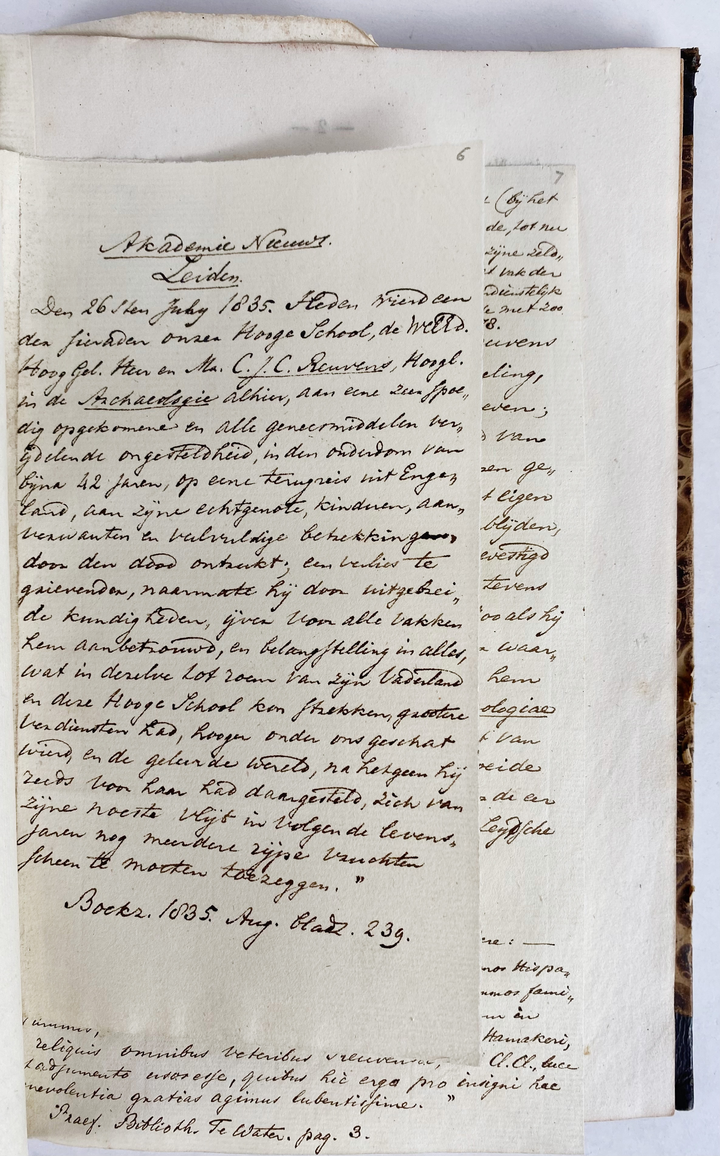 REUVENS, C.J.C. -- CONVOLUTE of small works, handwritten letters/notes, newspaper articles, all related to the death of C.J.C. Reuvens, collected (& partly written) by J.T. Bergman. (c. 1835-39). Cont. hcf.