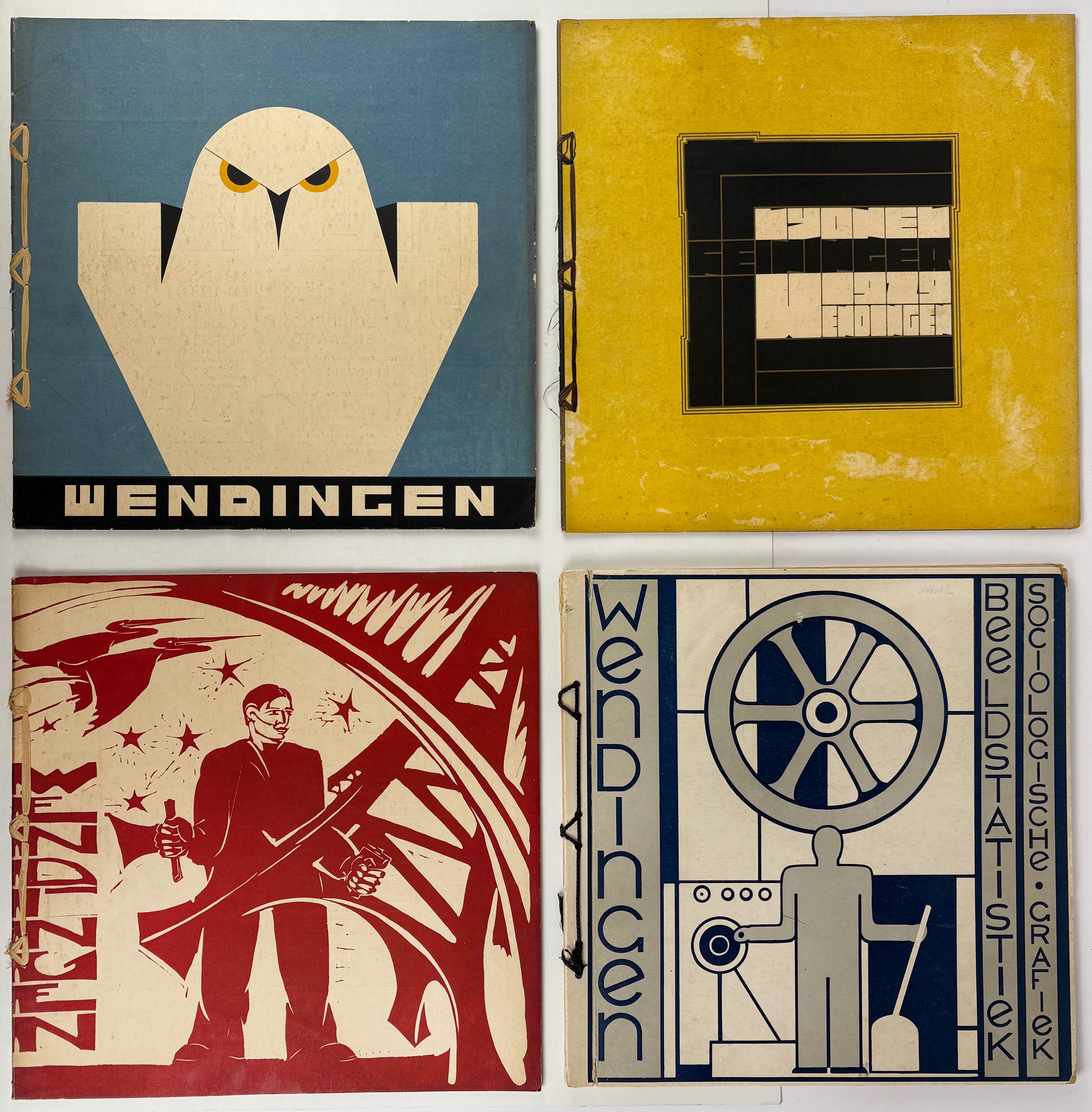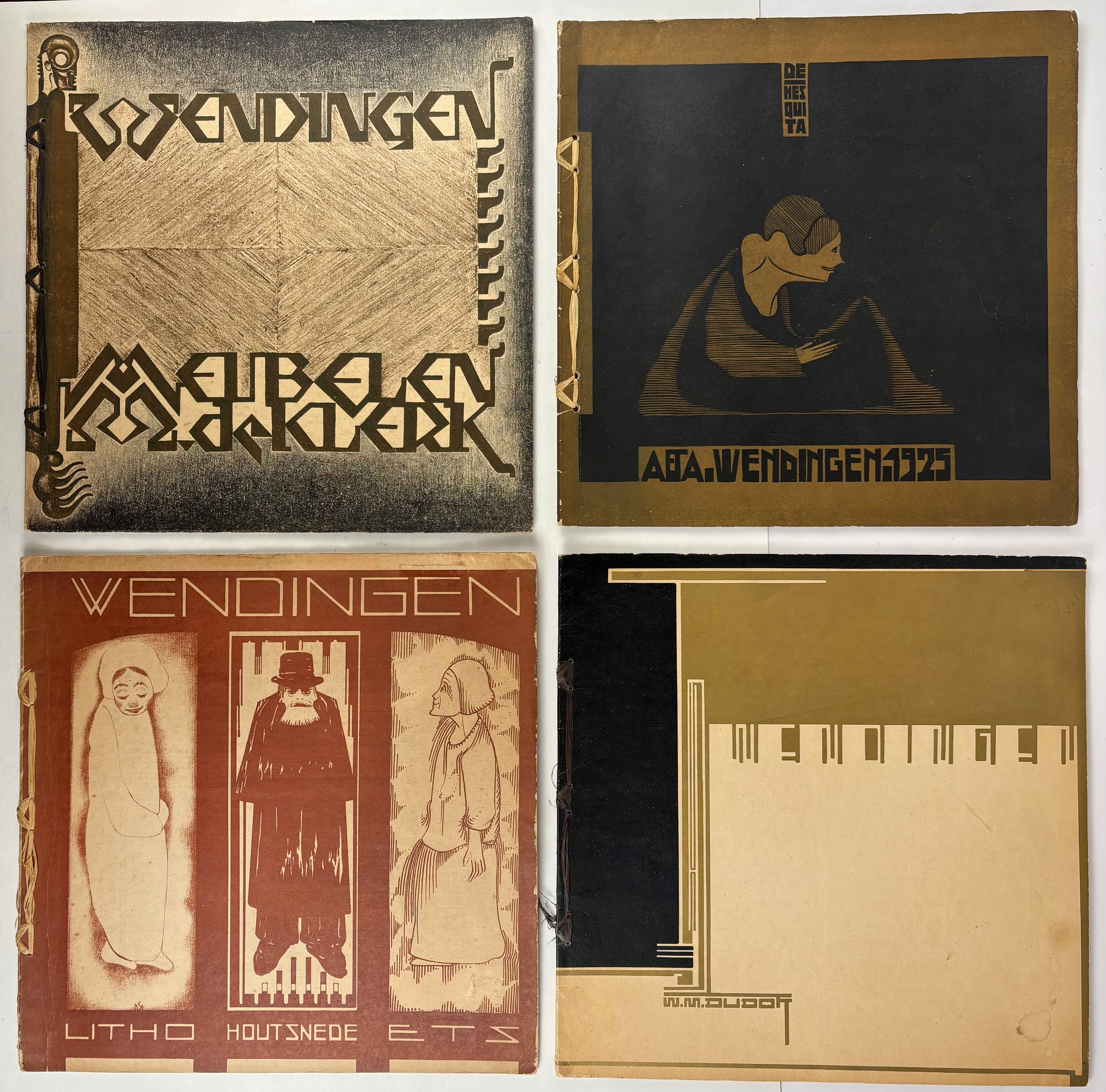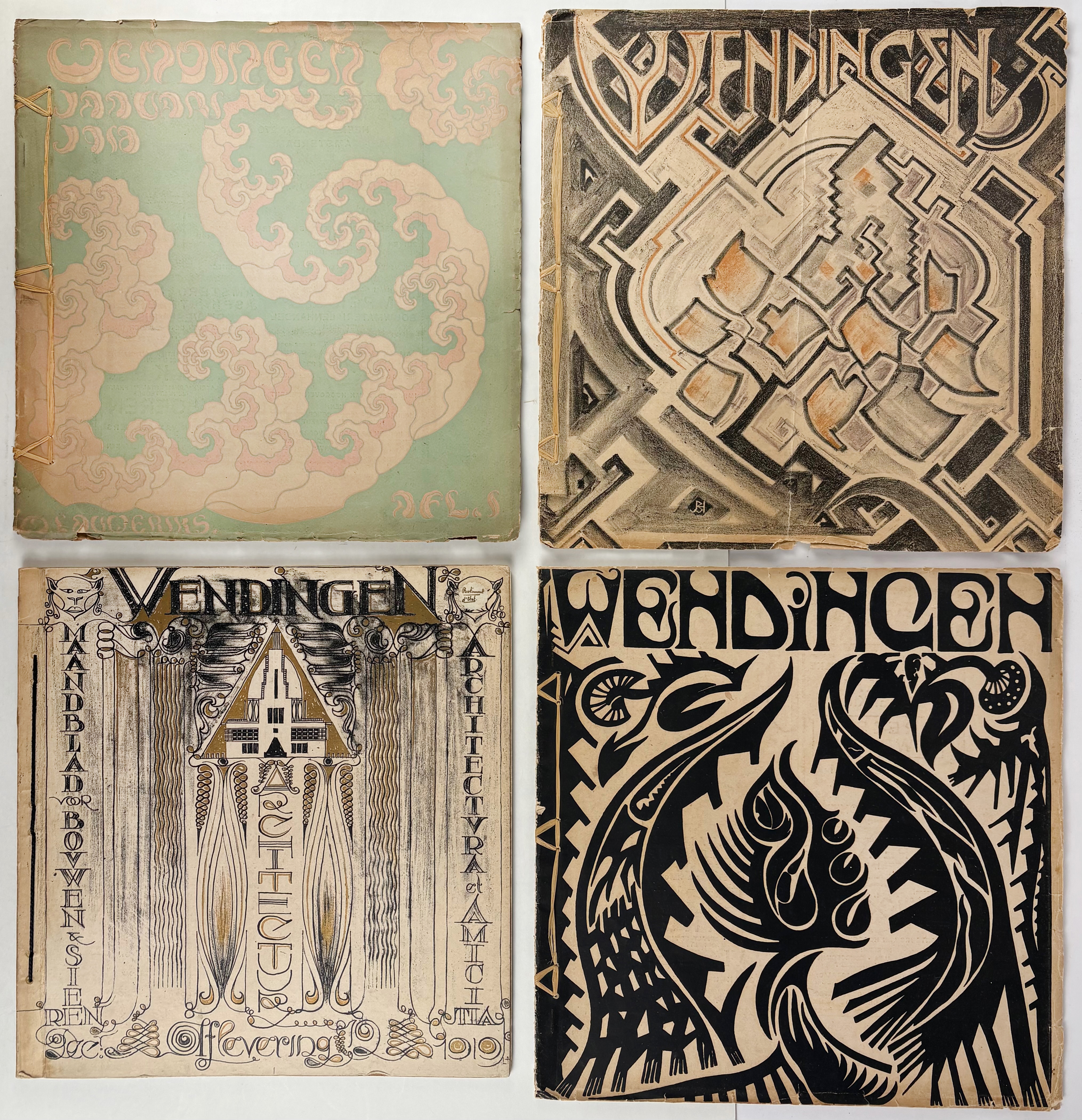 PERIODICALS -- WENDINGEN. Maandblad voor bouwen en sieren van Architectura et Amicitia. Ed. H.Th. Wijdeveld. Vol. 1-12. Amst./Santpoort, De Hooge Brug/C.A. Mees, 1918-1930. Total of 89 issues, (96 incl. duplicates and variants). Prof. illustr. Lge-4°. Or. stab sewn (lithogr.) wrps. (86)/or. stab sewn binds. (10) w. raffia threading. (Wrappers of some 16 covers frayed/dam. along borders (espec. the earlier years), 9 issues w. broken raffia threading, and 4 w. some light degree of staining, as always slightly foxed/browned in places). Each issue separately filed in plastic filing bag.