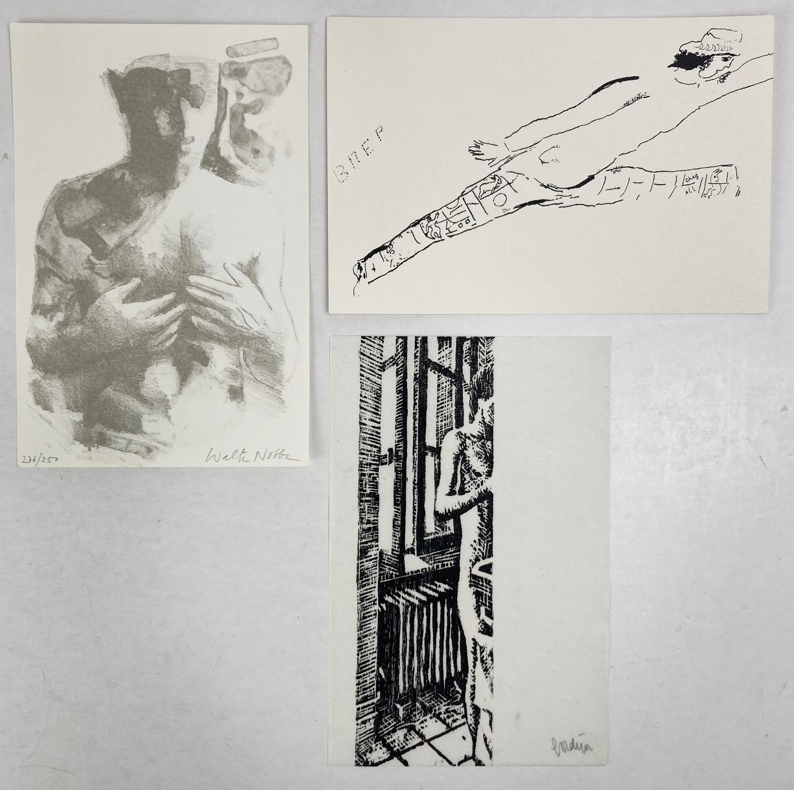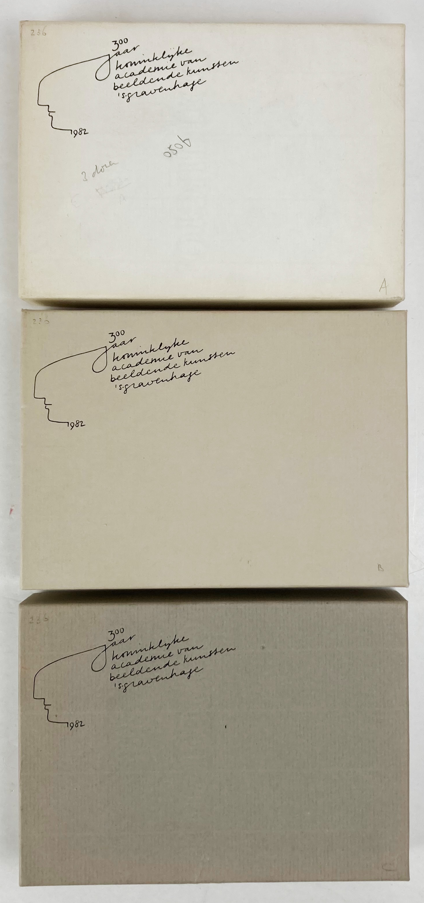 300 JAAR KONINKLIJKE ACADEMIE van Beeldende Kunsten te 's Gravenhage, 1982. 3 series of 3 small prints each and 3 colophon lvs. Prints partly signed in pencil & partly in the print. 150 x 100 mm. Loose as issued in or. cardboard box. (Pencil notes on 1 of the boxes).