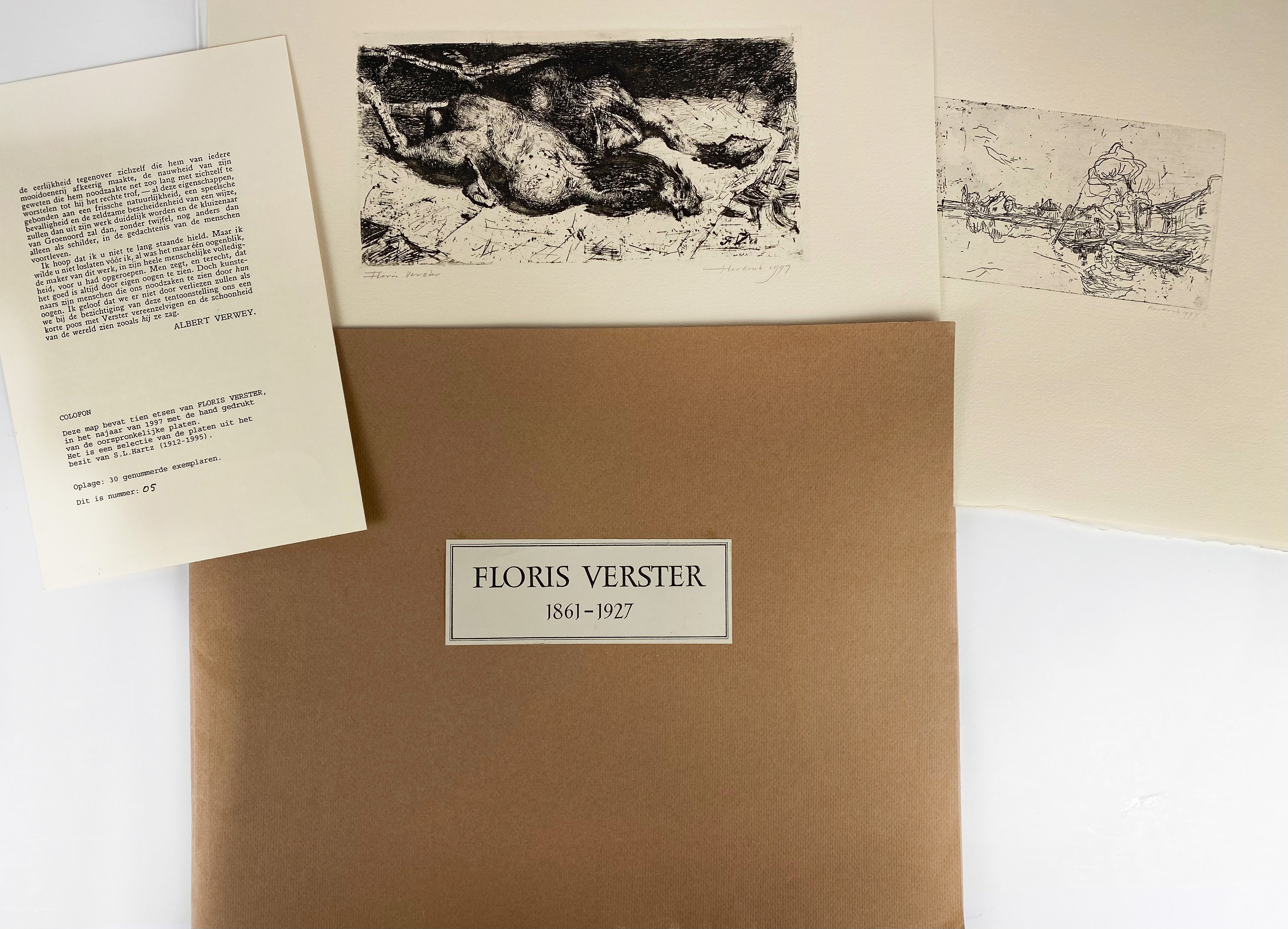 VERSTER, Floris (1861-1927). 10 etchings printed from the or. plates (from the collection of S.L. Hartz) each w. "Floris Verster" & "Herdruk 1997" in pencil below, w. loosely inserted booklet by A. Verwey, numb. 5/30. 400 x 310 or 310 x 400 mm. Fol.-obl. In or. brown paper portfol.