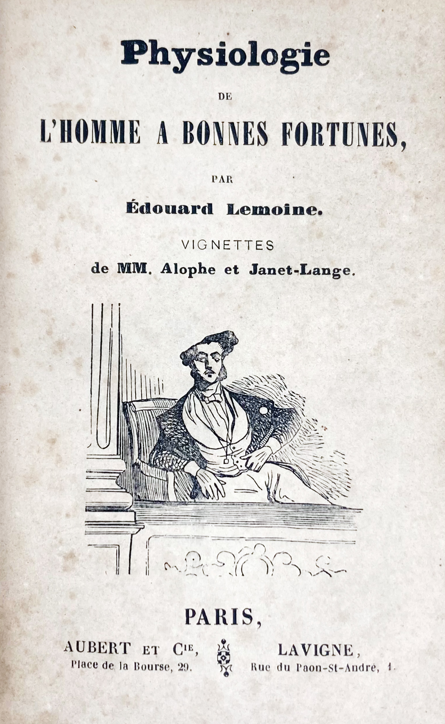 Ad 1: I.a.: HUART, L. Physiologie de l'étudiant - Id., Physiologie de le Médécin . - M. de BALZAC. Physiologie de l'employé. - F. SOULIÉ. Physiologie du Bas-Bleu. - E. LEMOINE. Physiologie de l'homme a bonnes fortunes. - Amusing satirical descriptions of Parisian types, which appeared first in the "Bibliotèque pour rire" and where an extremely popular genre in1850s France. The pieces where illustrated by well-known artists of the time like Daumier, Gavarni, A. & J. Lange, Trimolet, a.o. - Ad 2: A popular and curious work, partly couched as a droll essay and partly imbued with an almost ethnographic spirit, on taste as a philosophical concept and art, food and its enjoyment and function in (French) society and more.