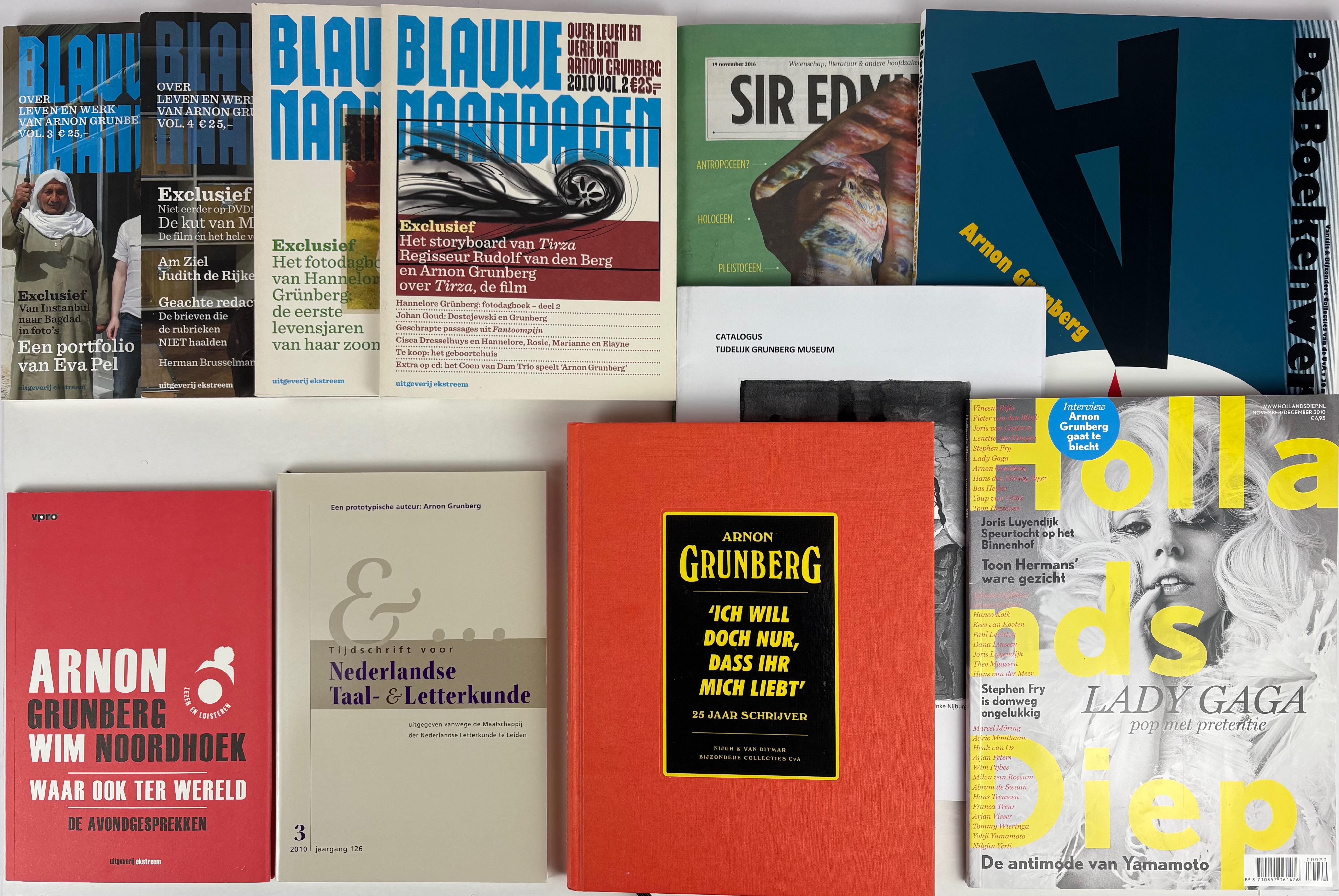GRUNBERG -- COLLECTION of 14 publications on G., incl. bibliographies. 1998-2016. Various sizes. -- Added: Various (promotional) items relating to Grunberg (i.a. Miniature leporello on the bottom of a matchbox (2 copies), published by MatchBoox; poster promoting 'Tirza' 630 x 480 mm; 'Onder de mensen', 2 cd audiobook). -- (21).