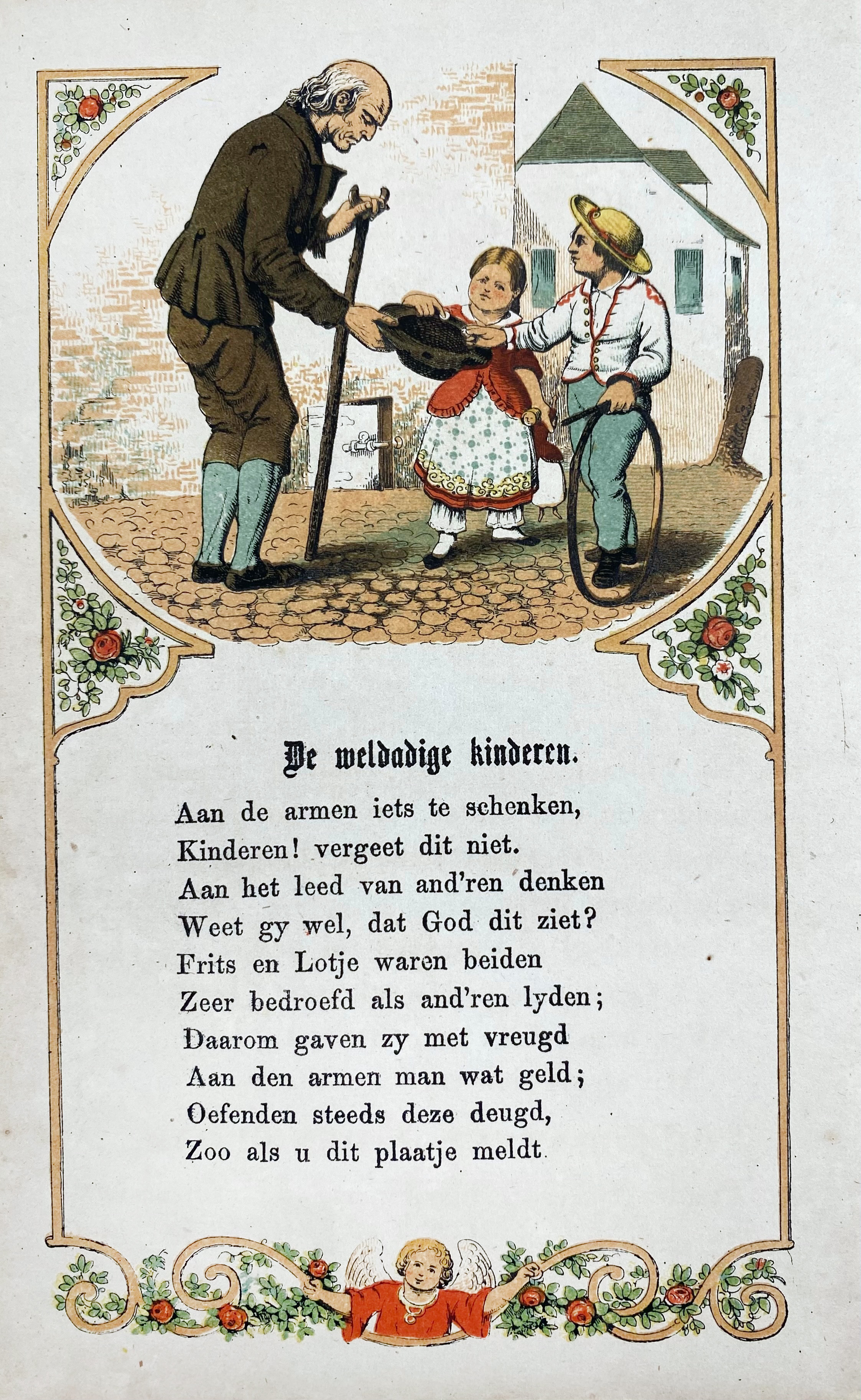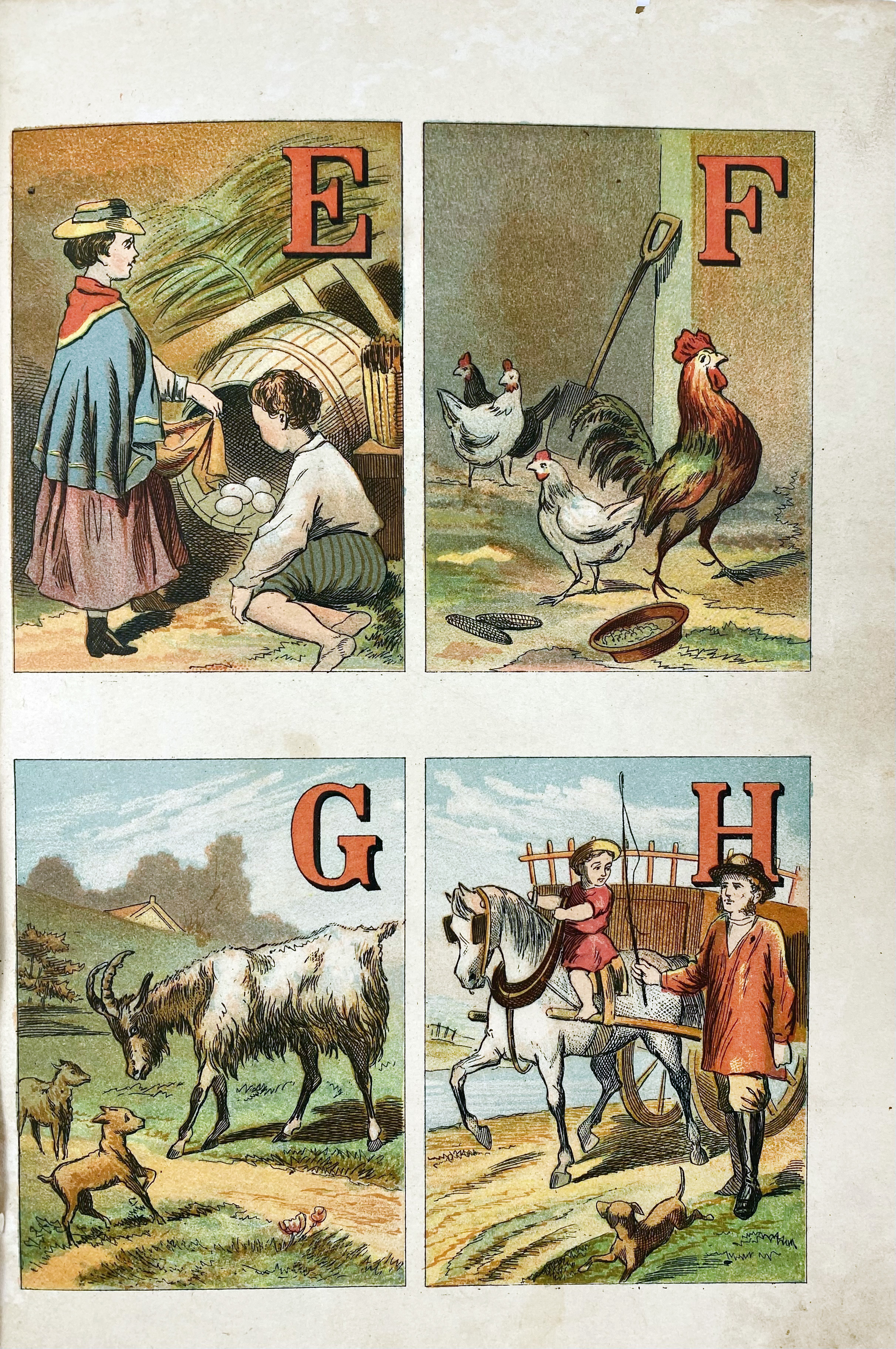 ABC BOOKS -- GEILLUSTREERD ALPHABET in 24 Tafereeltjes voor de Jeugd. Tiel, H.C.A. Campagne & Zoon, (1878). (6) text-lvs. W. 6 chromolithogr. plates w. 24 ills. Or. pictorial wrps. (Usual wear and tear, a bit fingersoiled). -- NIEUW PRENTEN AB boek voor brave kinderen. III. Issum, Mühlen & Leendertz, (c. 1860). 16 pp. W. 8 cold. lithographs. Sm-8°. Or. pictorial wrps. -- (2).