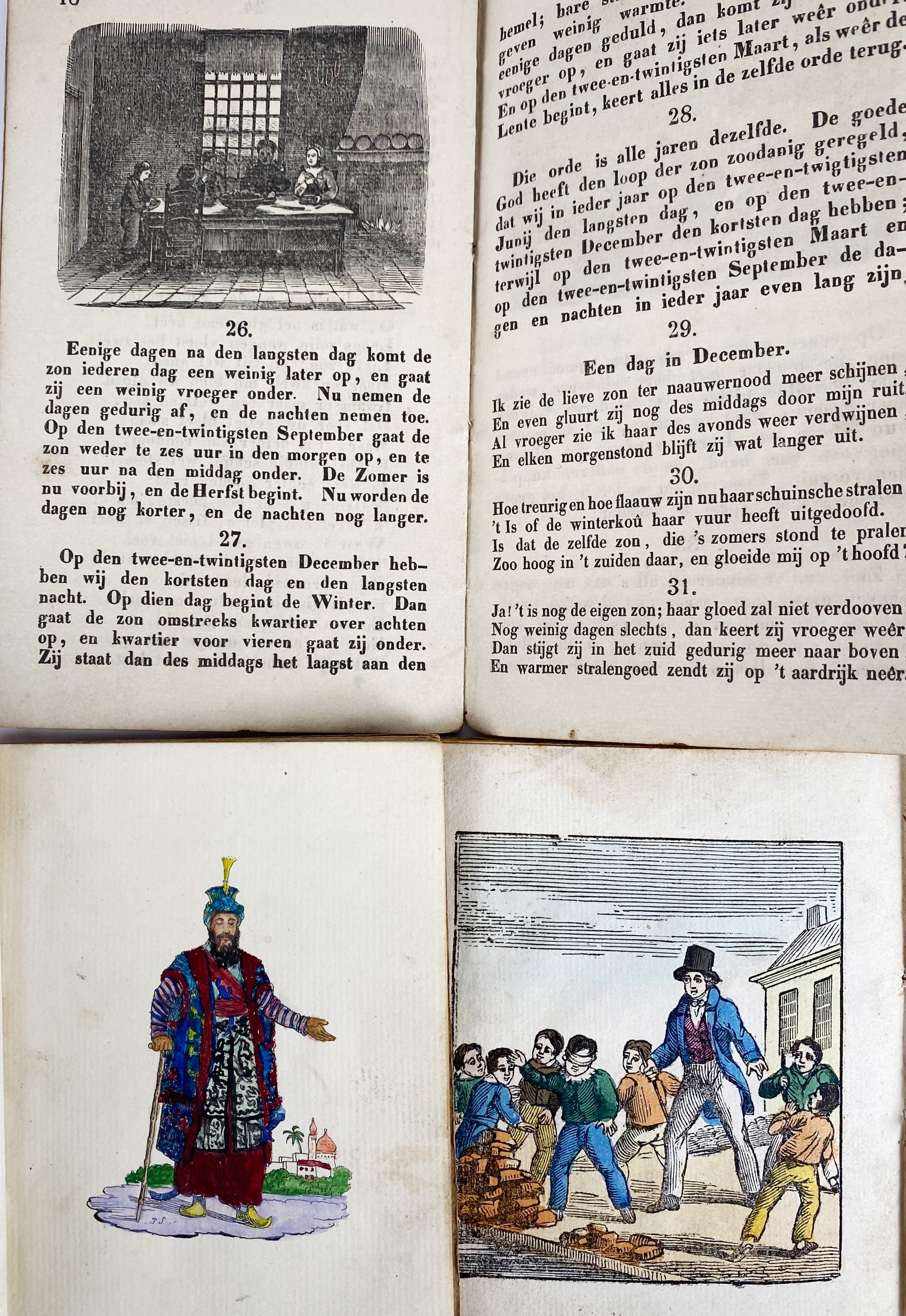 LEESOEFENINGEN voor de jeugd, tweede vervolg op de negen leestafels van den heer Prinsen. 6e stukje. 6e dr. Deventer, J. de Lange, 1861. W. wood-engr. ill. Wrps. (Wrps. loose). -- Added: G v. SANDWIJK. De kleine mimiek of de vrolijk zingende knaap. Purmerend, Broedelet & Rijkenberg, (c. 1832). W. 16 (handcold.) plates. 16°. Or. printed wrps. -- DRIE VERTELLINGEN, voor kinderen. Delft, A. v. Alphen, (c. 1830). W. 4 handcold. plates. 16°. Or. printed wrps. (A bit stained). -- (3).