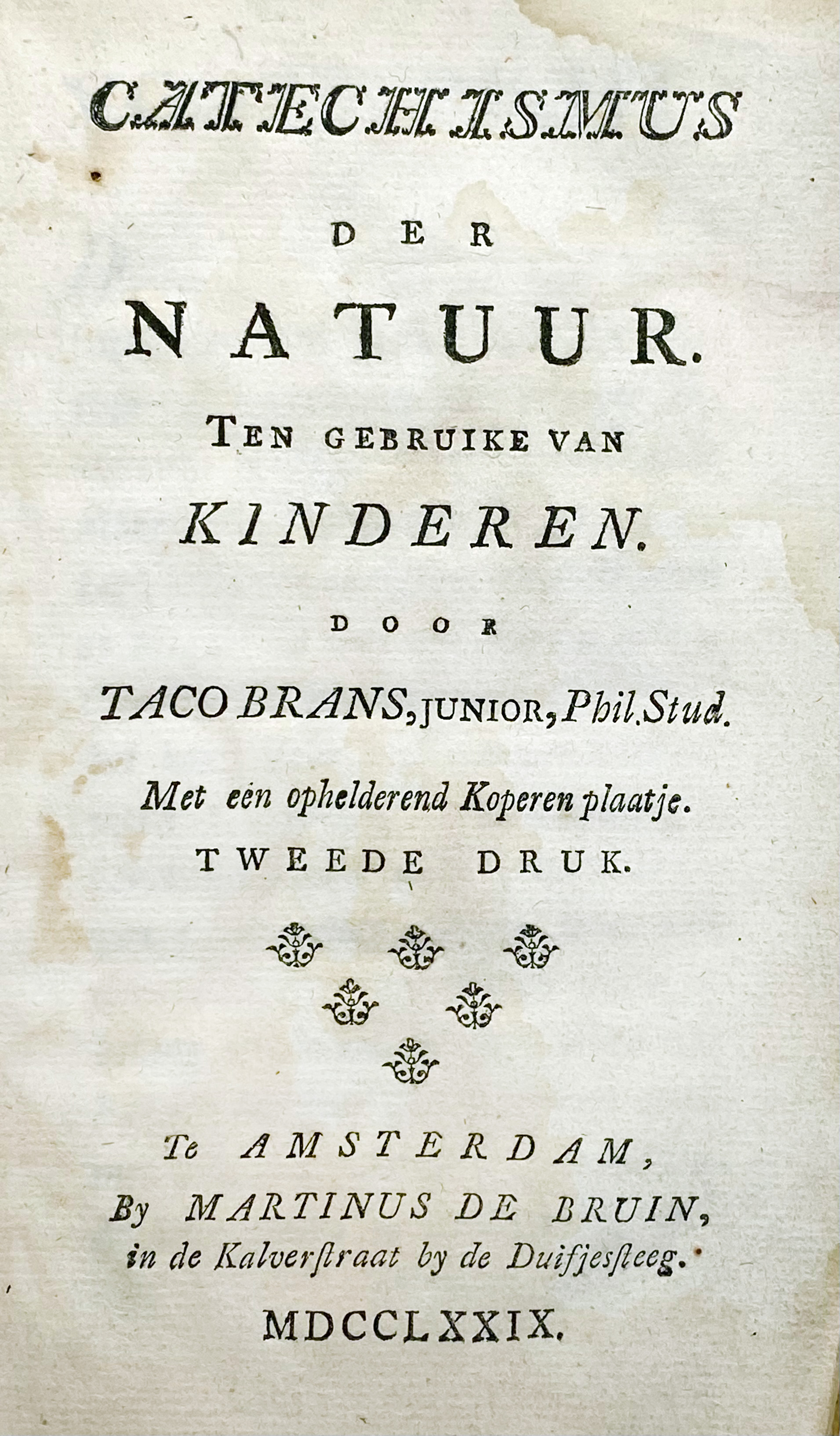 This book was seen as an imitation of J.F. Martinet's Kleine Katechismus der natuur voor kinderen. Martinet believed some booksellers opposed his printer Johannes Allart and retaliated by publishing a similar work under Brans' name. Brans claimed his manuscript was finished before he knew of Martinet’s project, but on a friend's advice decided to publish anyway. The true identity of "Taco Brans Jr." is uncertain, though there are indications it may have been the Patriot writer Pieter ’t Hoen (1744–1828). - Buijnsters, Bibl. Ned. school- en kinderboeken, 551; Spoelder 645 (Middelb. 6).€ 120