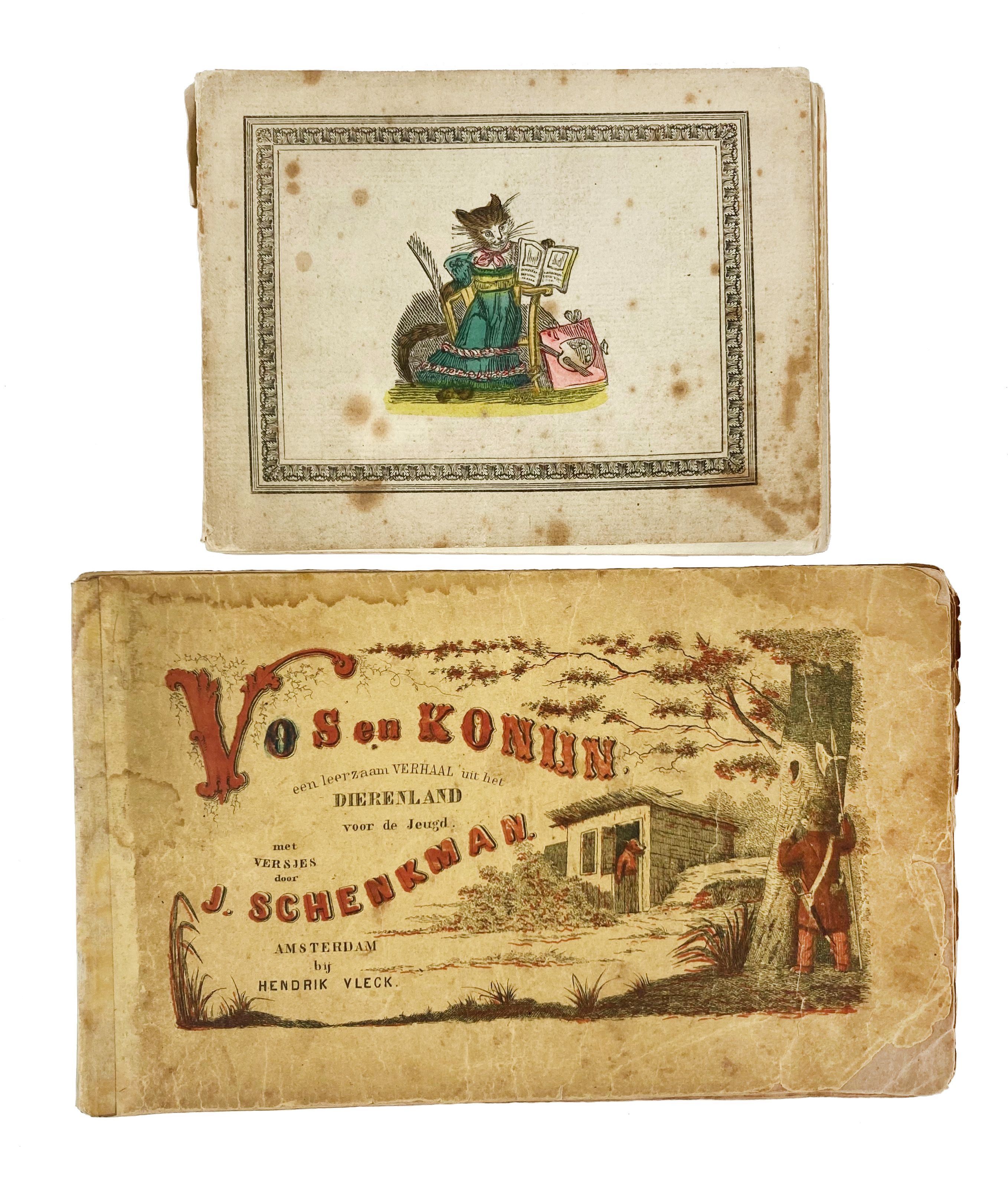 MÜLLER, J.F.L. De kluchtige poes en het hondje. Een tegenhanger van De Kluchtige aap en het poesje. Amst., J. Guijkens, (1838). W. 16 full-p. engr., all cold. by hand. Sm-8°-obl. Or. limp brds. (Brds. w. foxing, textblock loose). -- J. SCHENKMAN. Vos en Konijn. Een leerzaam verhaal uit het Dierenland voor de Jeugd. Amst., H. Vleck, (1862). 31 pp. W. 4 handcold. plates. Owrps. (Wrps. browned & reinforced w. paper, spine w. sellotape, bindwork delicate, some foxing). -- (2).
