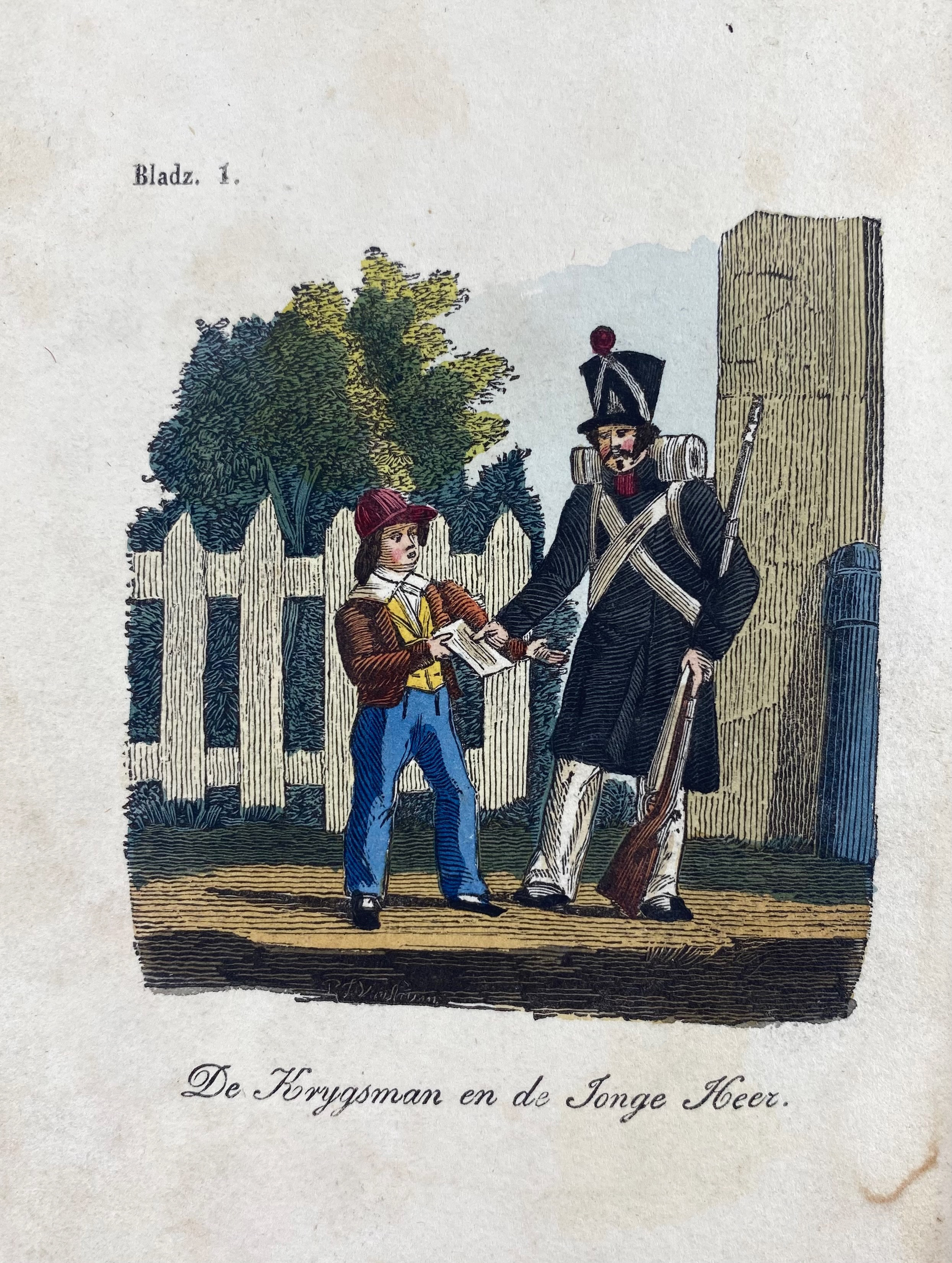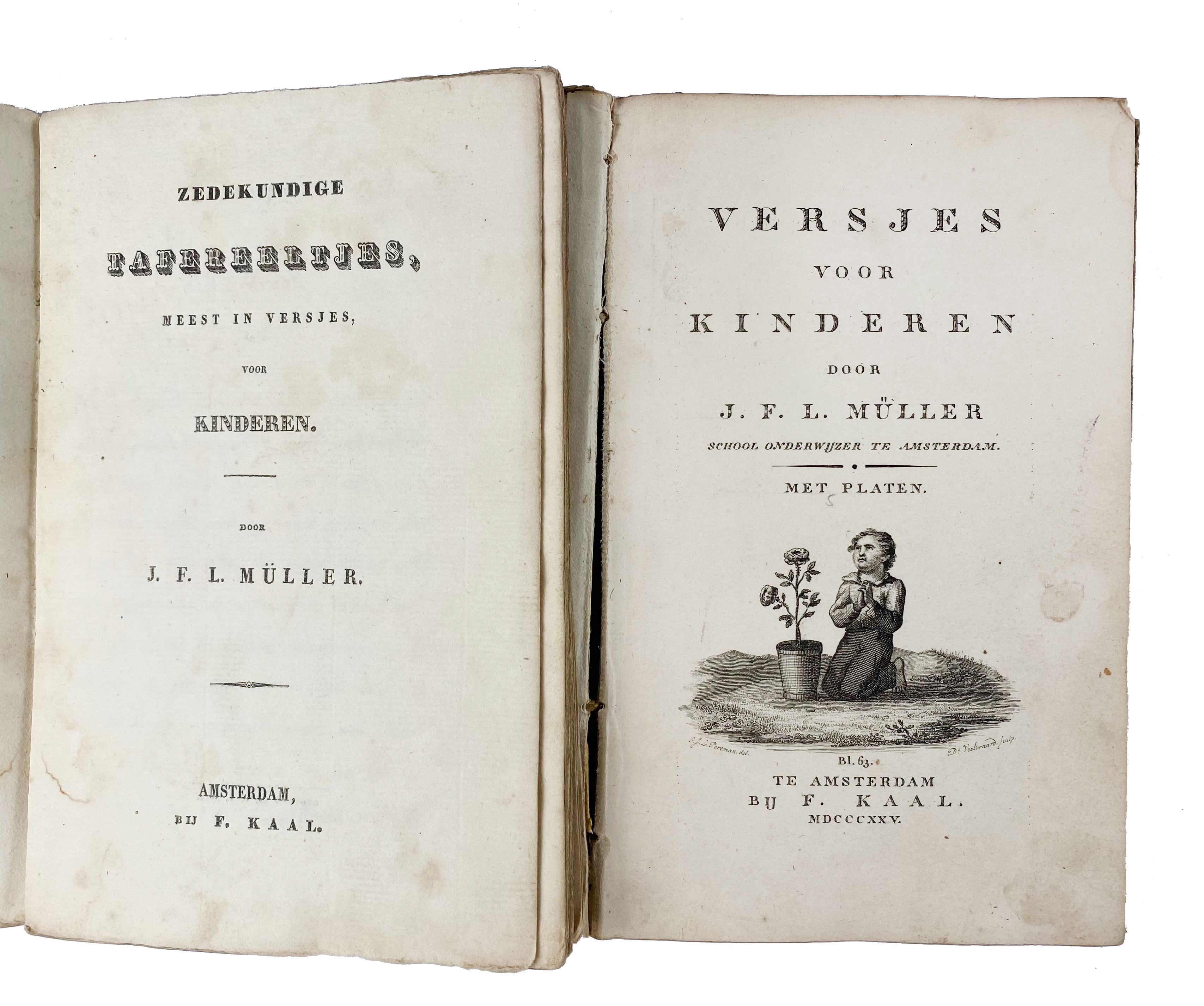 MÜLLER, J.F.L. Versjes voor kinderen. Amst., F. Kaal, 1825. W. engr. ti. & 5 engr. plates. Or. printed brds. -- Id. Zedekundige tafereeltjes. Amst., F. Kaal, (1830). W. 6 handcold. plates. Or. printed brds. (Spine ends dam., lower margin faintly stained). -- (2).