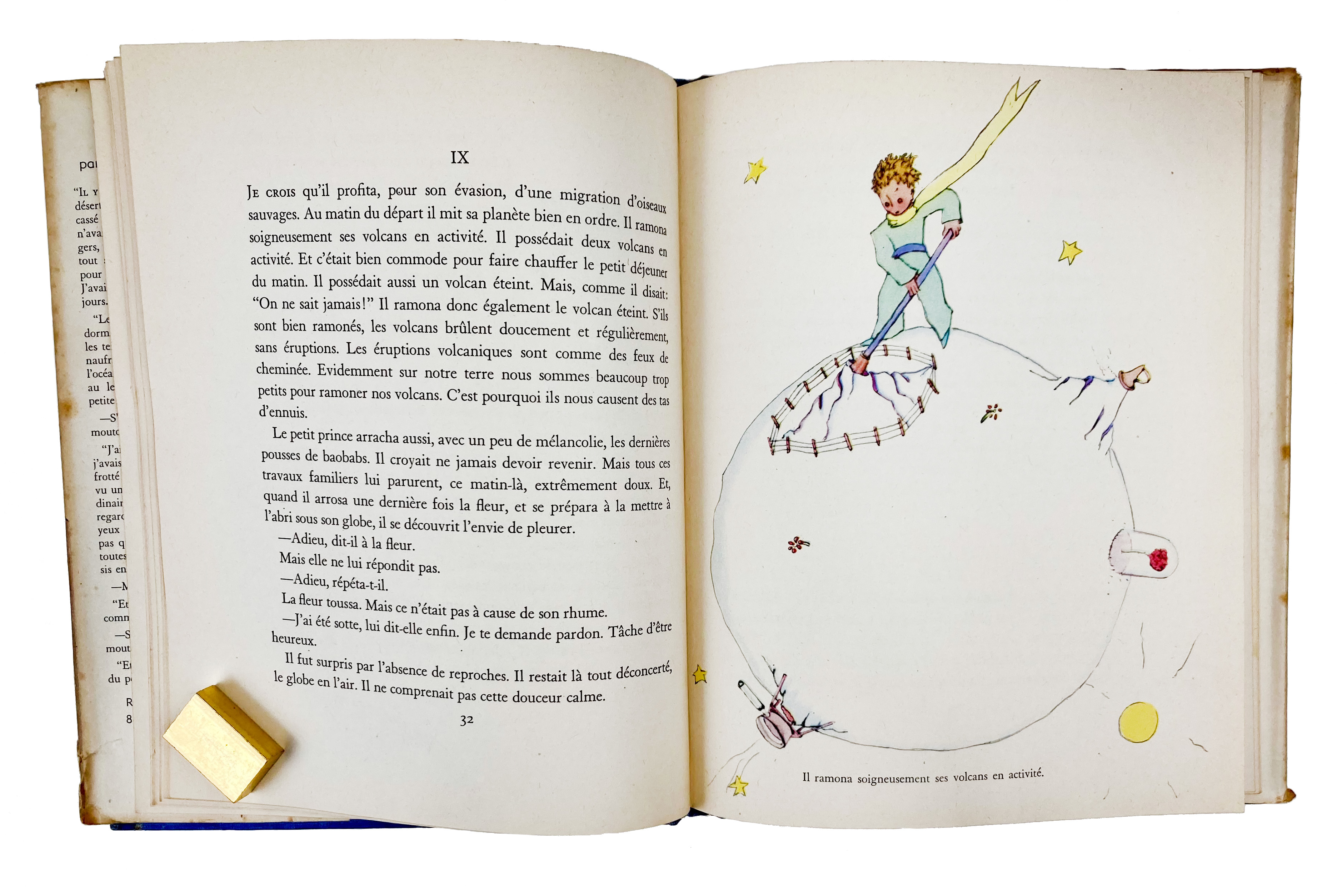 SAINT-EXUPÉRY, A. de. Le Petit Prince. 3rd printing. N.Y., Reynal & Hitchcock, (1943). 91, (1) pp. W. illustr. by the author. Or. blue cl. w. red image & dust-j. (Dust-j. w. yellowed spine, some foxing, dam. to extremities, cloth w. spotting & worn corners, endpapers w. some yellowing, bookplate Colette Bruvry on paste-down, autograph dedication to "the Little Bruvrys" by Victor Abrahamson, inside clean & without blemish).