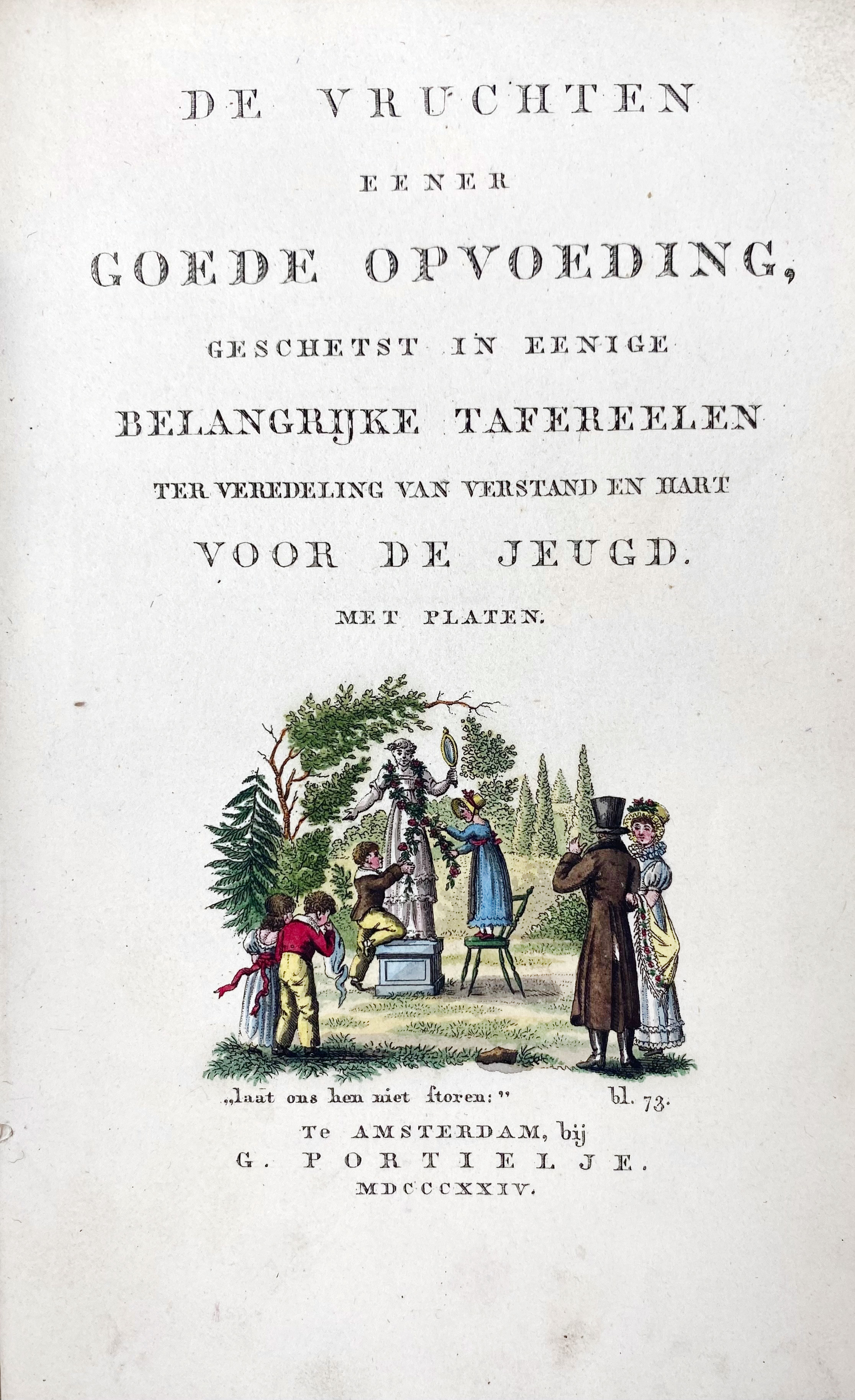 (WILMSEN, P.F.). De familie Grasveld, eene onderhoudende geschiedenis voor leerzame kinderen. Amst., J.P. Wijsmuller, (1823). W. engr. ti. w. handcold. ill. & 4 handcold. plates. Or. printed brds., uncut. (Spine partly gone). -- (G. ENGELBERTS GERITS). De vruchten eener goede opvoeding, geschetst in eenige belangrijke tafereelen ter veredeling van verstand en hart. Amst., G. Portielje, 1824. W. engr. ti. w. handcold. ill. & 6 handcold. engr. plates. Or. printed brds., uncut. (Spine sl. worn). -- T. v. SPALL. De kinderen zoo als zij zijn; of gezellig en nuttig onderhoud voor de jeugd. The Hague, A. Kloots, 1835. W. 4 handcold. engr. plates. Or. printed brds. -- And 1 o. (4).