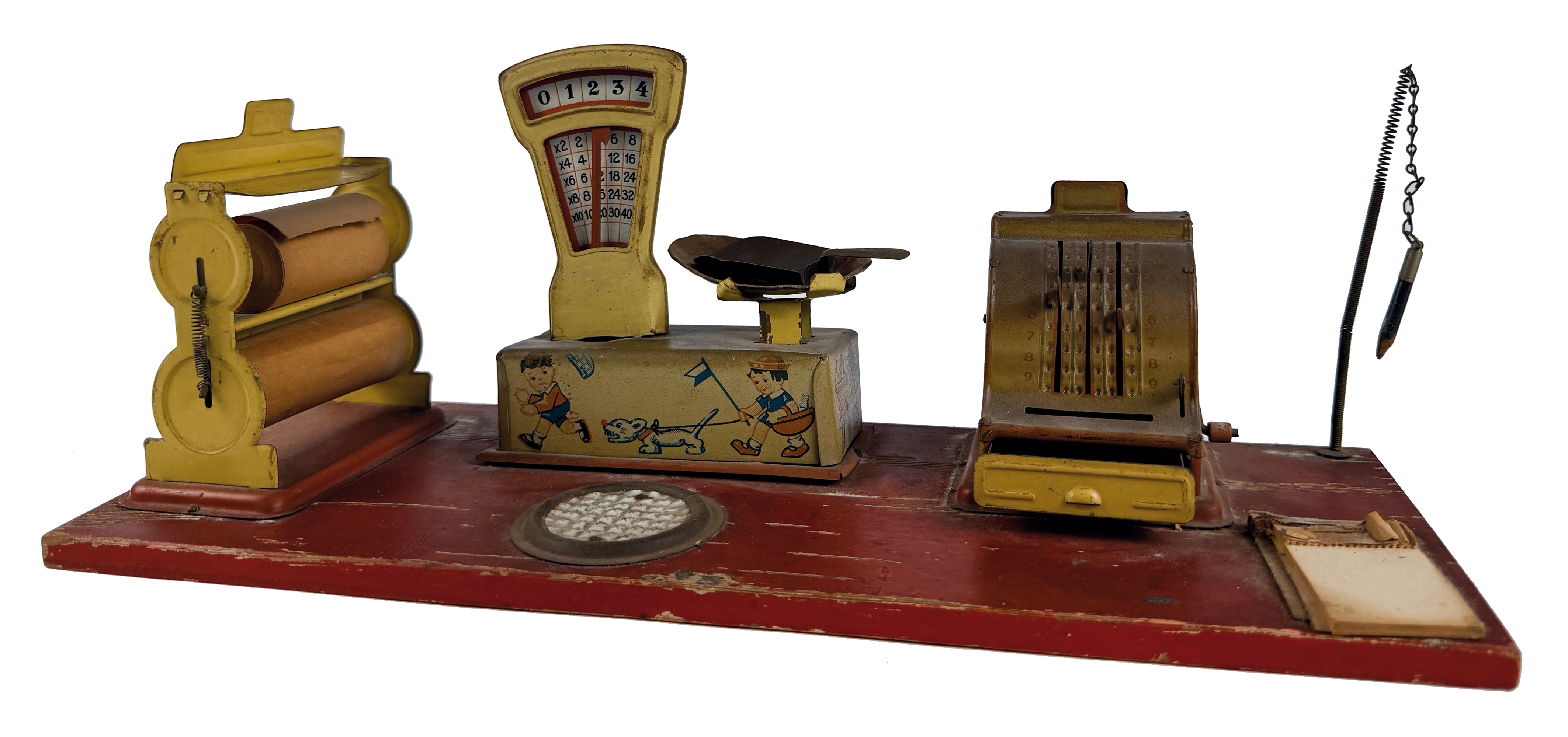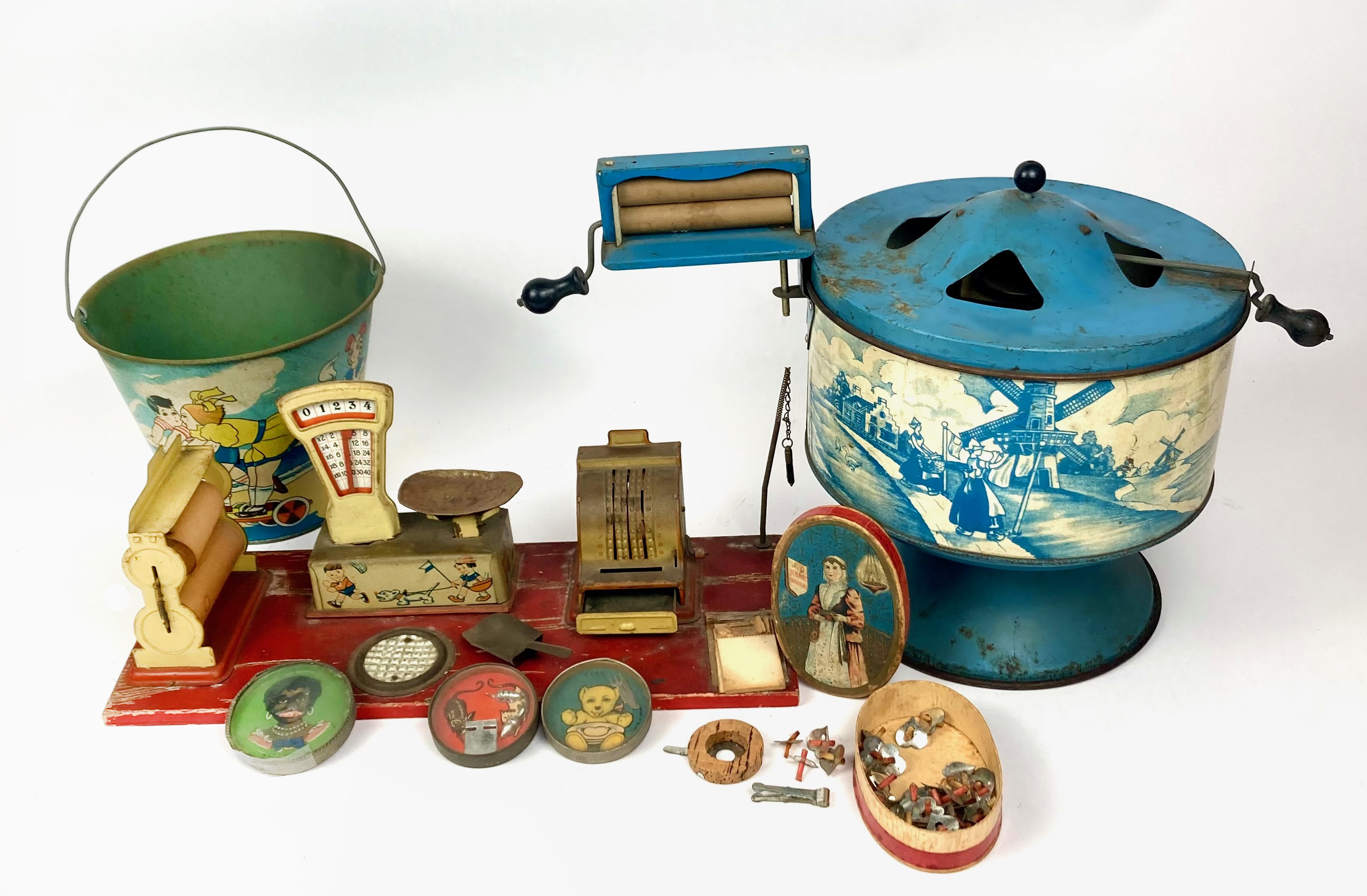 COLLECTION OF TOYS & MINIATURES. (Early 20th c.). -- Incl.: MODEL SHOPFRONT. (Early 20th c.) Scale, cash register, roll holder w. 2 or. rolls of wrapping paper, small notepad & pencil in holder, mounted on a wooden base. (360 x 150 mm base size). Tin plate, wood, paper. -- DEXTERITY PUZZLES. D.R.G.M., German, (Early 20th c.). Three dexterity games w. mirror backing. (650 & 550 mm diameter). -- MODEL WASHING MACHINE & WRINGER. Wolverine Toys, (1930s). Tin drum w. Dutch motifs, wooden details. Complete w. lid, wringer & inside mechanism. (3000 mm high). -- TIN BUCKET w. beach scenes. INGAP, Padova, (1920s). (1500 mm high). -- NACHTLICHTEN. Cardboard box w. ca 25 candles, tweezers & candle holder. J.G. Hebart, (early 20th c.). -- And 1 o. (8).