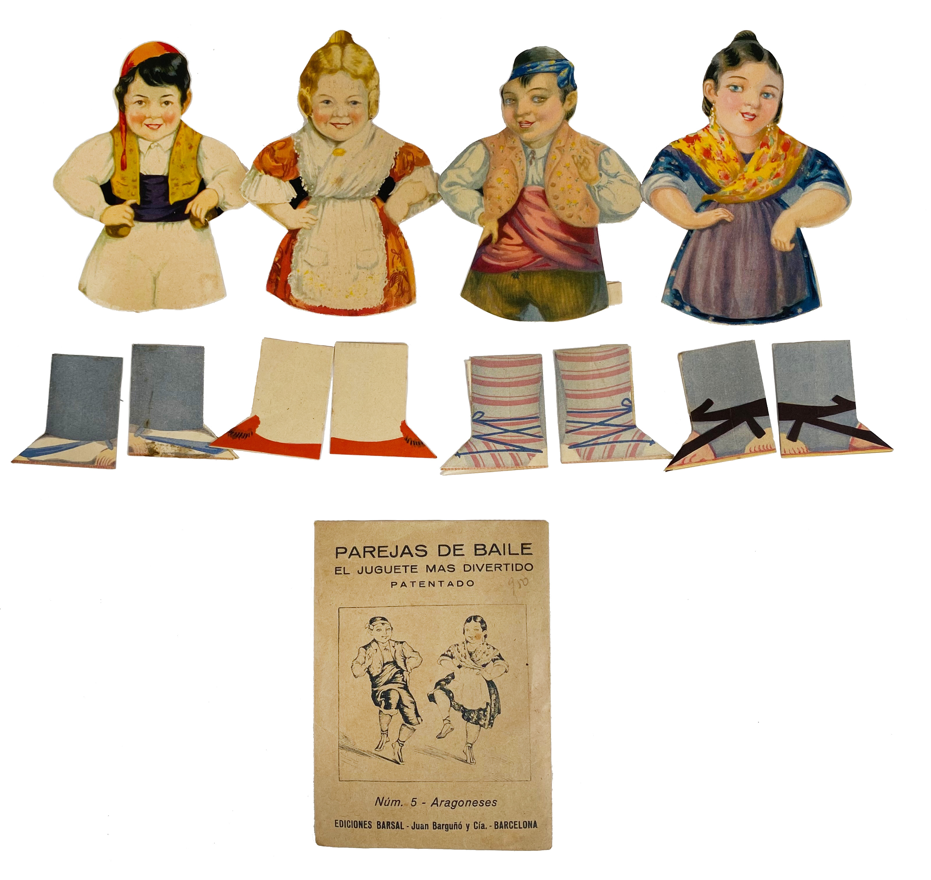 PEEPSHOWS -- TEATRO INFANTIL. N° 3: El castillo maldito. (&) N° 5: El pirata negro. Barcelona, Ed. Barsal, (1930's). Each w. 3 background scenes and 5 intermediate backdrops, 6 movement levers and 15/23 movable figures. Both w. small booklet and in or. printed envelope. -- Added: PAREJAS DE BAILE. El jugueta mas divertido patentado. Núm. 5: Aragones. (&) 6: Valencianos. (Ibid., idem, 1930's). 2 pairs of paper finger puppets: Each figure has a small strap on the back and separate paper shoes designed for the user’s fingers, allowing the dancers to "move" and perform when manipulated by hand. W. 1 or. printed envelope (Aragones). -- (3).