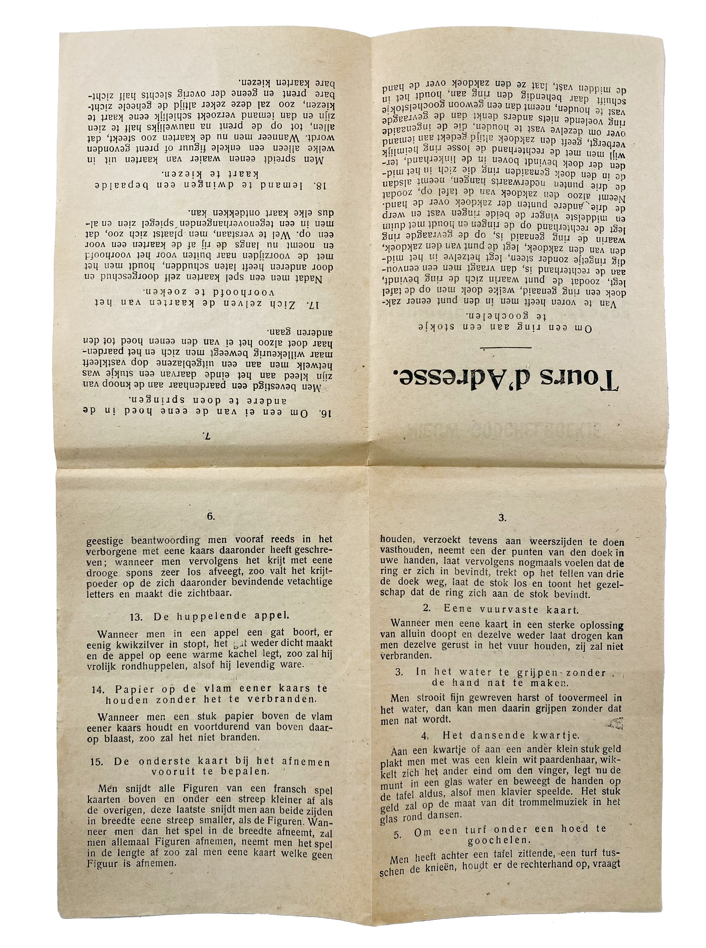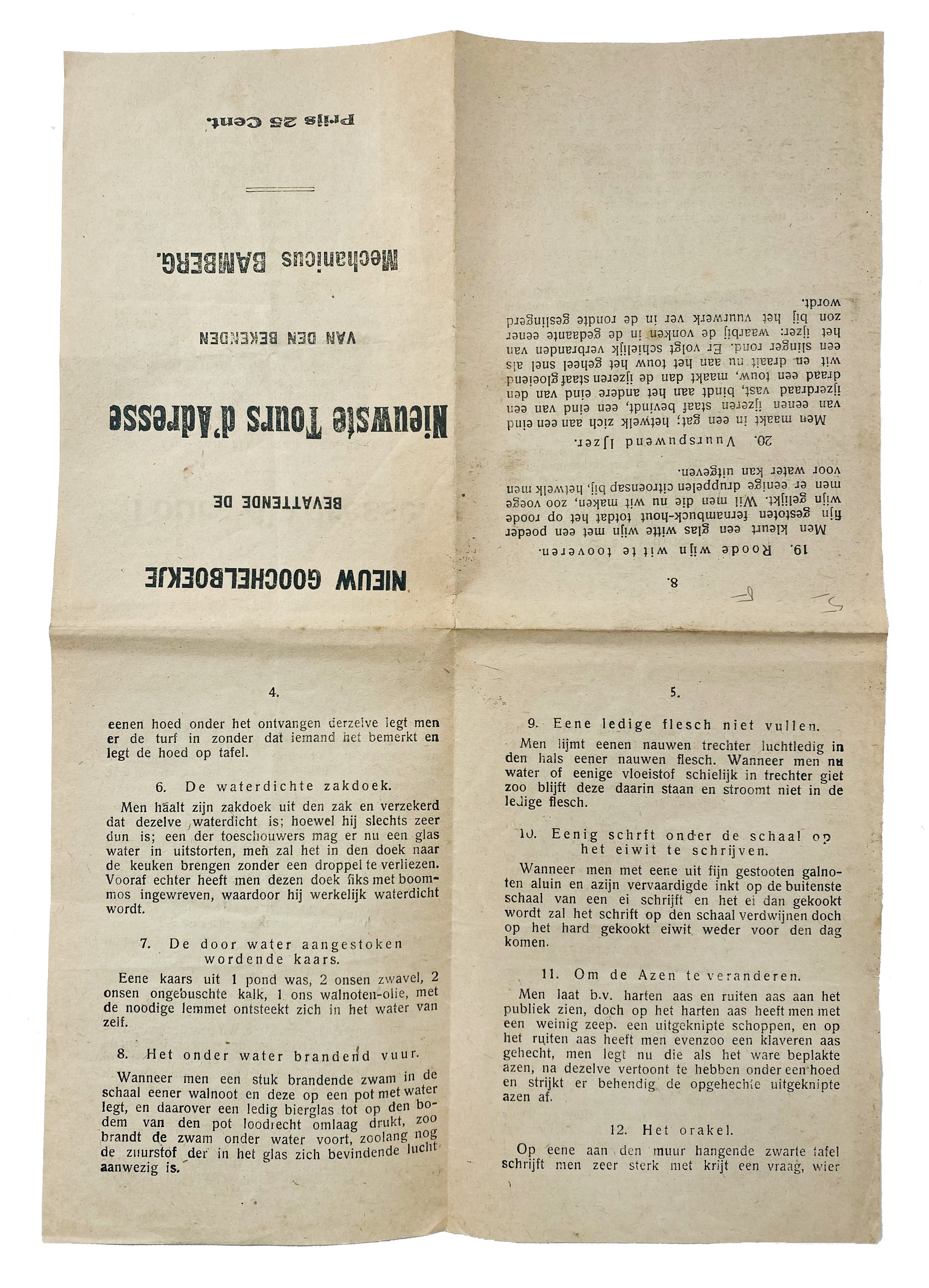 This rare booklet by David Leendert Bamberg (1787–1869), represents an early contribution to the art of magic by one of the Netherlands' most influential families of magicians. David Leendert Bamberg, son of Eliazer Bamberg, was a skilled mechanic and magician who laid the foundation for the legendary Bamberg dynasty. His innovative mechanical tricks and illusions were highly regarded in the 19th century, and this booklet offers a glimpse into the techniques and secrets of his craft. His legacy is carried on by later masters of magic, including his great-grandson Theodore Bamberg ('Okito'), one of the most celebrated magicians of the 20th century. - Extensively: Ko Sturkop, "Wees aimabel". De Bamberg-dynastie van goochelaars. - Only 1 copy in NCC (Groningen).€ 500