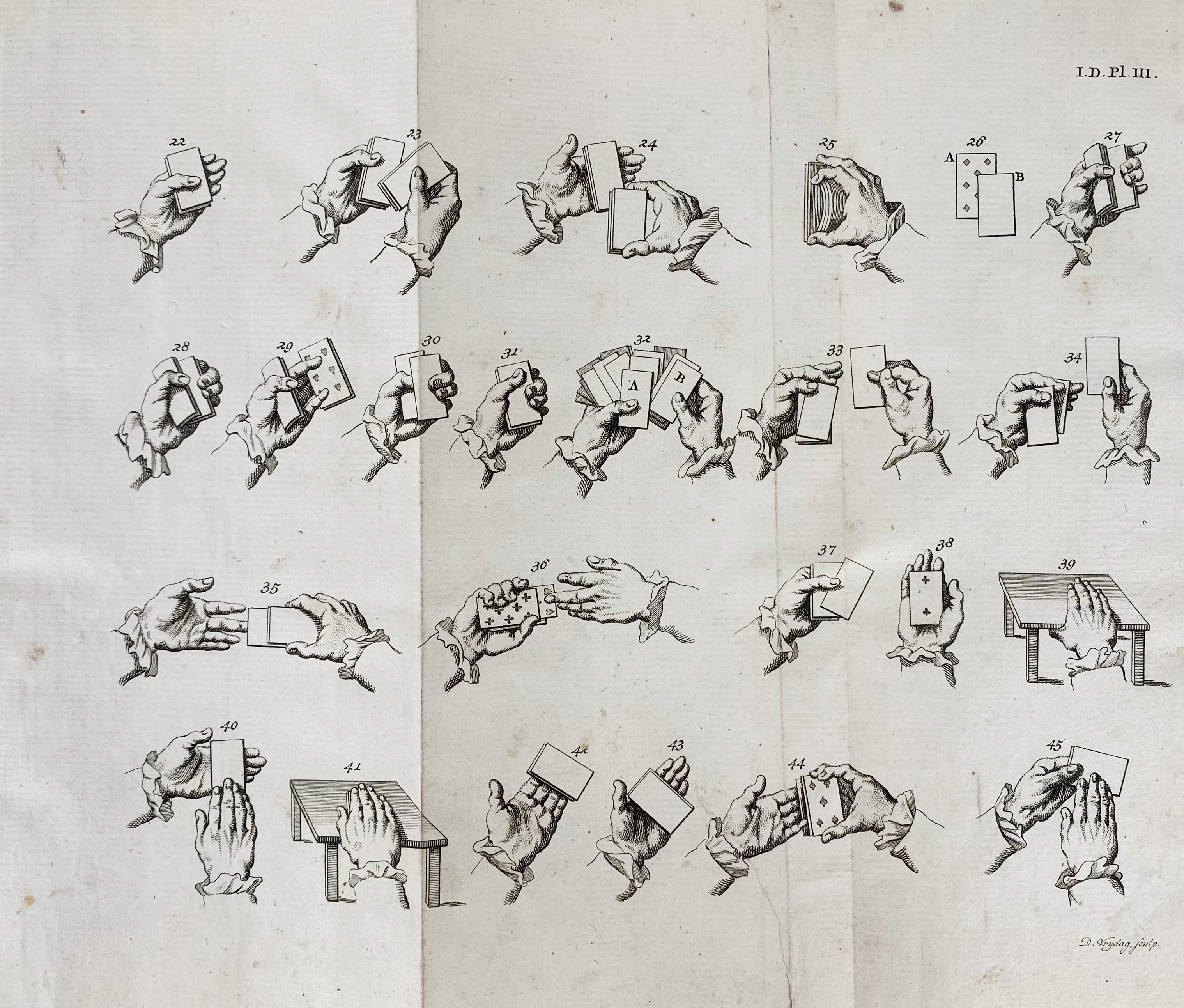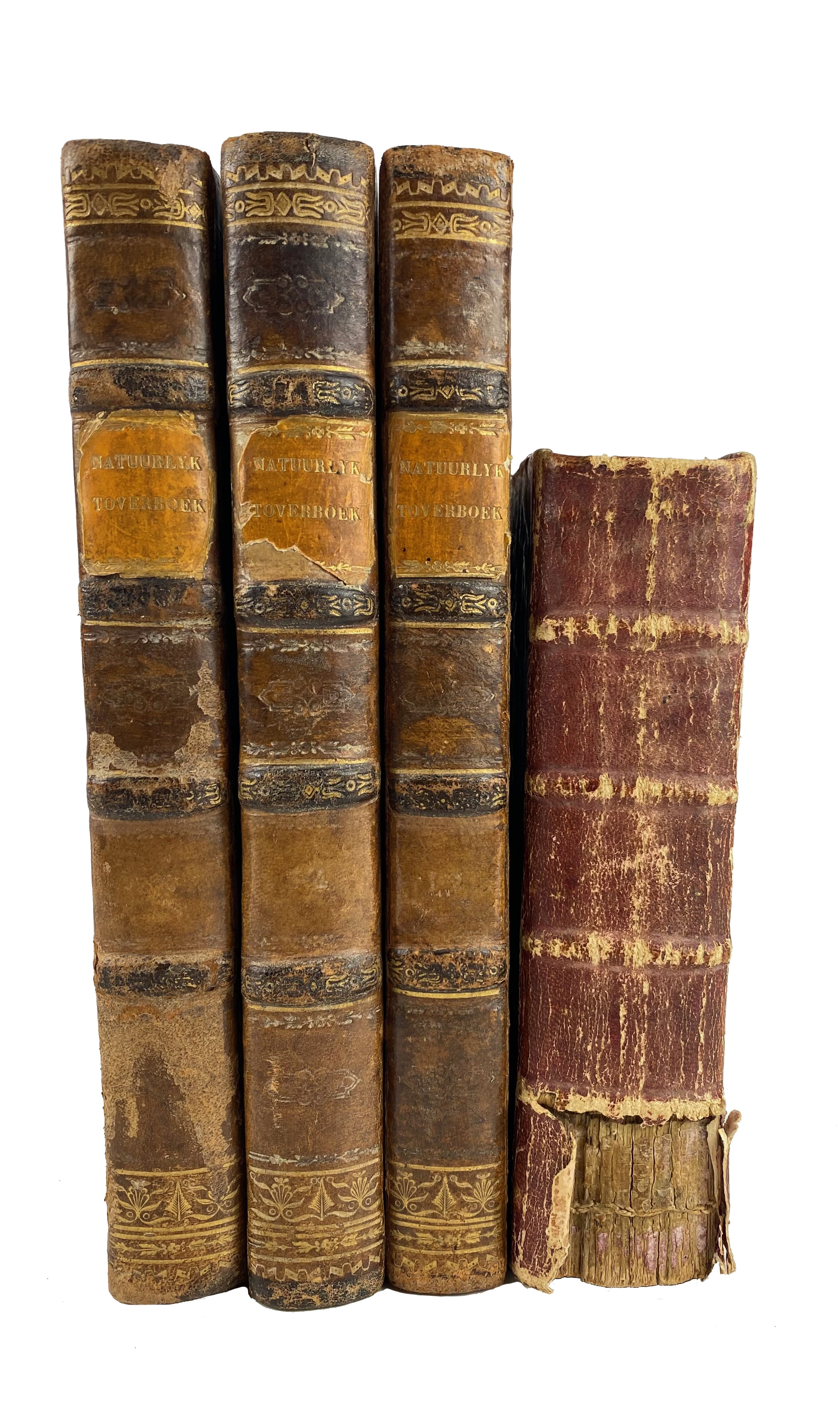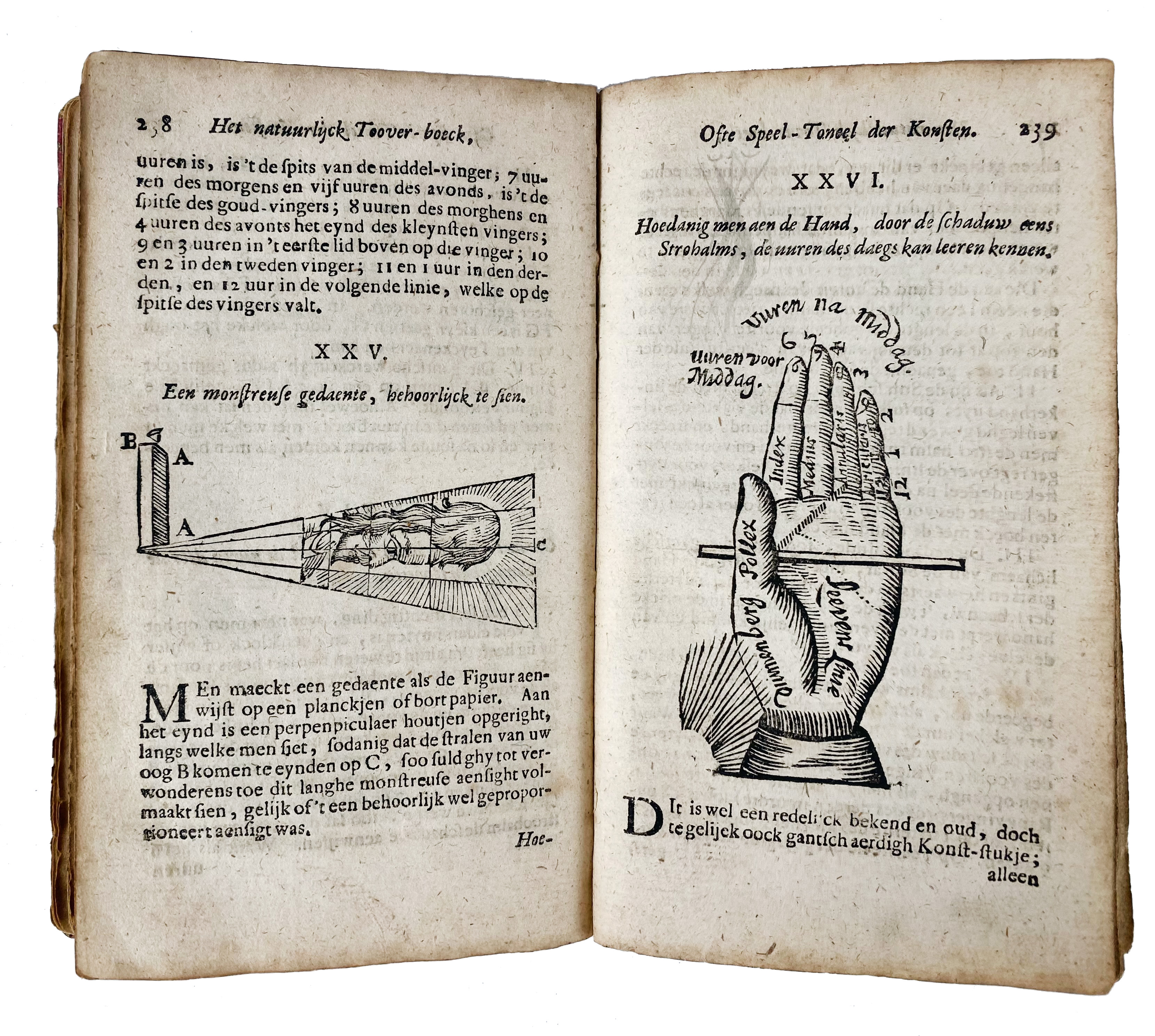 WITGEEST, S. Het natuurlyk tover-boek, of 't nieuw speel-toneel der konsten. Verhandelende over de agt hondert natuurlijke tover-konsten, so uyt de gogel-tas, als kaartspelen, mathematische konsten, en meer andere diergelijke aerdigheden, die tot vermaek en tijtkorting verstrecken. Amst., J. ten Hoorn, 1686. (6), 604, 48 pp. W. num. text-ills. Sm-8°. Cont. h. sheepskin. (Spine rubbed, lower compartment gone, frontispiece lacks, book block a bit shaken, somewhat browned/soiled). -- Added: Id. Natuurlyk toverboek, behelzende de verbaazendste geheimen van natuur en konst. Dl. 1-6. 1791. 6 (of 8) in 3 vols. W. 6 fold. plates. Cont. hcf. (Spines a bit rubbed, paper on sides partly gone, title-p. and 1st leaf vol. 5-6 lacks, 1 plate rep., stained in places). -- (4).