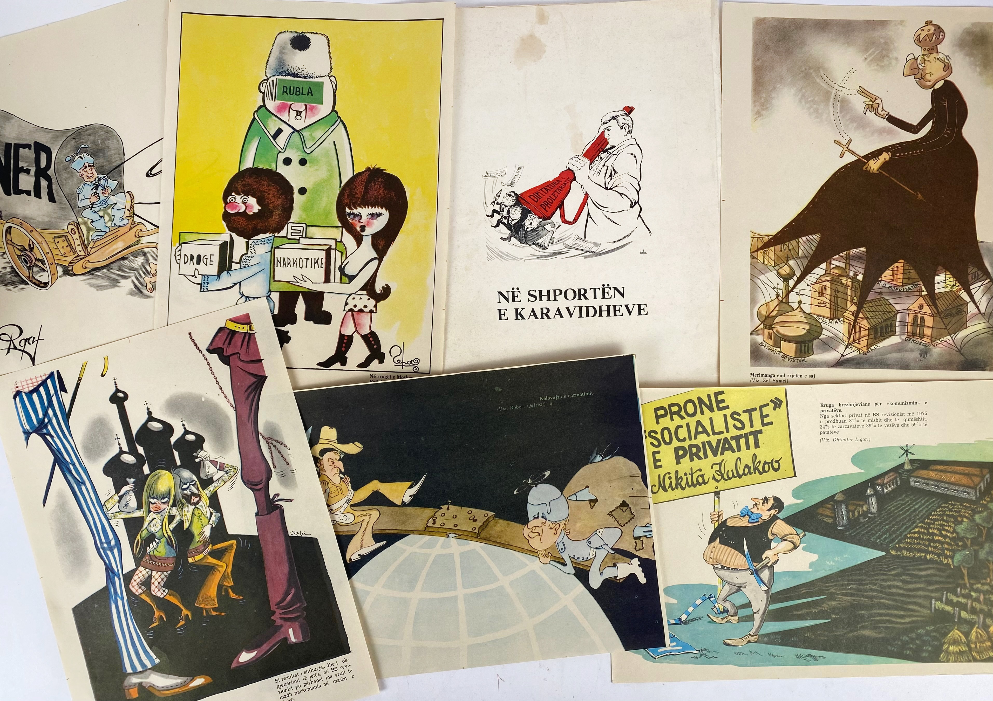 Albanian political satirical plates targeting imperialism, capitalism, revisionism, monarchy, and other perceived ideological enemies of the Albanian state during the late communist era under Enver Hoxha.€ 80