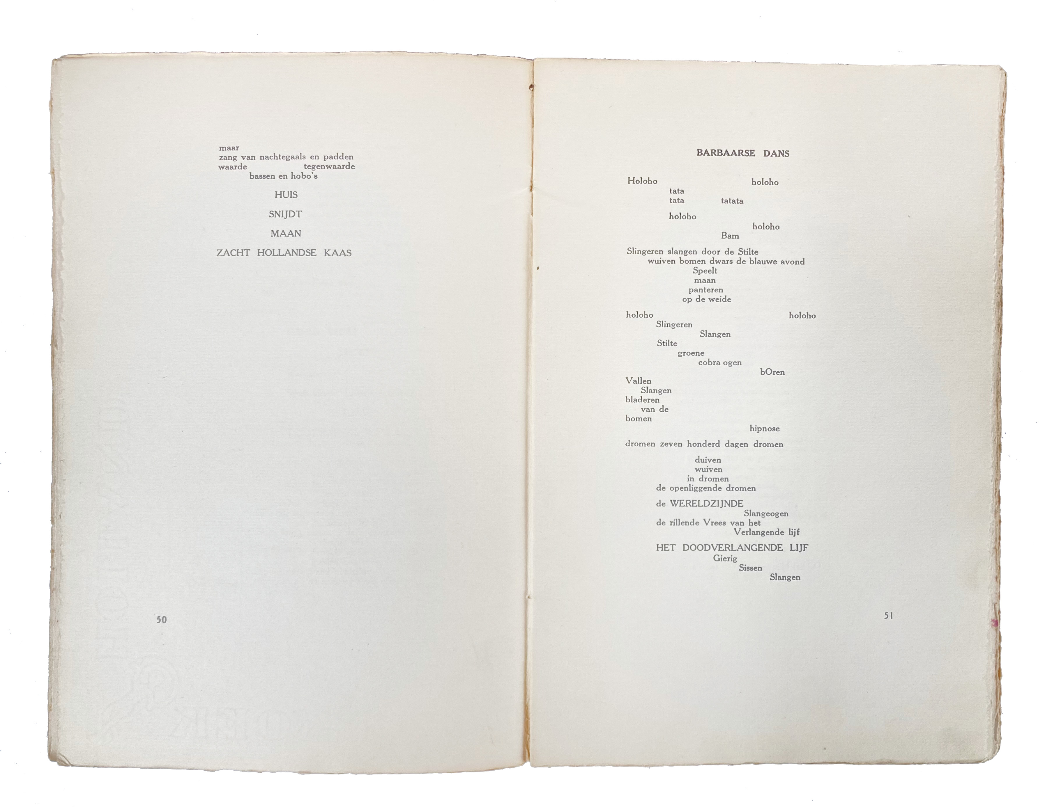 Contains the following works: Music-Hall, Sienjaal, Feesten van angst en pijn, Eerste boek van Schmoll. - Printed in a limited and numbered edition of 525 copies. Our copy one of 20 Roman numbered copies (N° XV) printed on Pannekoek.€ 120