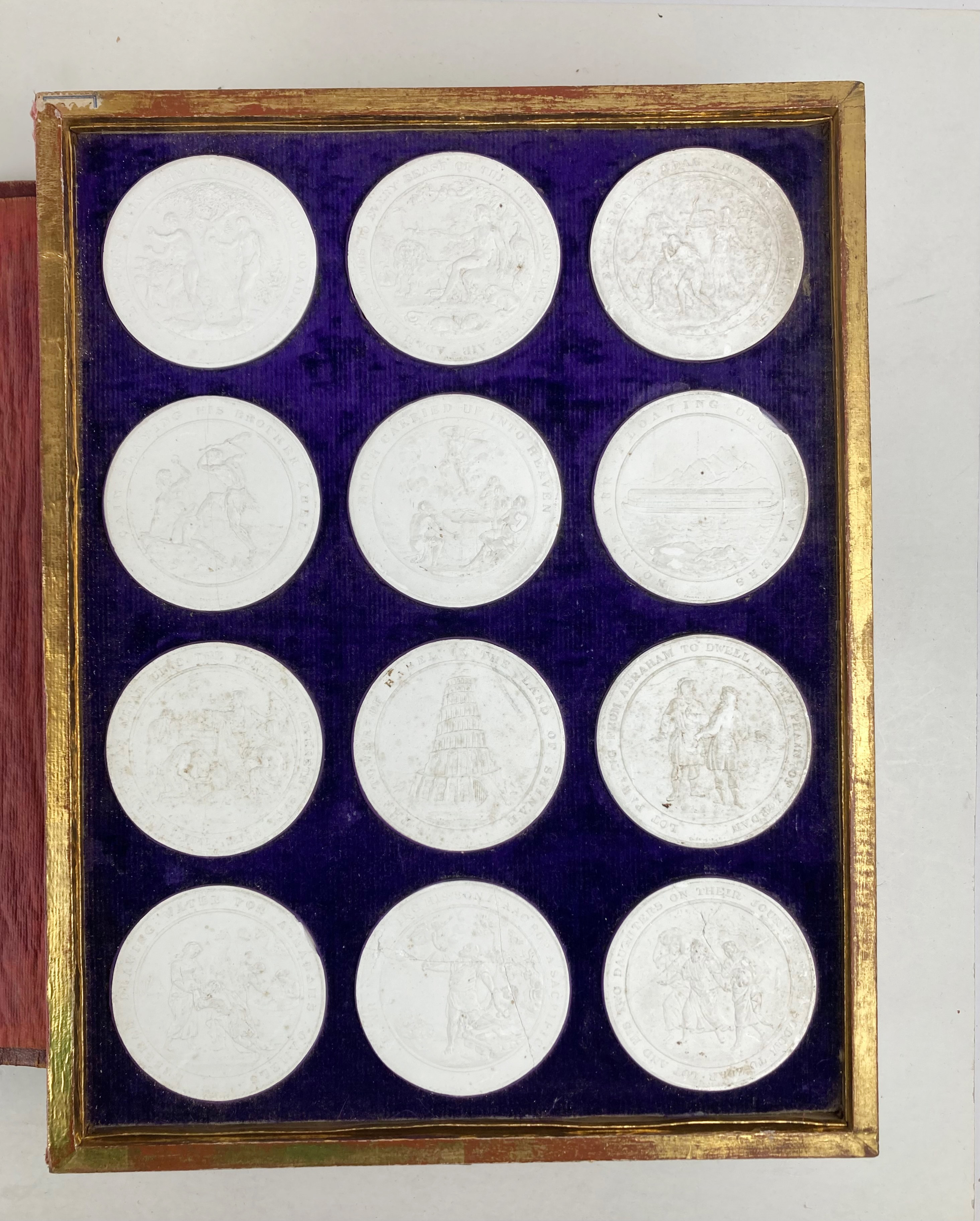 Extremely rare, possibly unique collection of cast gypsum tokens after Sir Edward Thomason's 'Medallic Illustrations of the Holy Scriptures', otherwise known as the Medallic Bible, of 1830. Cf. Catalogus der bibliotheek van het museum Willet-Holthuysen, Amst., 1896, p. 172, Y3, otherwise no other copies traced (no copies in the Nationale Numismatische Collectie).