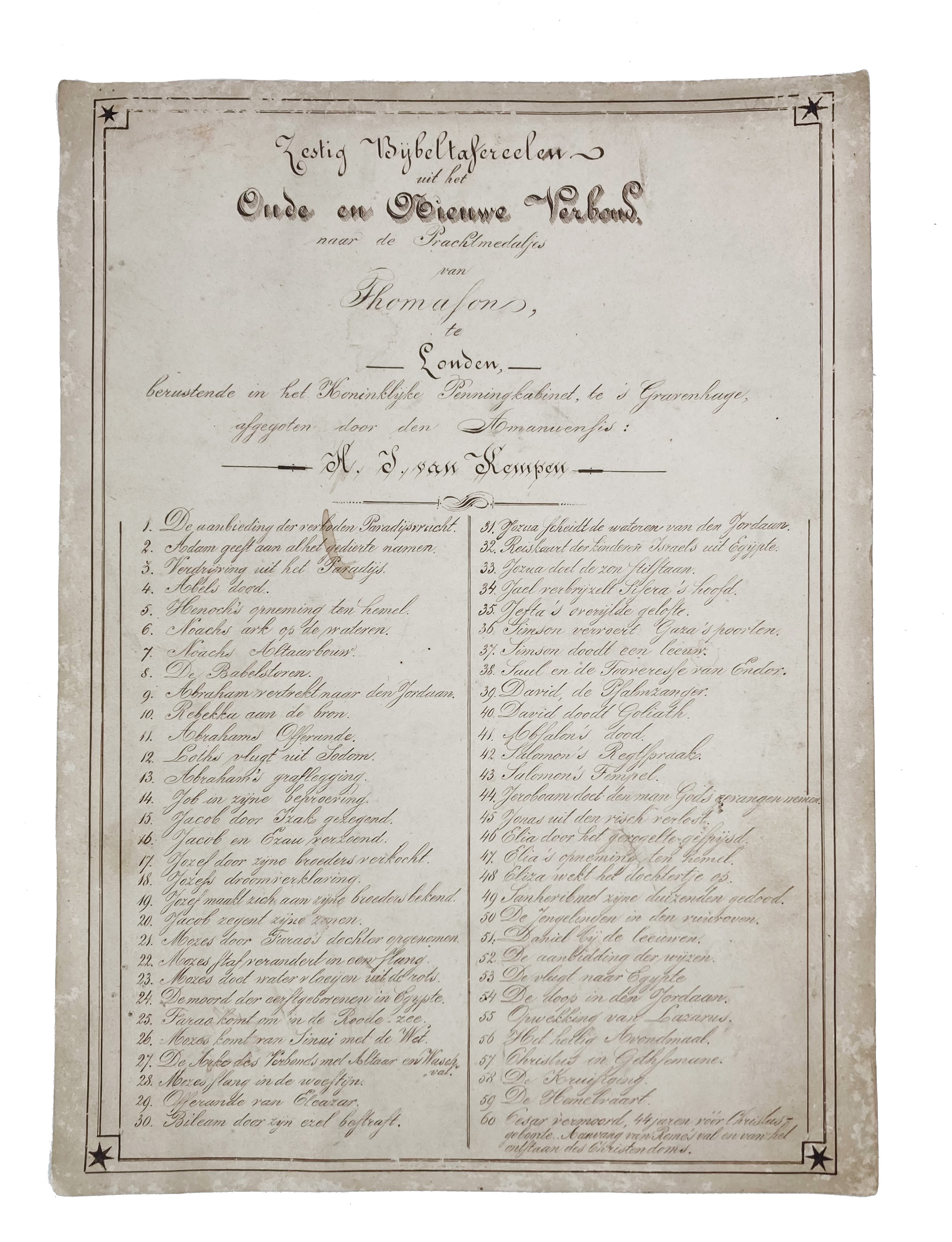 ZESTIG BIJBELTAFEREELEN uit het Oude en Nieuwe Verbond naar de Prachtmedaljes van Thomason, te Londen, berustende in het Koninklijke Penningkabinet, te 's Gravenhage, afgegoten door den Amanuensis H.J. van Kempen. (The Hague), n.d. (ca. 1880). Sixty plaster cast tokens (70 mm diameter) w. handwritten index. Mounted in 5 series of 12 in book-shaped box (370 x 280 x 110 mm). Or. red mor. w. gilt lettering, brass clasps representing Aaron & Moses, 5 gilt frames w. purple corduroy covering, bound together w. red cl. (Wear to extremities, clasps loose but present, lowest frame loose, some medals slightly damaged or cracked, not inspected out of frames).