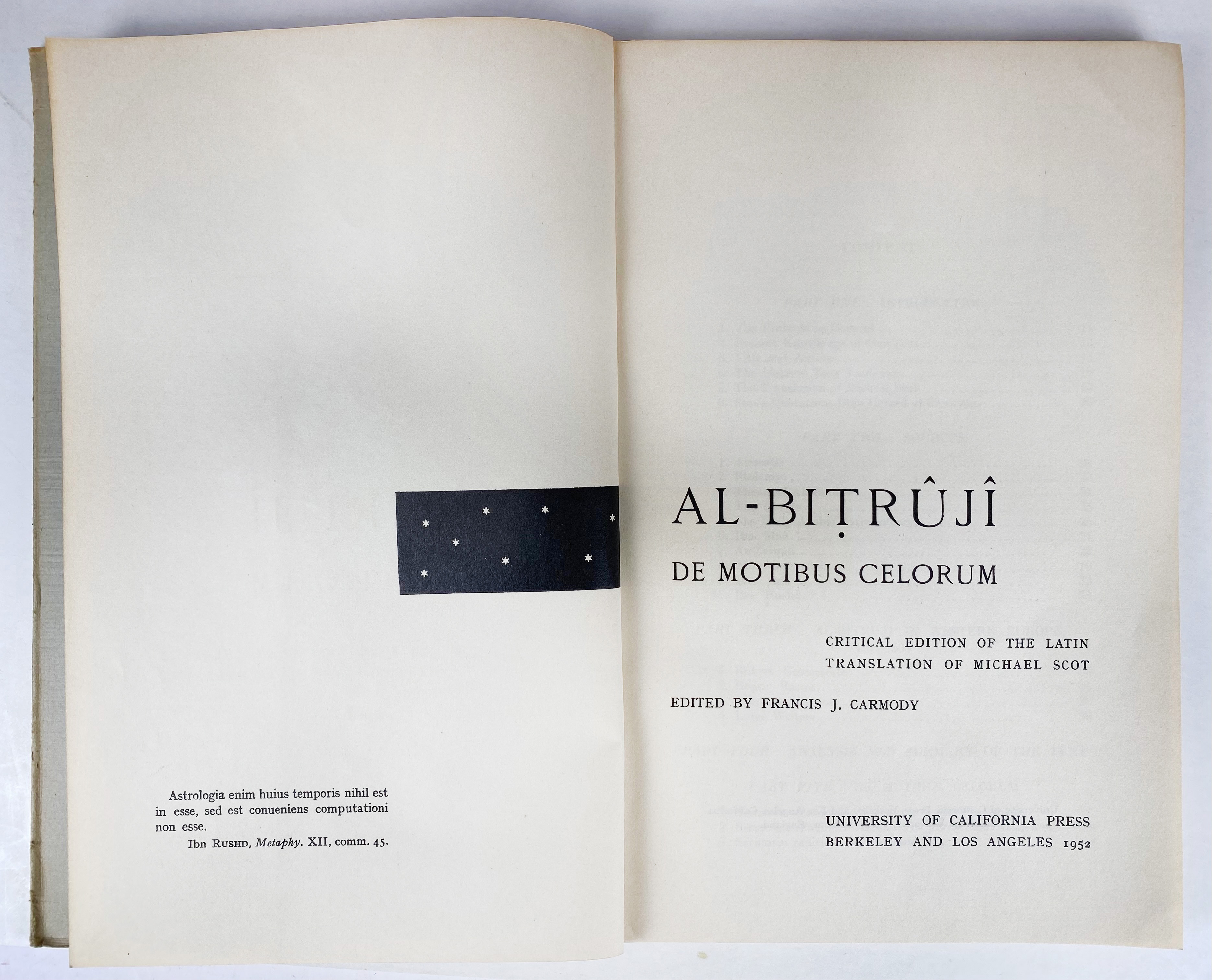 ASTRONOMY -- AL-BITRÛJÎ. De motibus celorum. Crit. ed. of the Latin transl. of M. Scot. Ed. by F.J. Carmody. 1952. Owrps. (Spine ends sl. worn, wrps. partly browned). Rare. -- PTOLEMAEUS. Almagest. Transl. & annot. by G.J. Toomer. (1984). Lge-8°. Ocl. -- O. PEDERSEN. A survey of the Almagest. 1974. Lge-8°. Ocl. (Back cover stained). -- And 1 o. (4).