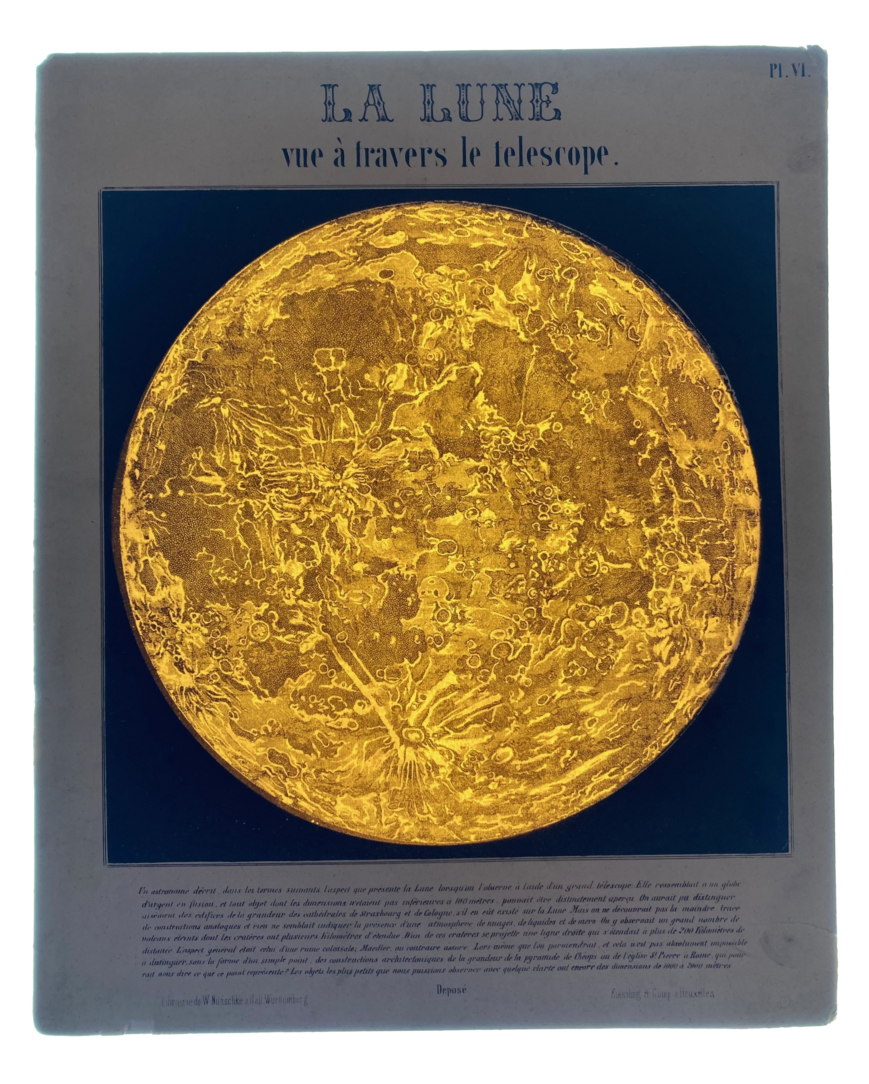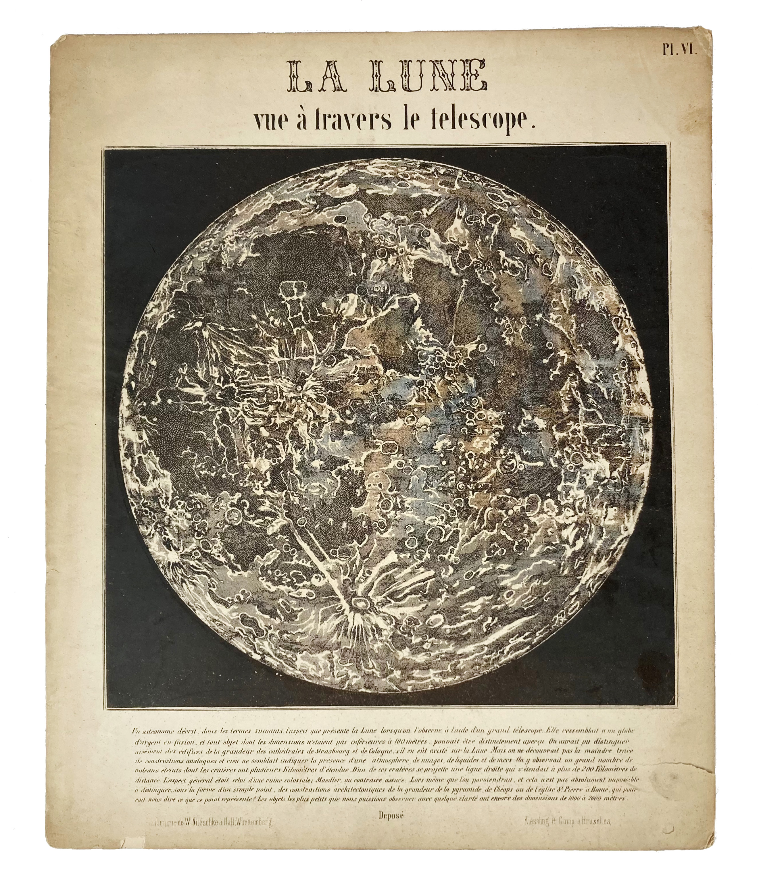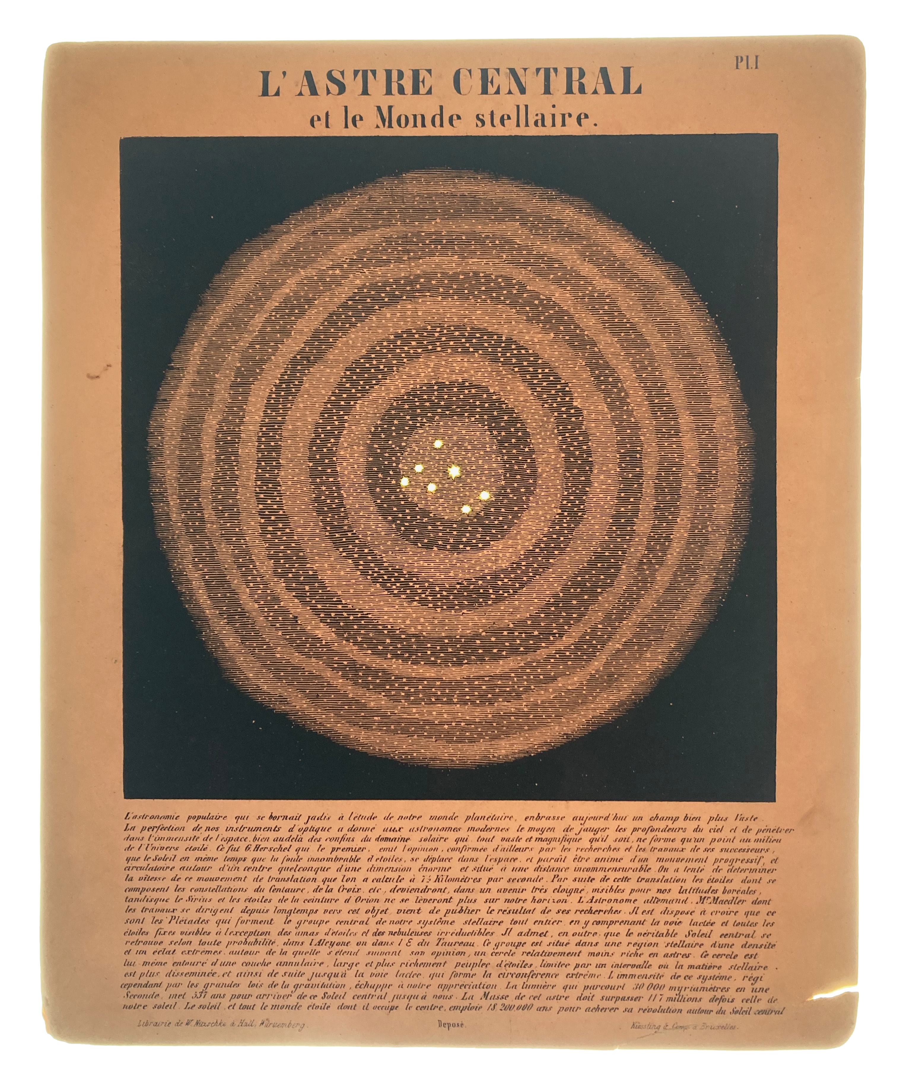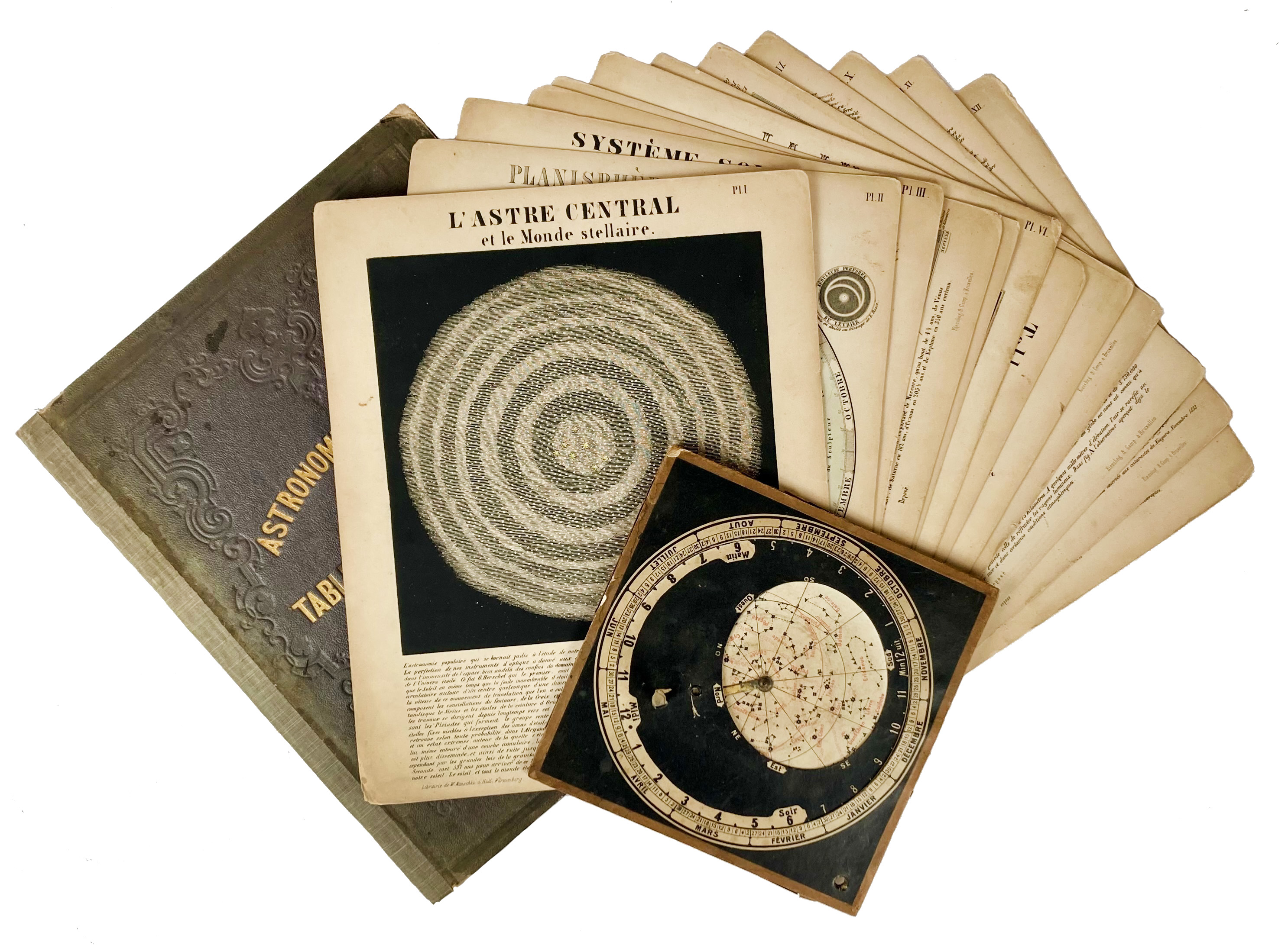 ASTRONOMY -- ASTRONOMIE POPULAIRE en tableaux transparents. Brussels, Kiessling & Cie. Libraires, (n.d., ±1850). W. 12 hand-coloured engraved plates on stiff card, six of which incorporate transparencies. Lge-4°. In or. portfolio, blindstamped w. gold lettering, w. ties. (Spine of portfolio reinforced w. tape, a few transparencies on plates III and VII torn). -- Added: NOUVELLE CARTE CÉLESTE rotatoire a l'usage des ecoles. Brux.?, n.d. (2nd half of the 19th c.). Card w. paper starred sky & volvelle w. tie, showing the constellations on the Northern hemisphere at any given date of the year. Explanatory text on v°. 180 x 180 mm. (Upper paper detaching in places, ticket pasted on, mechanism firm).