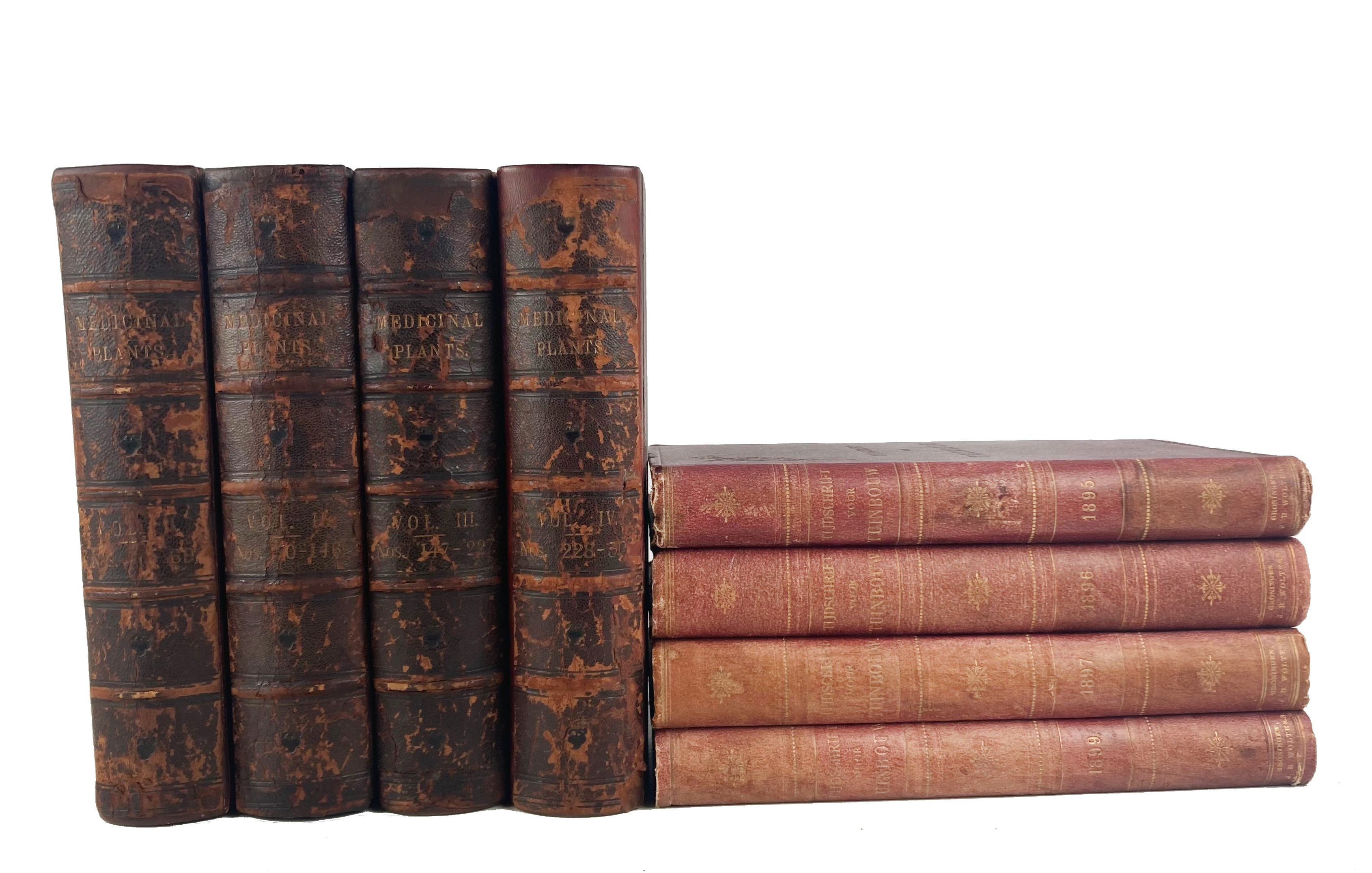 BOTANY -- BENTLEY, R. & H. TRIMEN. Medicinal plants being descriptions with original figures of the principal plants employed in medicine. Lond., 1880. 4 vols. W. 298 (of 306) beautifully cold. plates. Cont. mor., all edges red. (Binds. skilfully & unobtrusively restored, wear to corners, some endpapers replaced, inside however clean & colours splendidly preserved). -- And 4 o. (8).